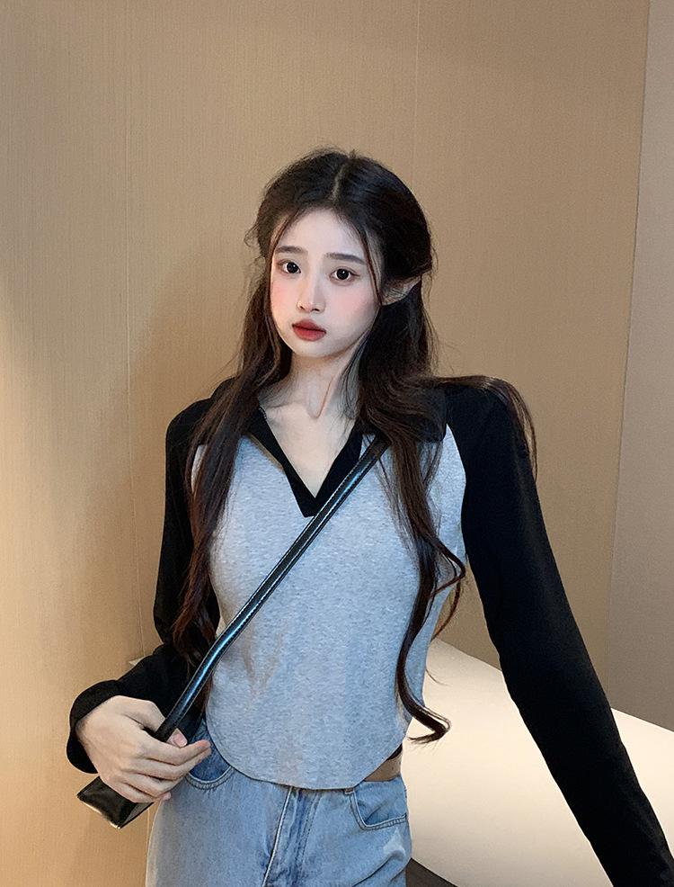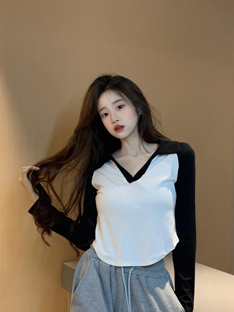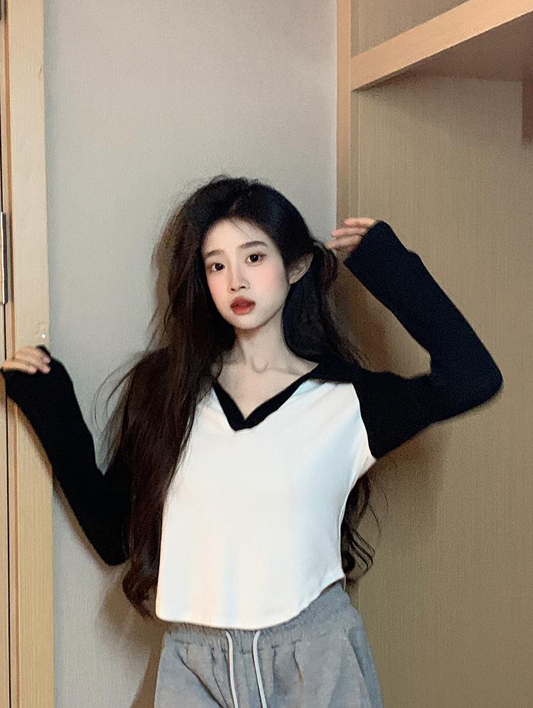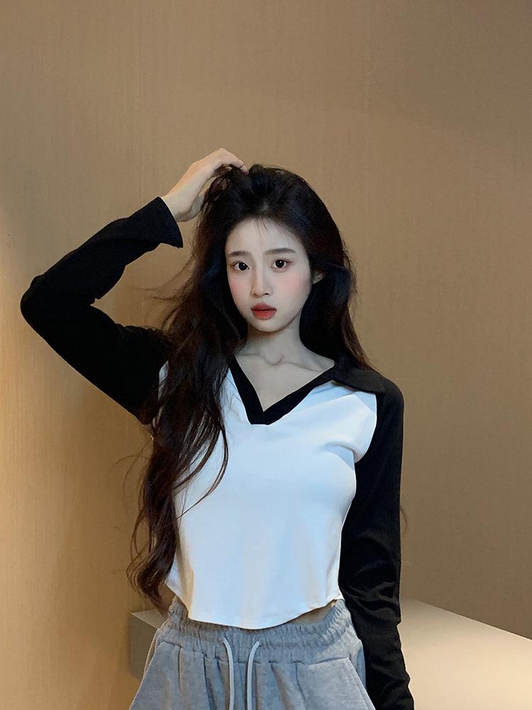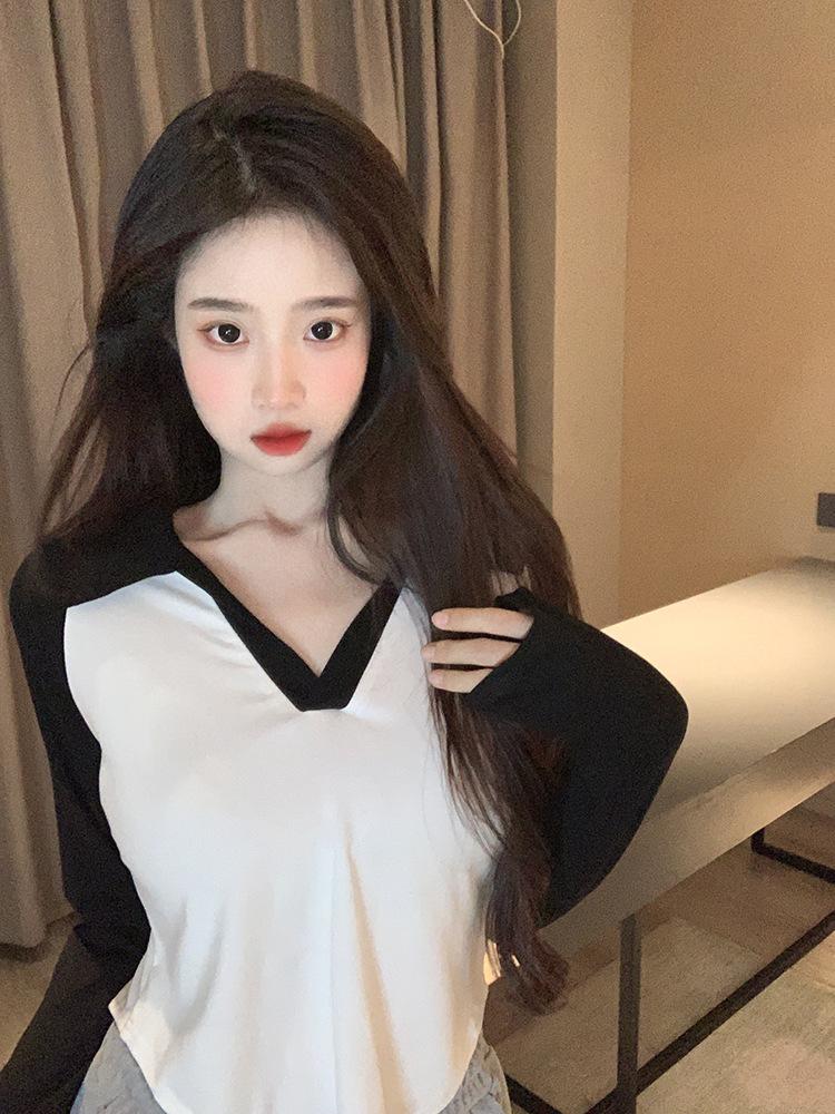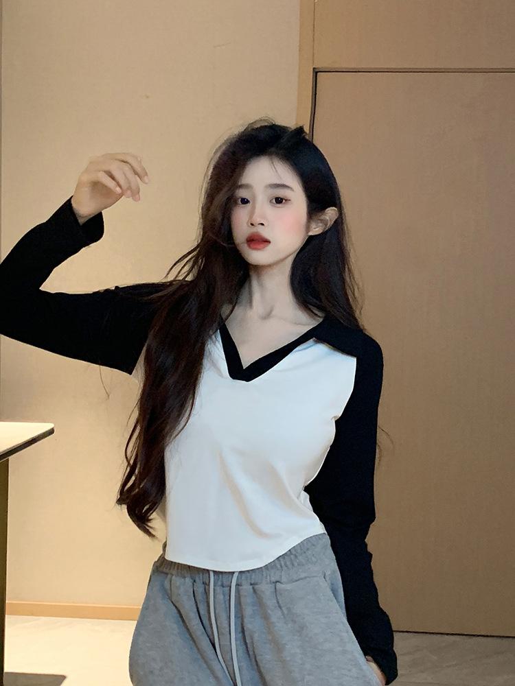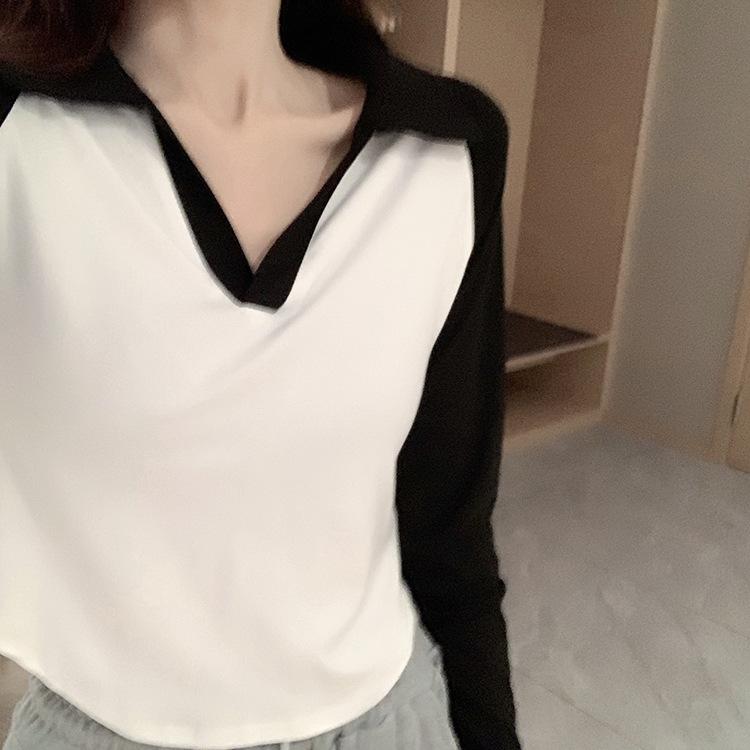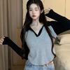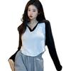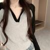 Playera de manga larga para mujer Otoño Nuevo estilo coreano estilo preppy color en contraste top nicho para niña ajuste ceñido versátil cuello en V camisa básica moda