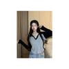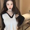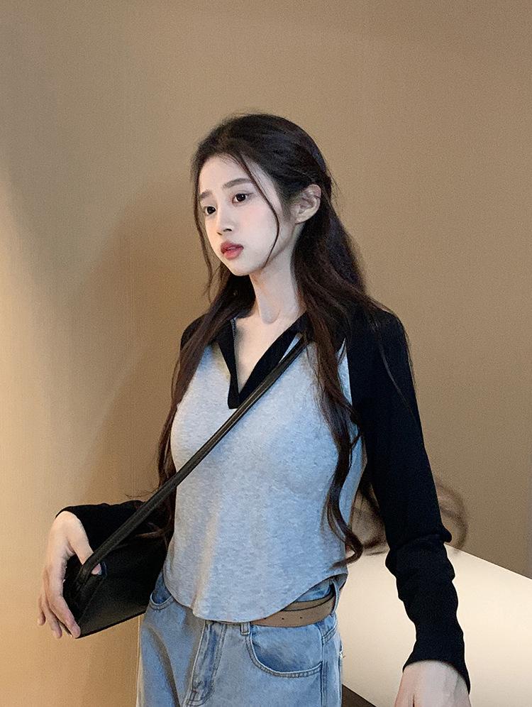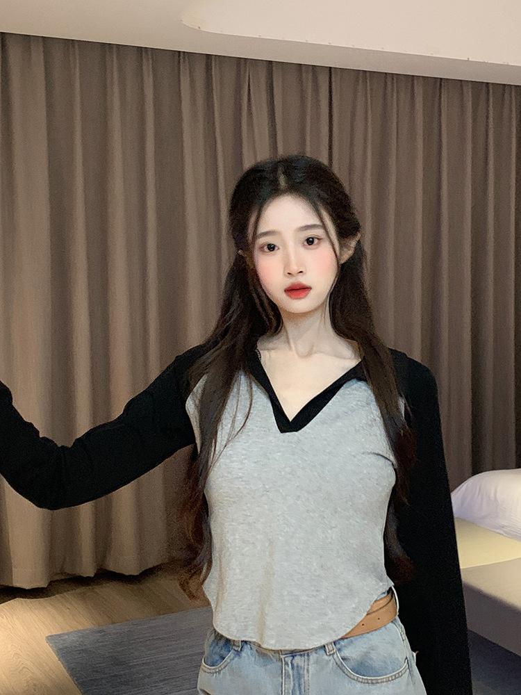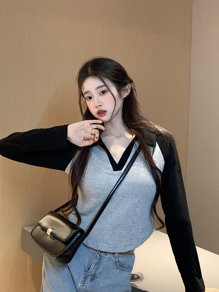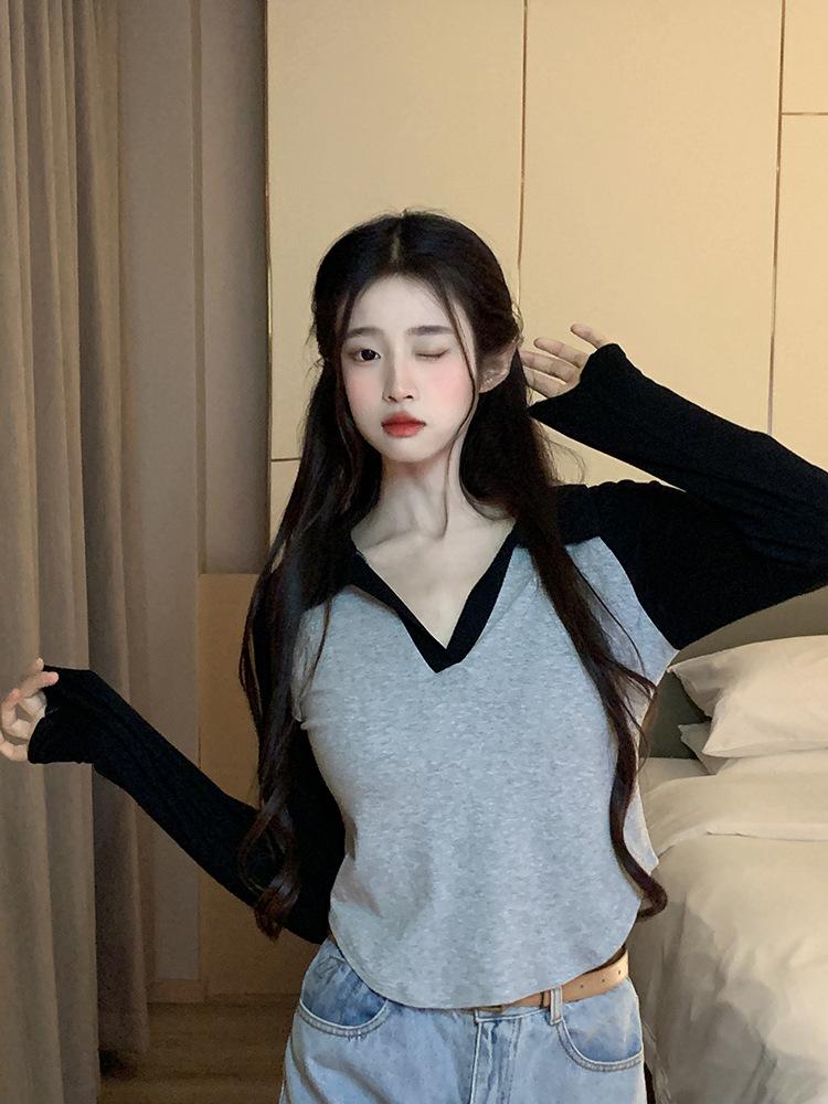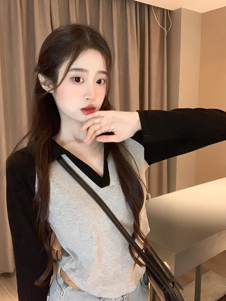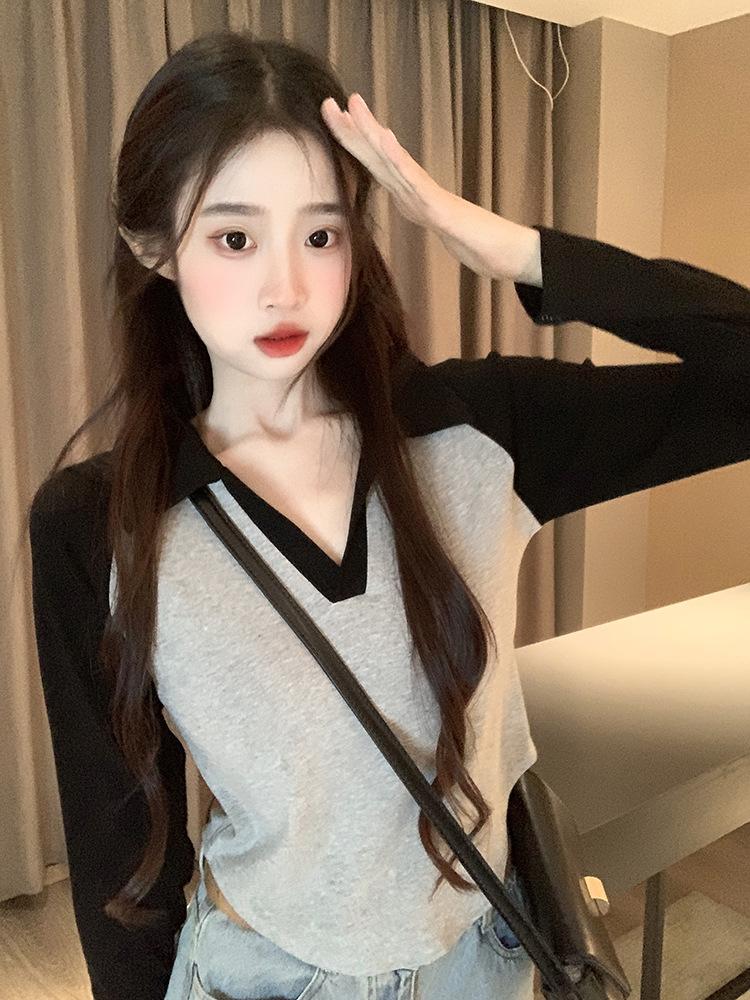 Playera de manga larga para mujer Otoño Nuevo estilo coreano estilo preppy color en contraste top nicho para niña ajuste ceñido versátil cuello en V camisa básica moda