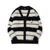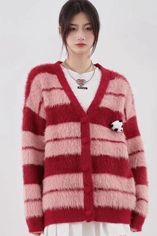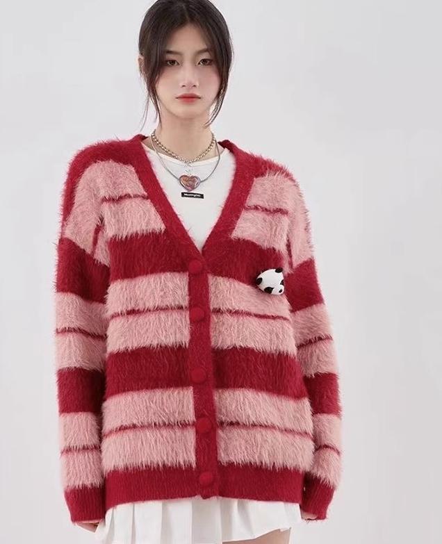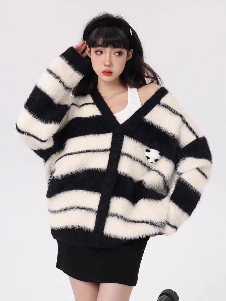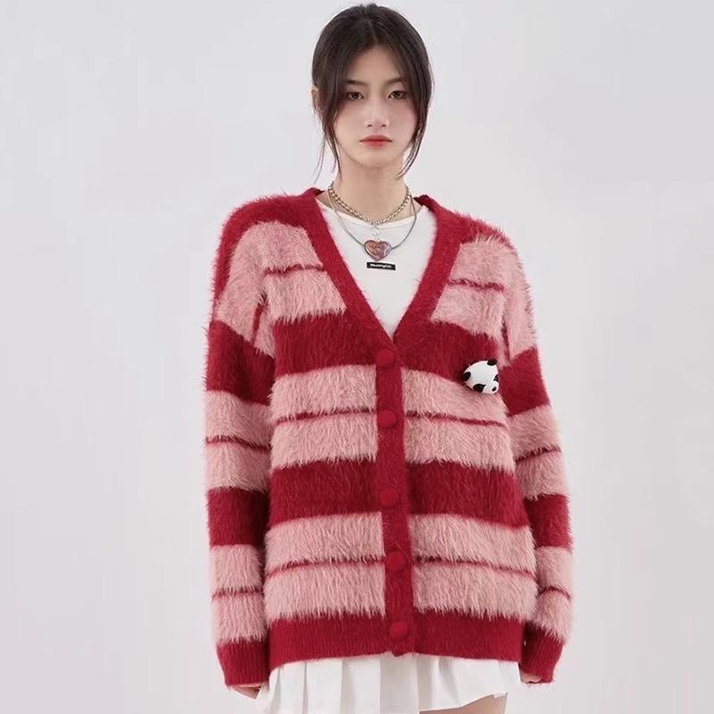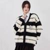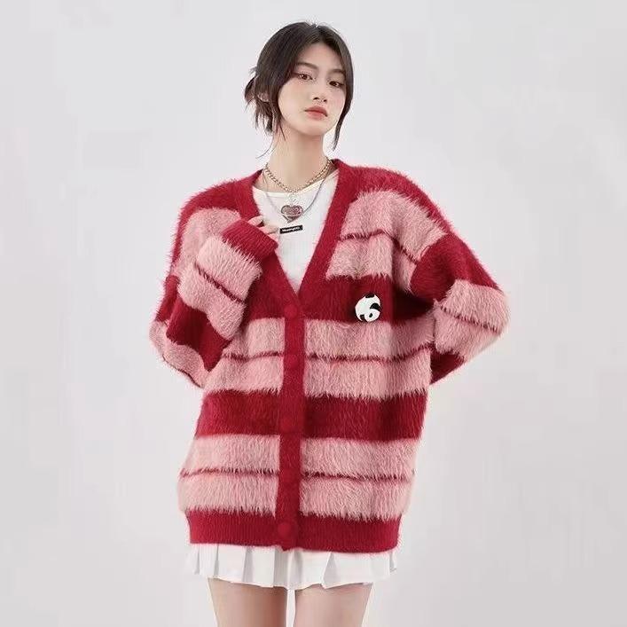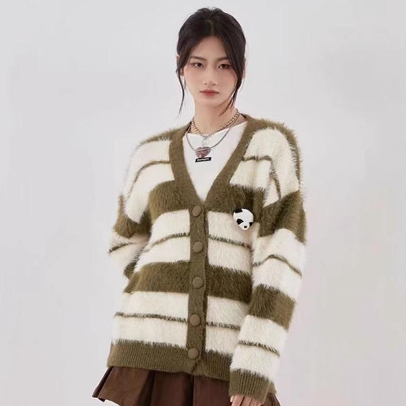 Cárdigan Suéter Abrigo de Punto de Terciopelo Visón Imitación para Mujer Otoño e Invierno Nuevo Holgado Retro Cuello en V Manga Larga Top a Rayas