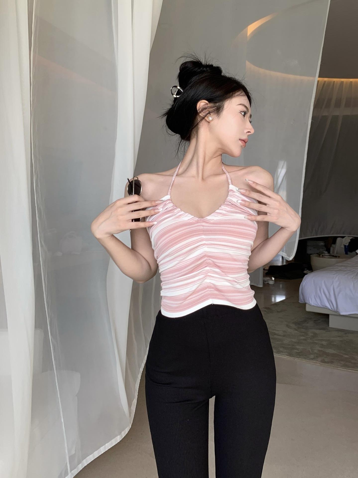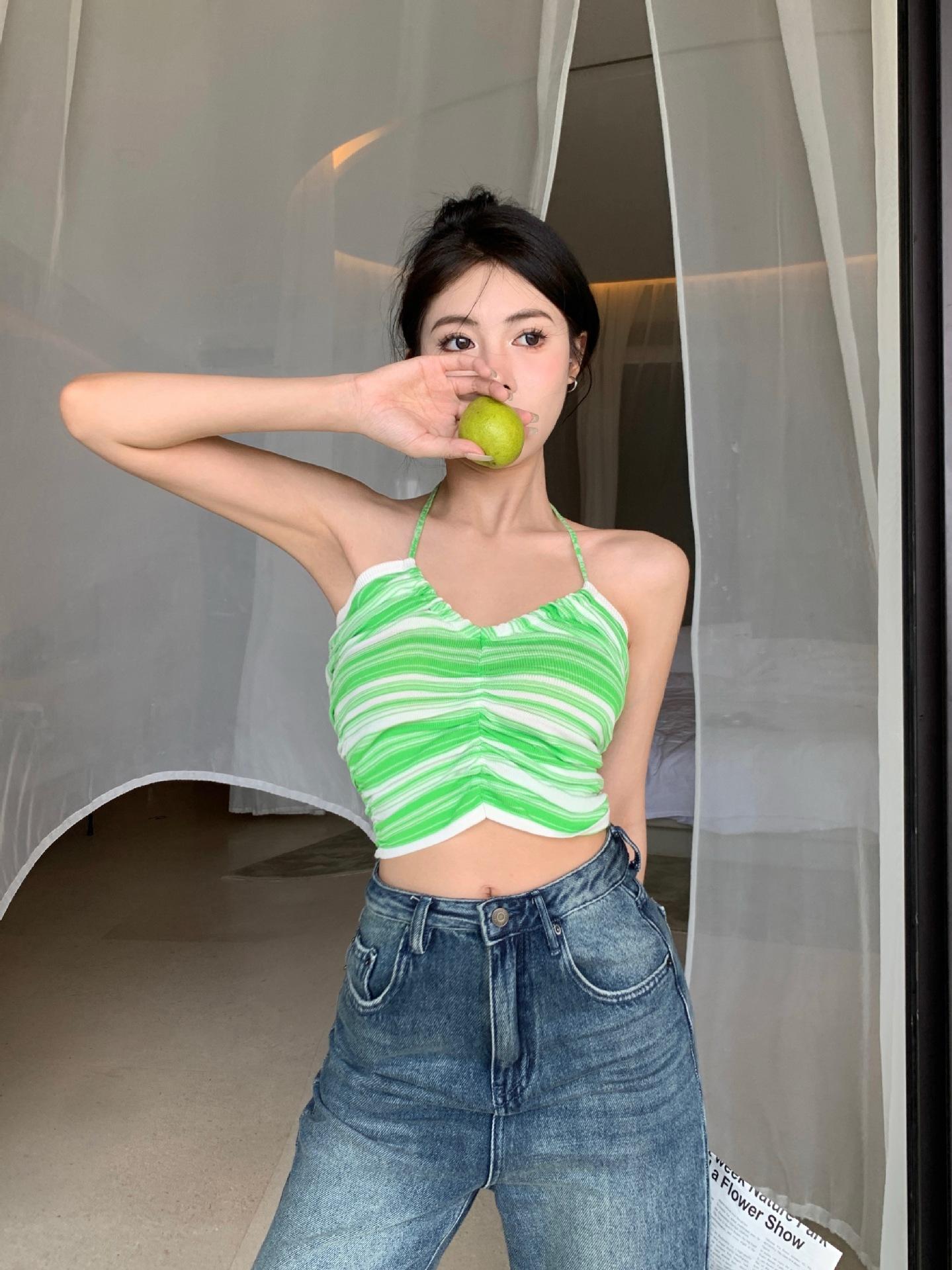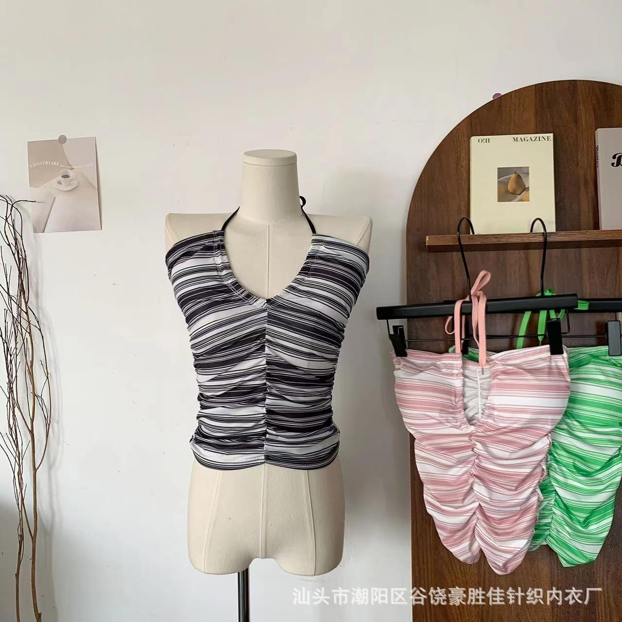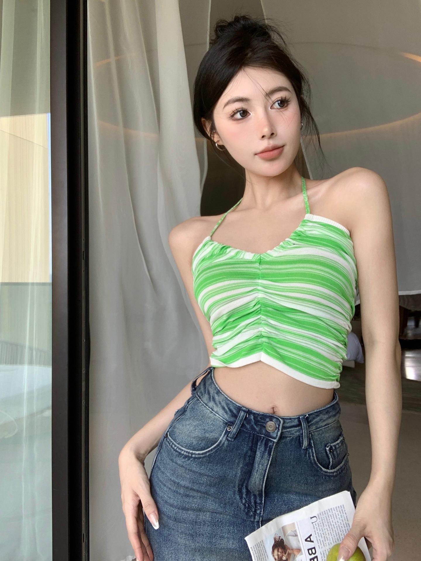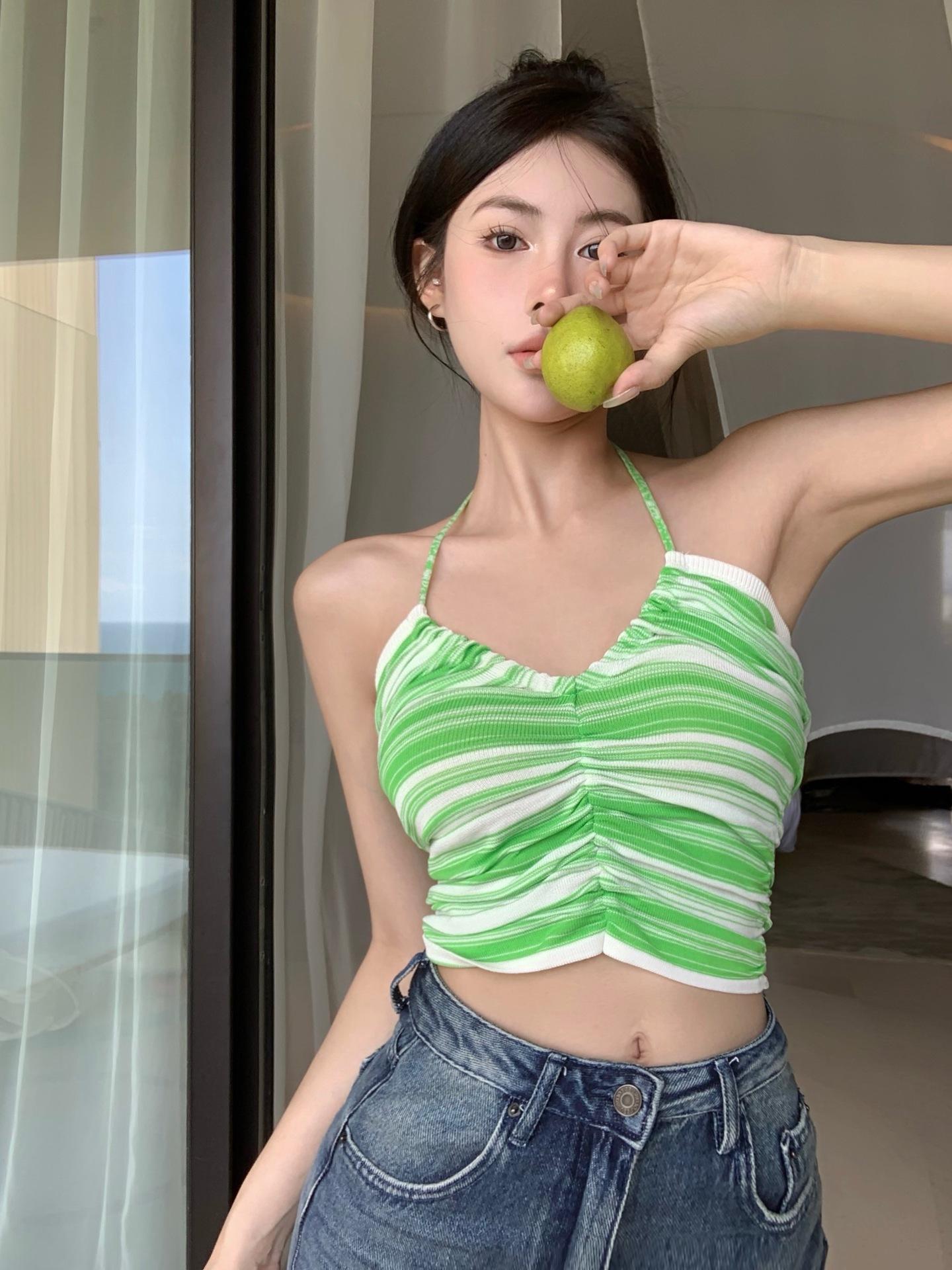 Camisola sexy con cuello halter para mujer de Spice Girls, estilo francés corto, elegante, a rayas, hermosa espalda, exterior, top puro para el verano