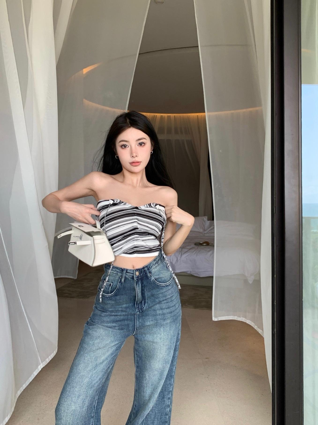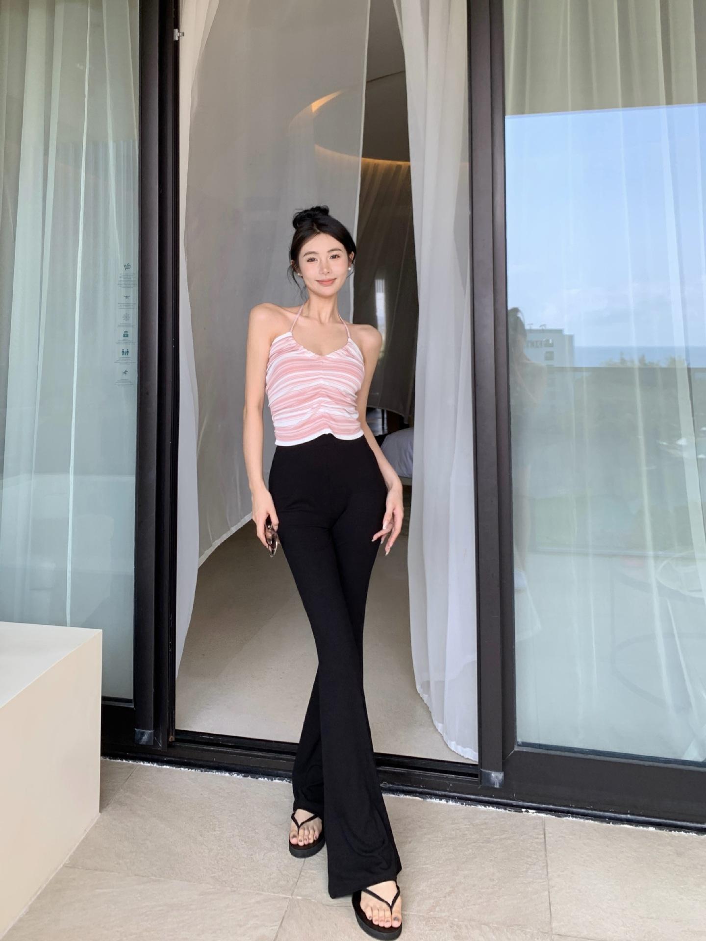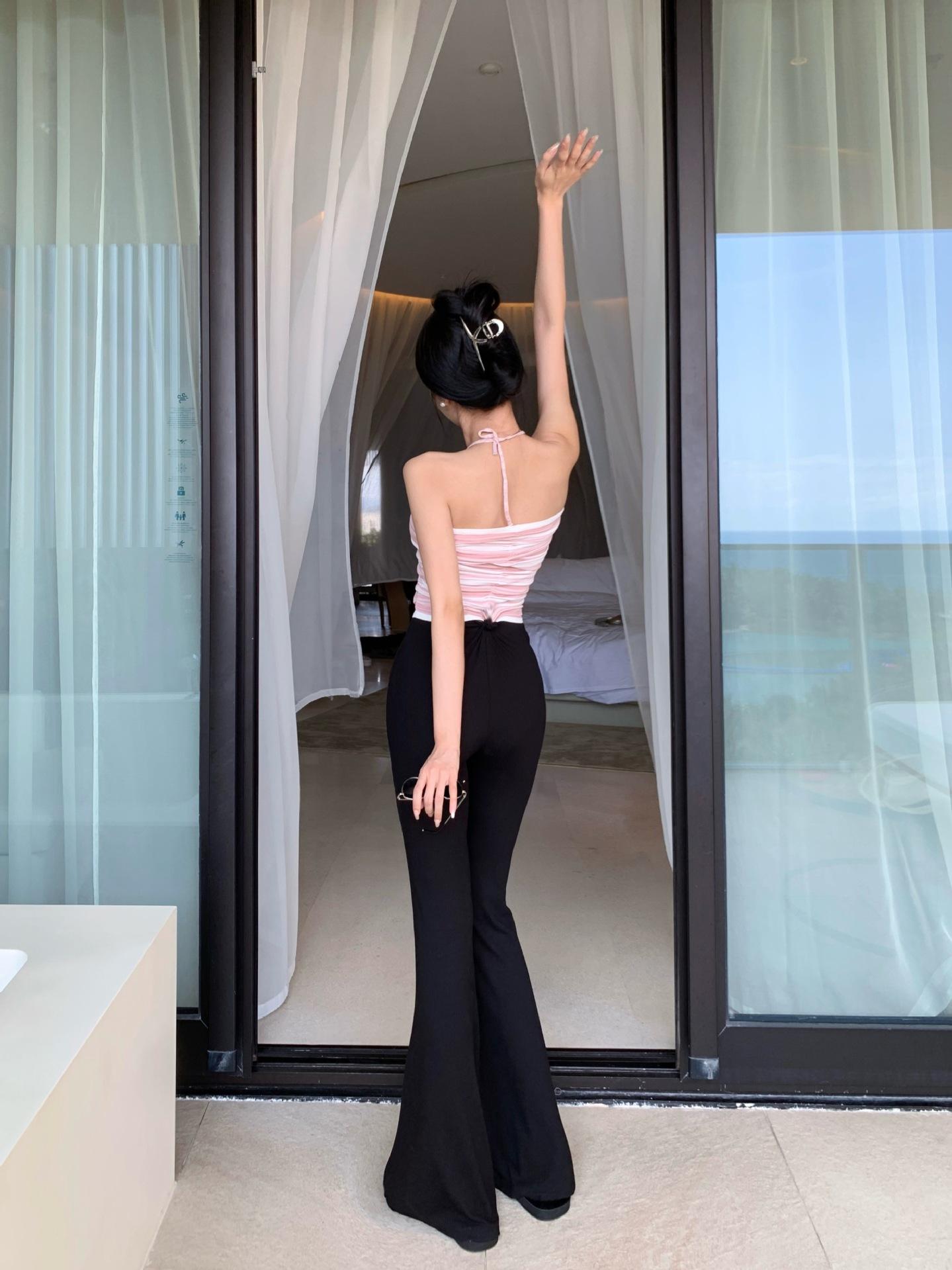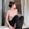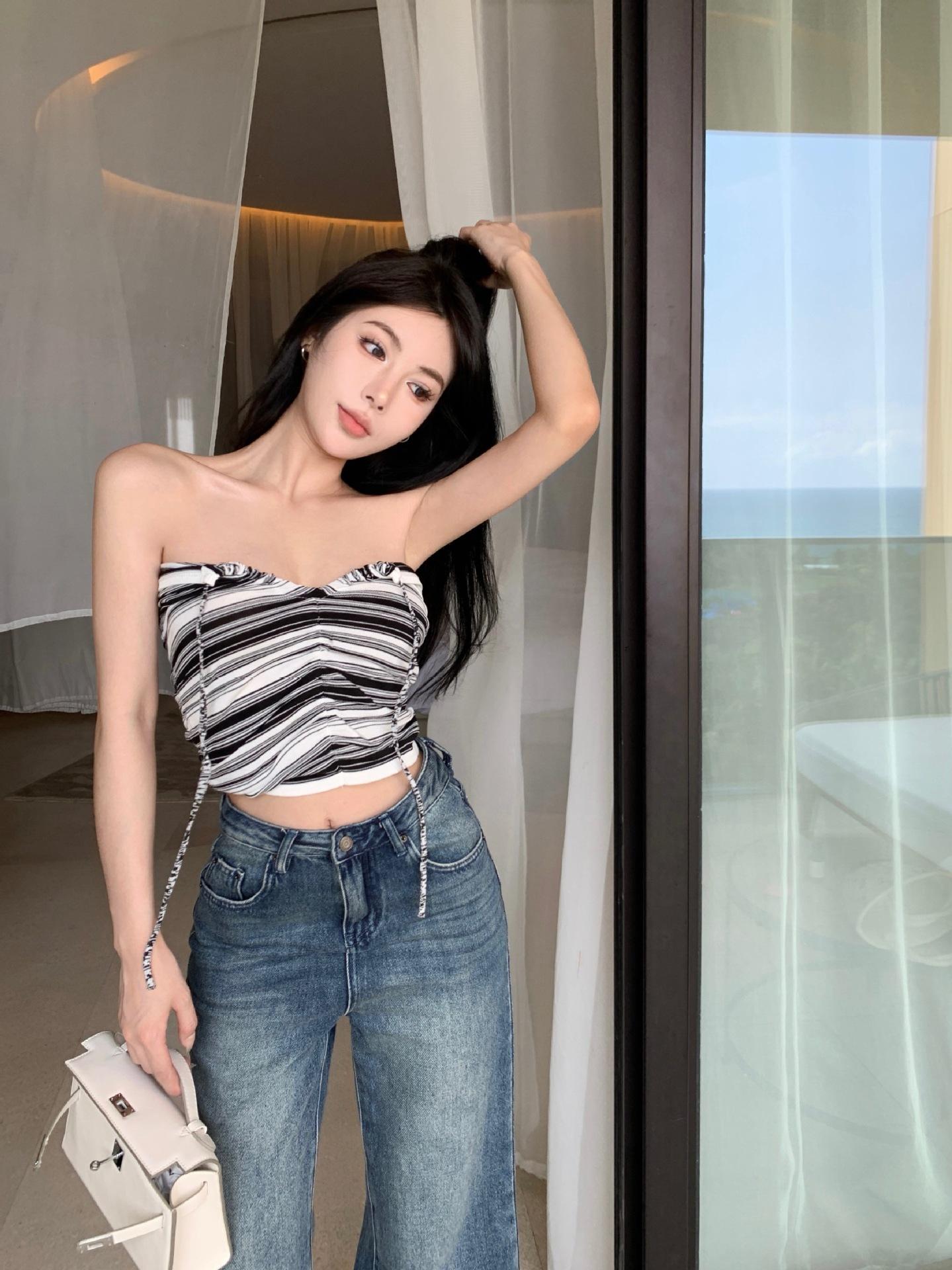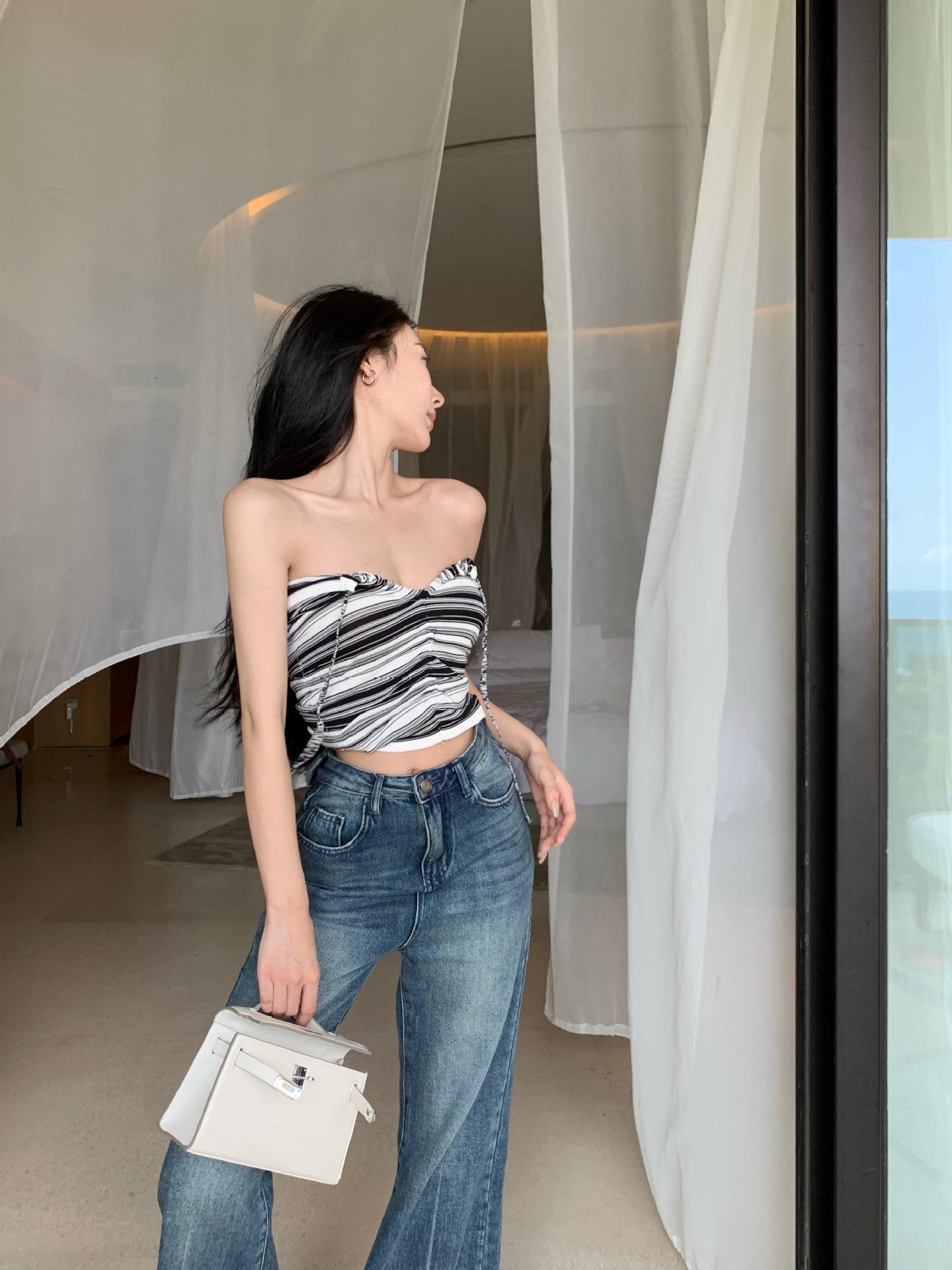 Camisola sexy con cuello halter para mujer de Spice Girls, estilo francés corto, elegante, a rayas, hermosa espalda, exterior, top puro para el verano