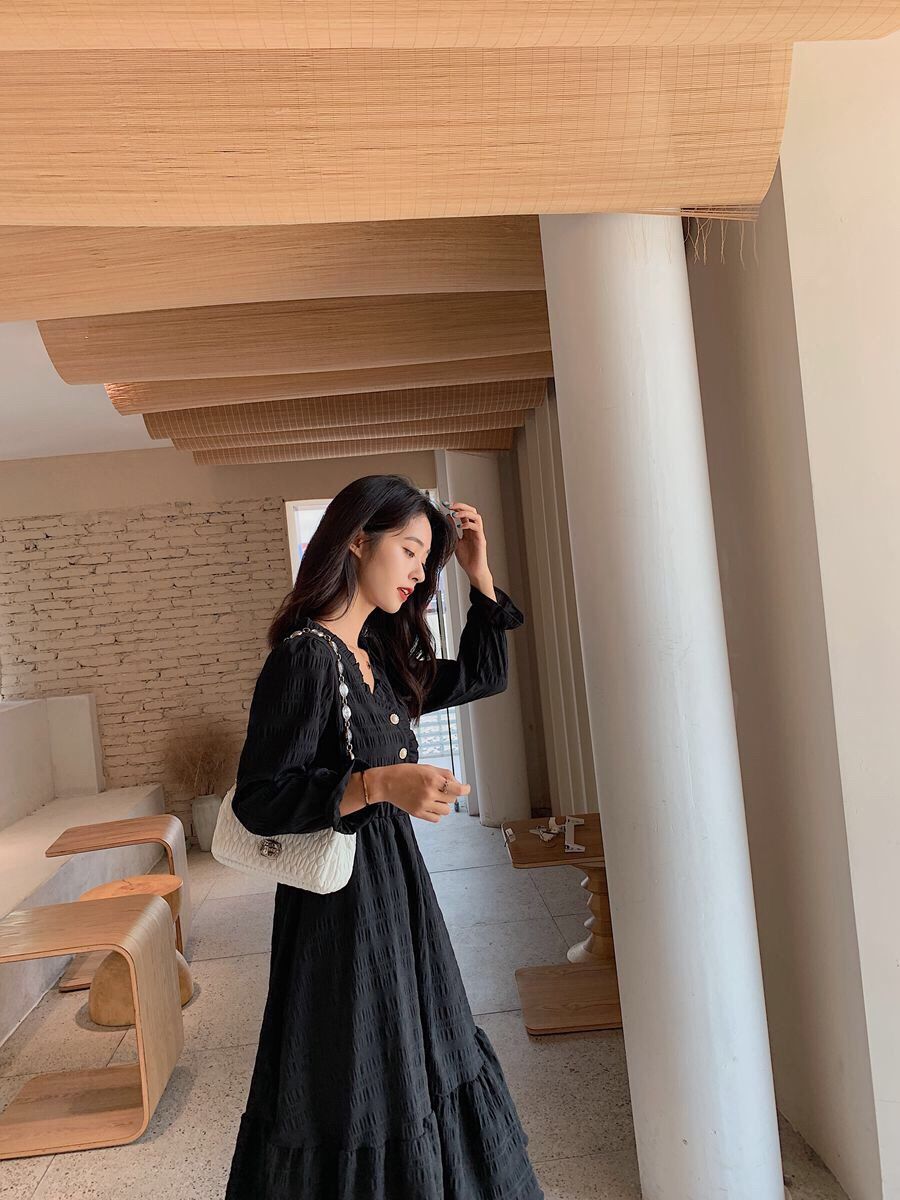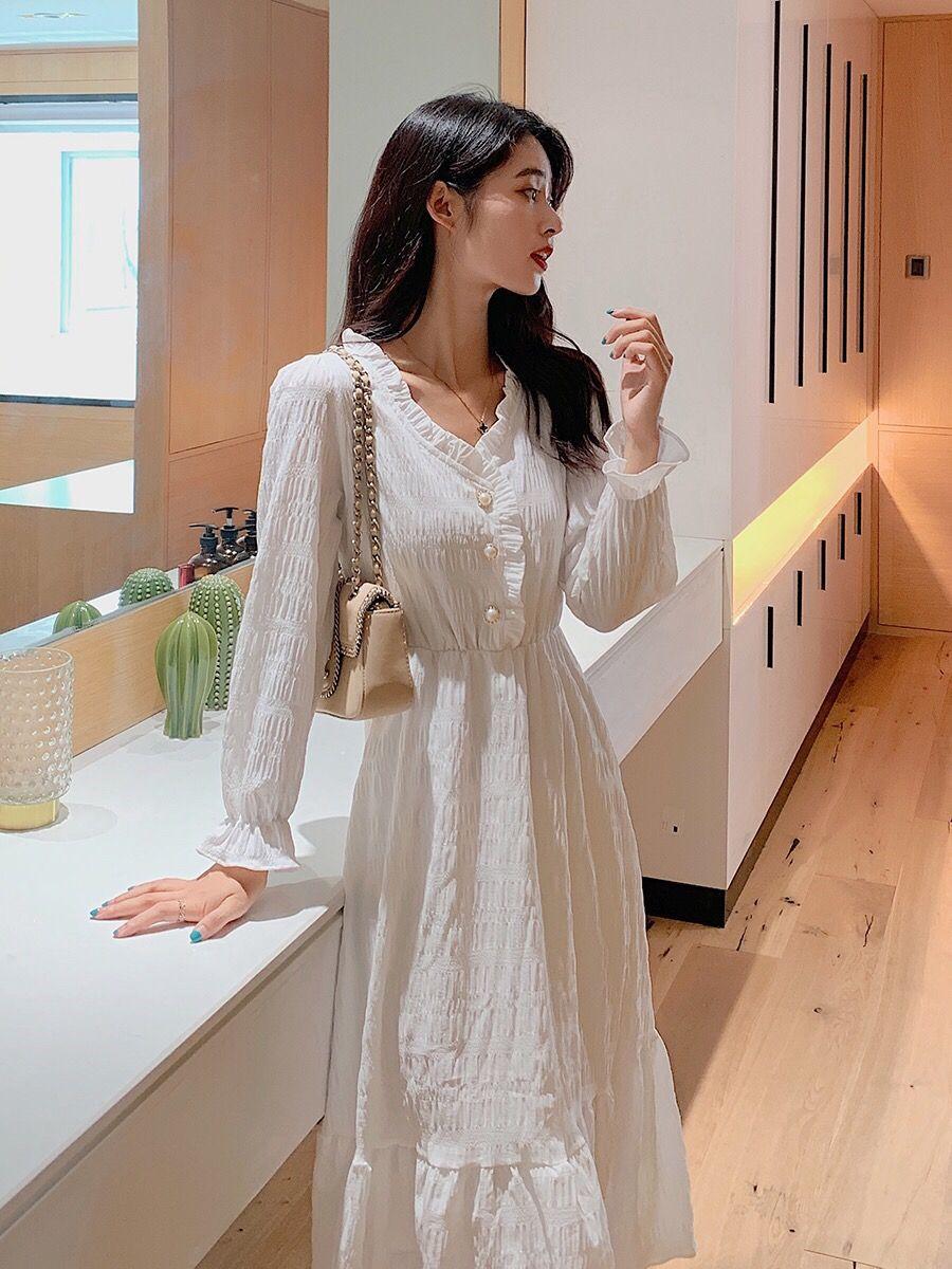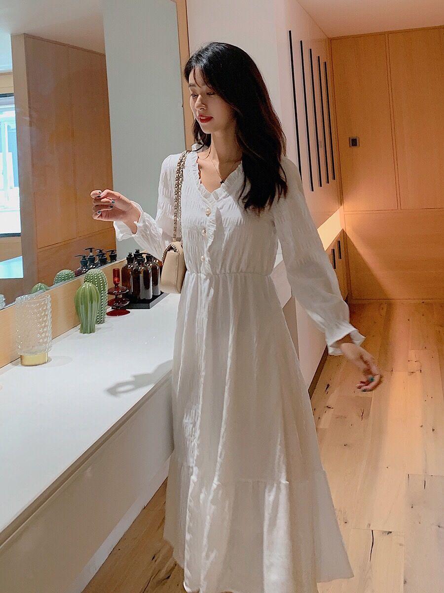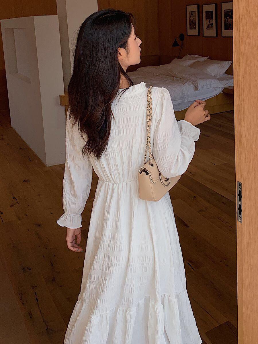 2025 Nuevo Vestido Estilo Hepburn Blanco Francés Falda Manga Larga para Mujer Adelgazante de Cintura Largo Medio Falda de Hada