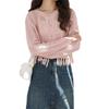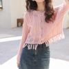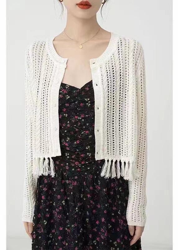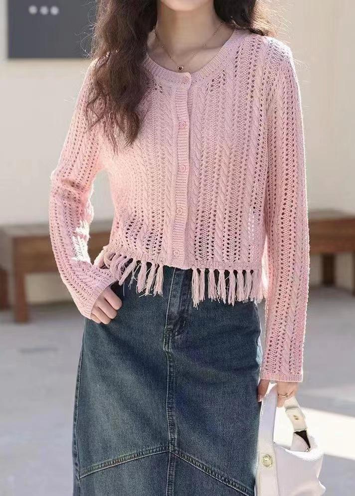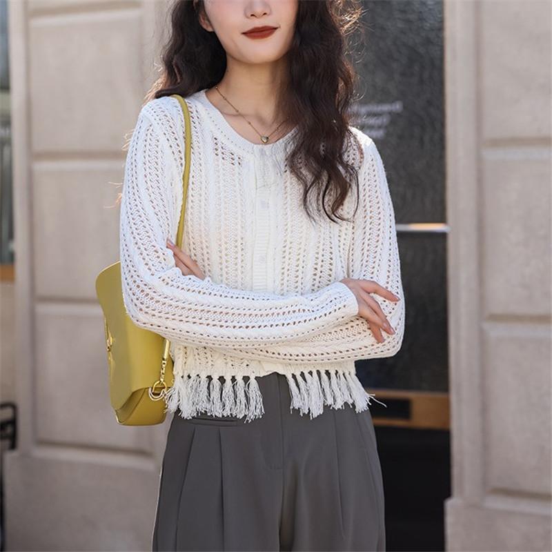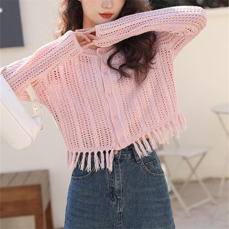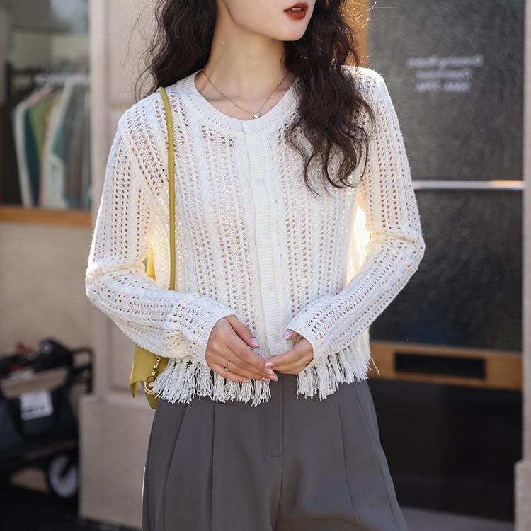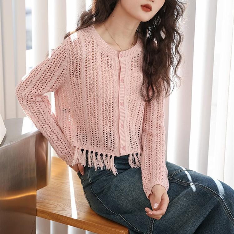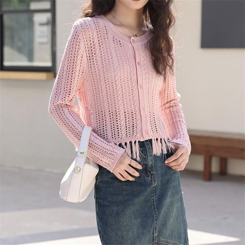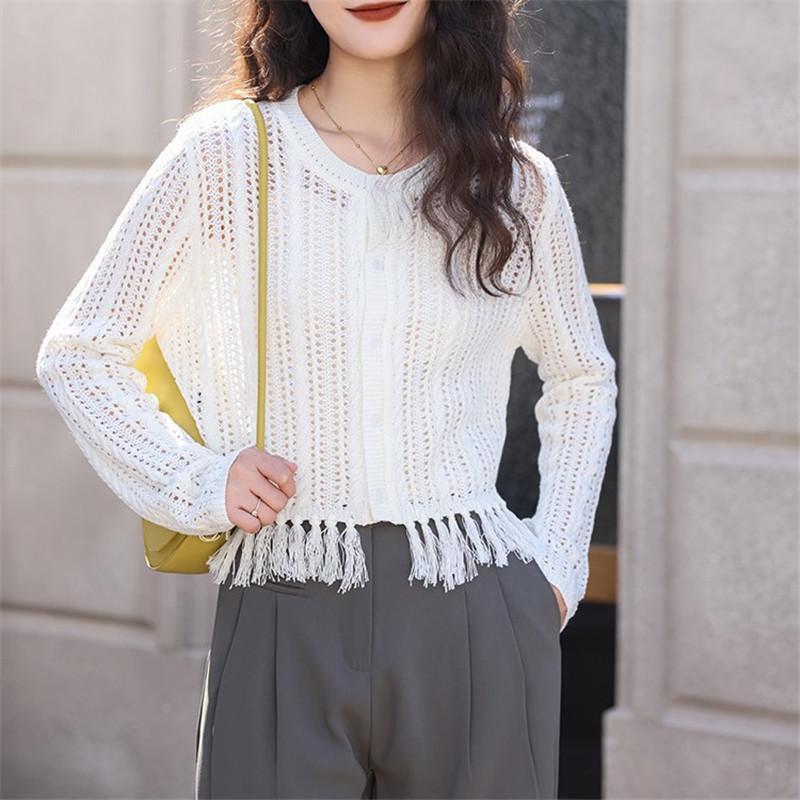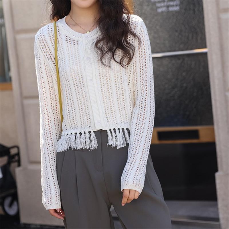 Cárdigan de Punto de Cuello Redondo Estilo Coreano para Mujer 2025 Primavera Nuevo Diseño de Moda Flecos Calados Manga Larga Top Protección Solar