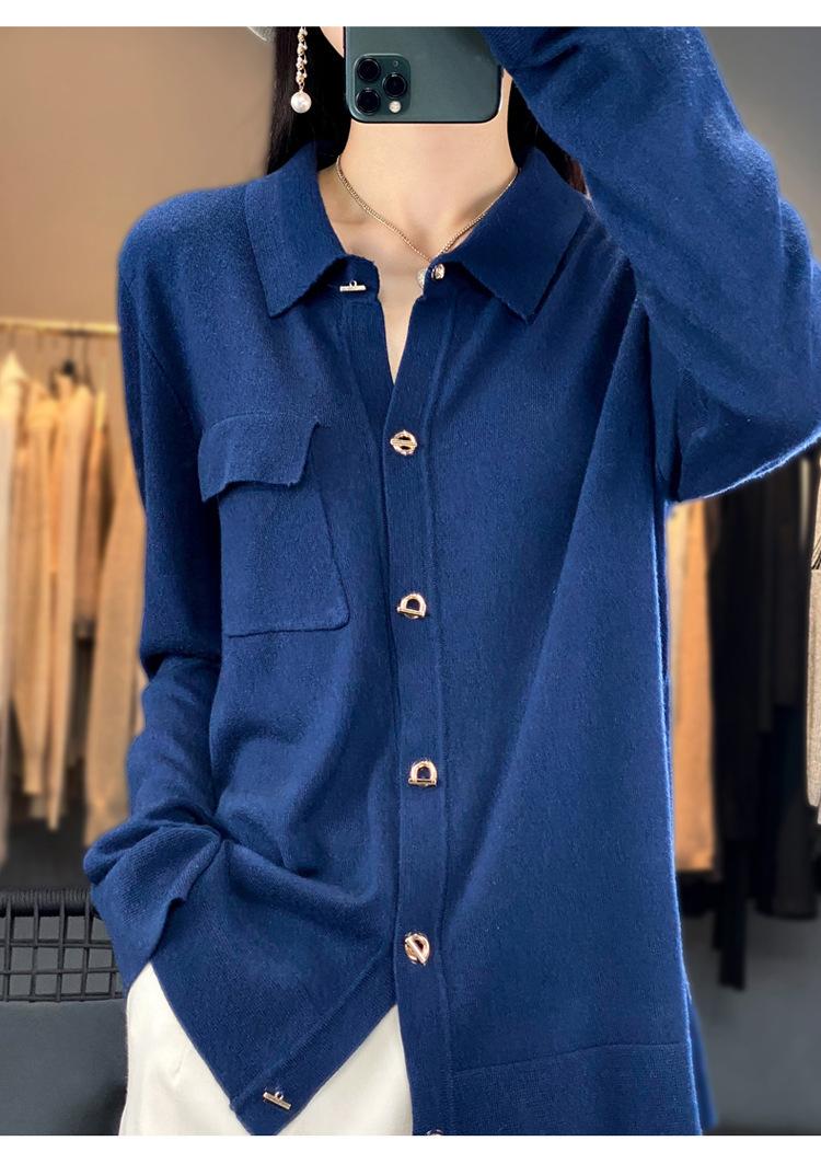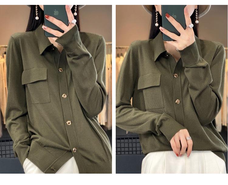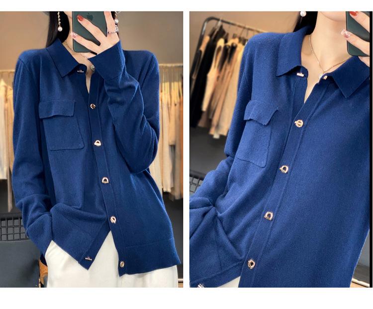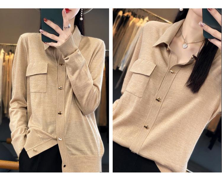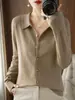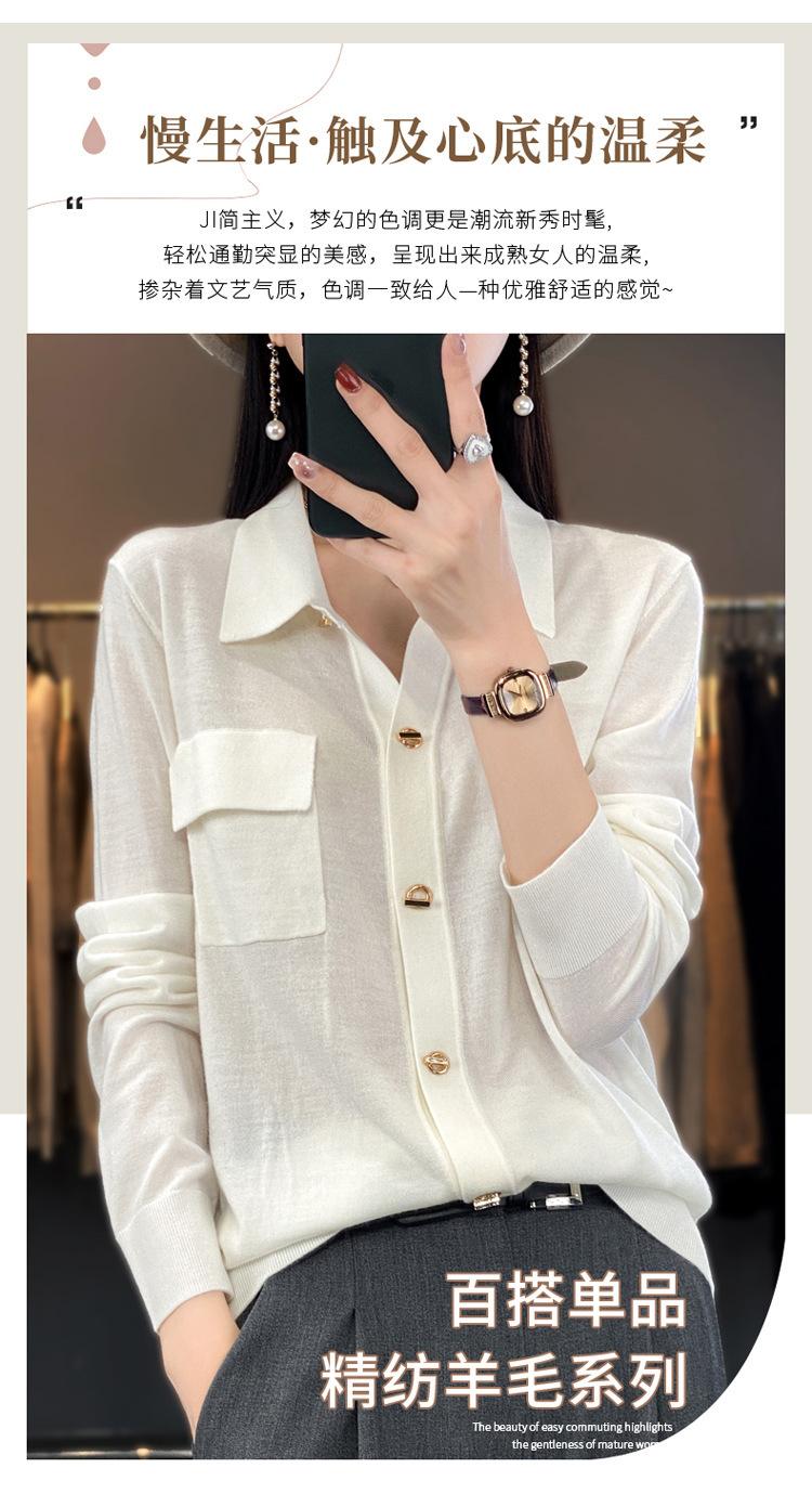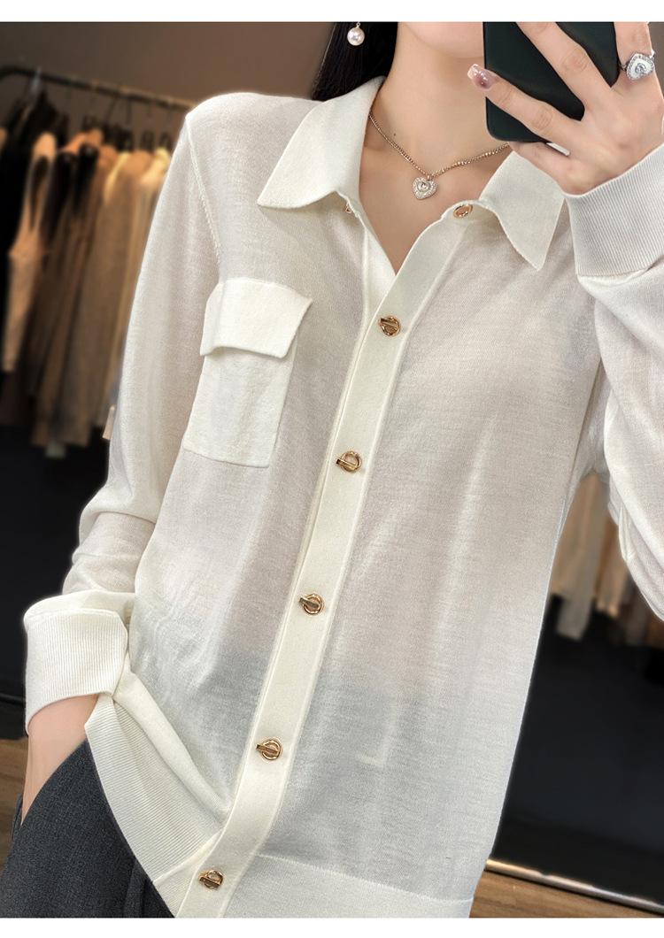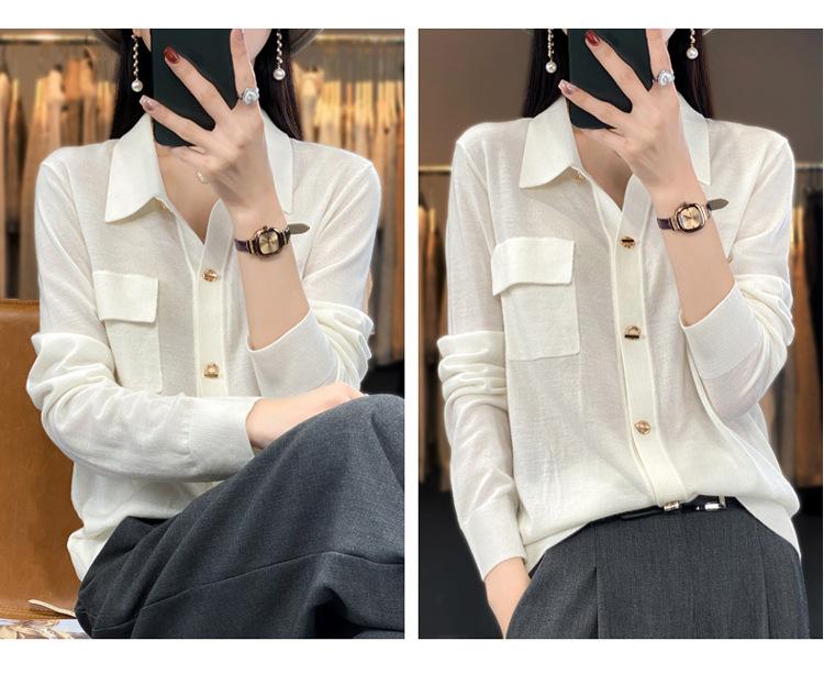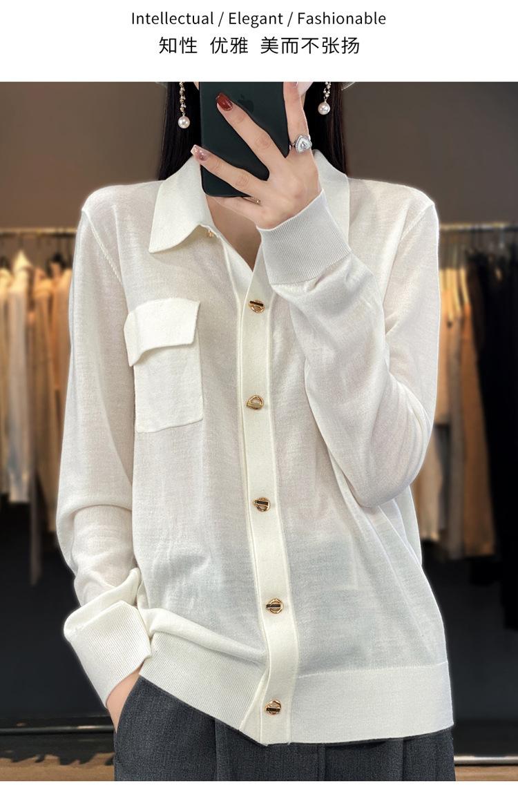 Cárdigan de punto blanco para mujer, camisa de primavera y otoño, elegante, cuello polo, suelto, manga larga, exterior de lana.