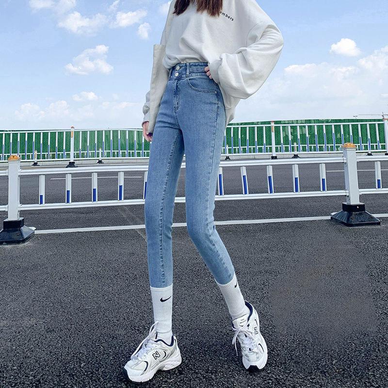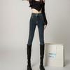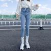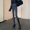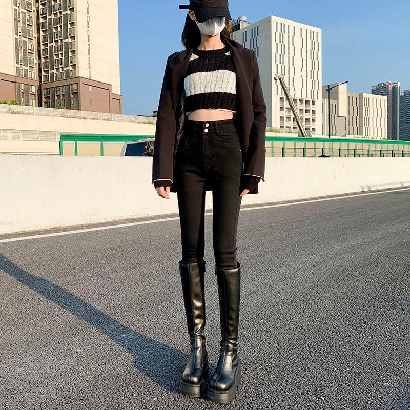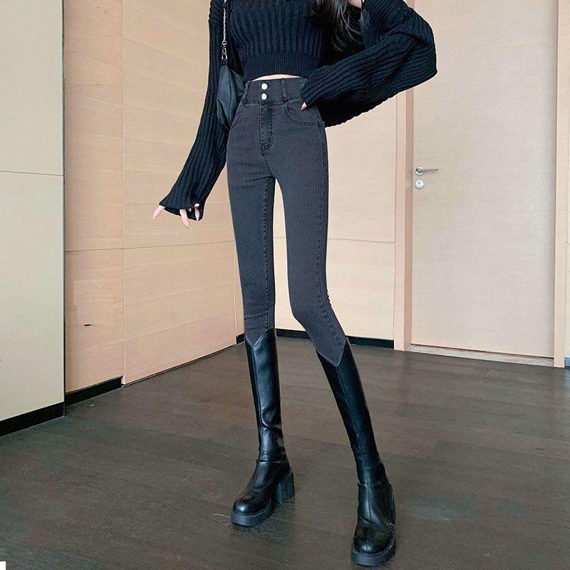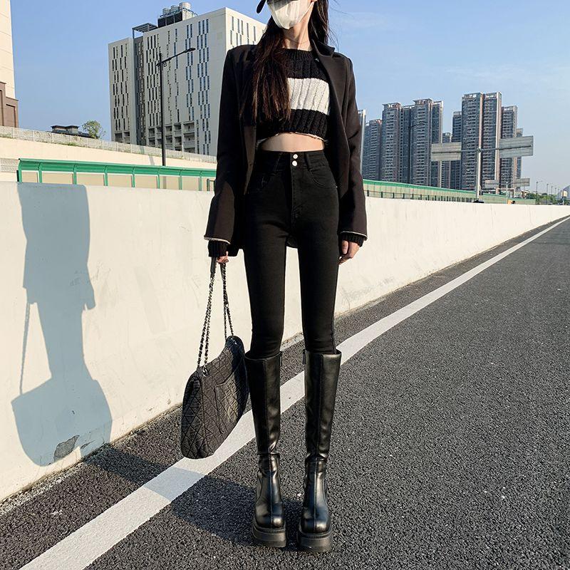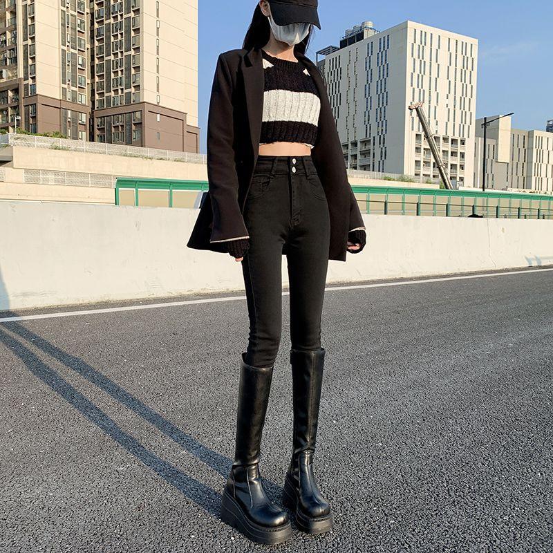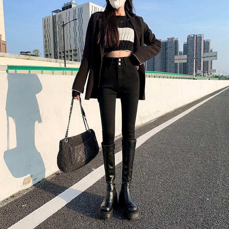Pantalones vaqueros negros ajustados de cintura alta para mujer, con doble hebilla, para principios de primavera, ajustados y recortados.