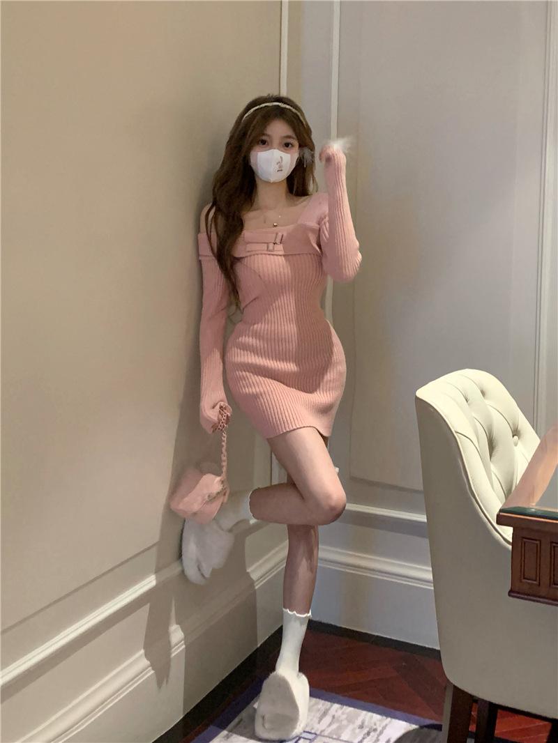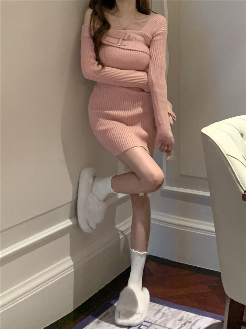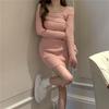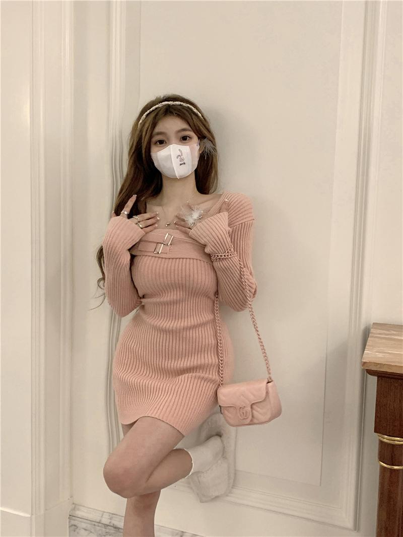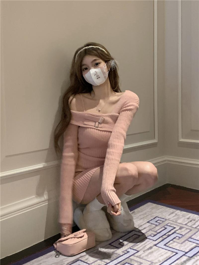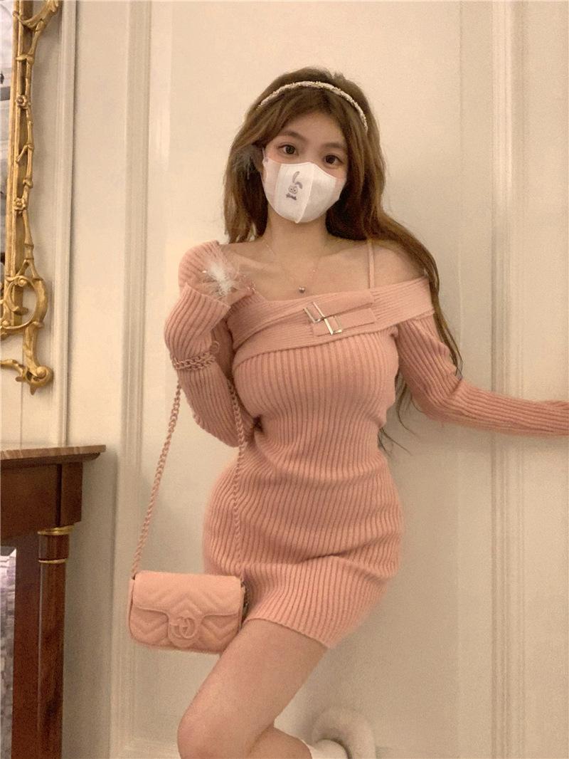 Vestido de punto con hombros descubiertos de diseño de primavera y otoño, falda femenina para realzar la cadera, falda suéter interior de deseo puro