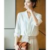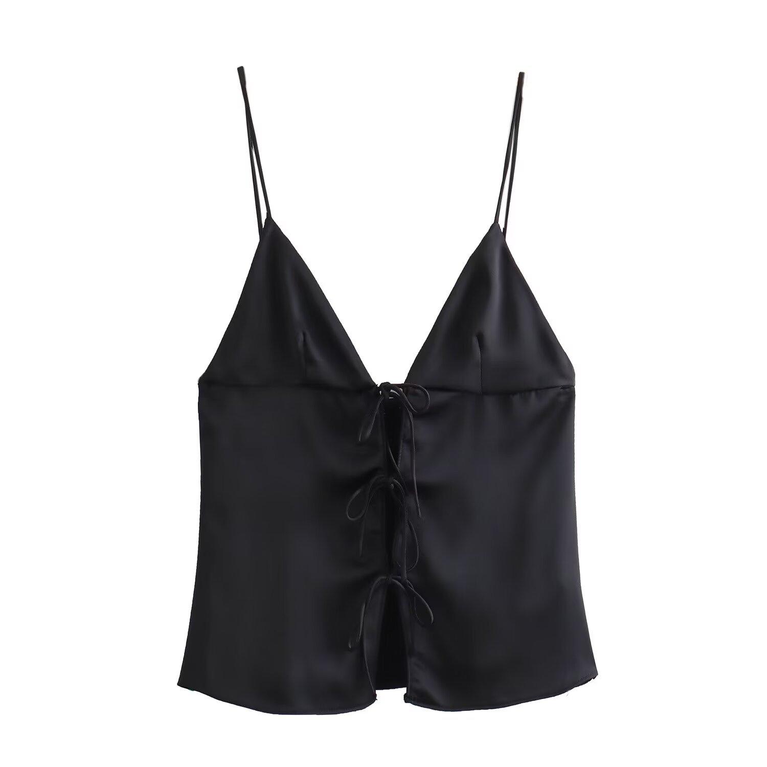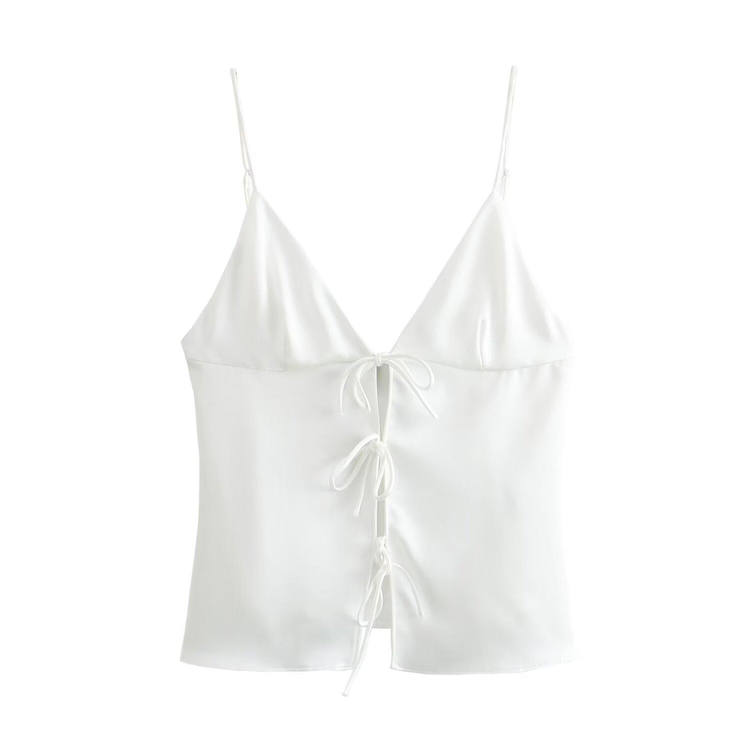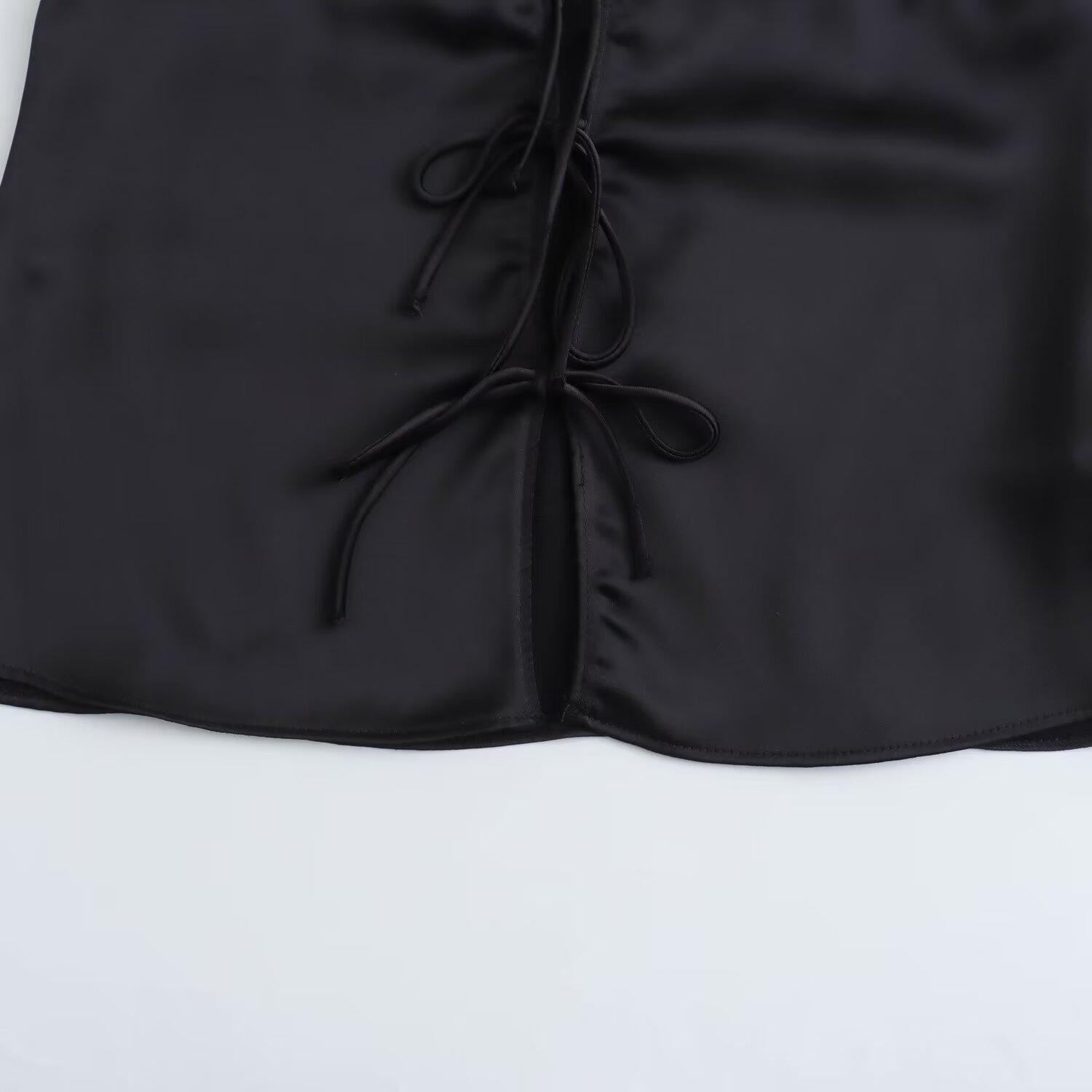 Venta al por mayor de ropa femenina de estilo europeo y americano, nueva moda primavera 2024, blusas cortas con textura de satén de seda decoradas con lazo para mujer