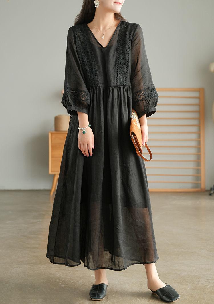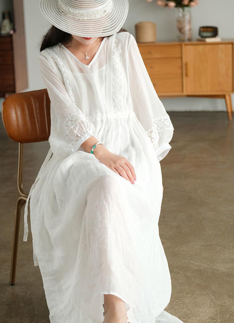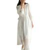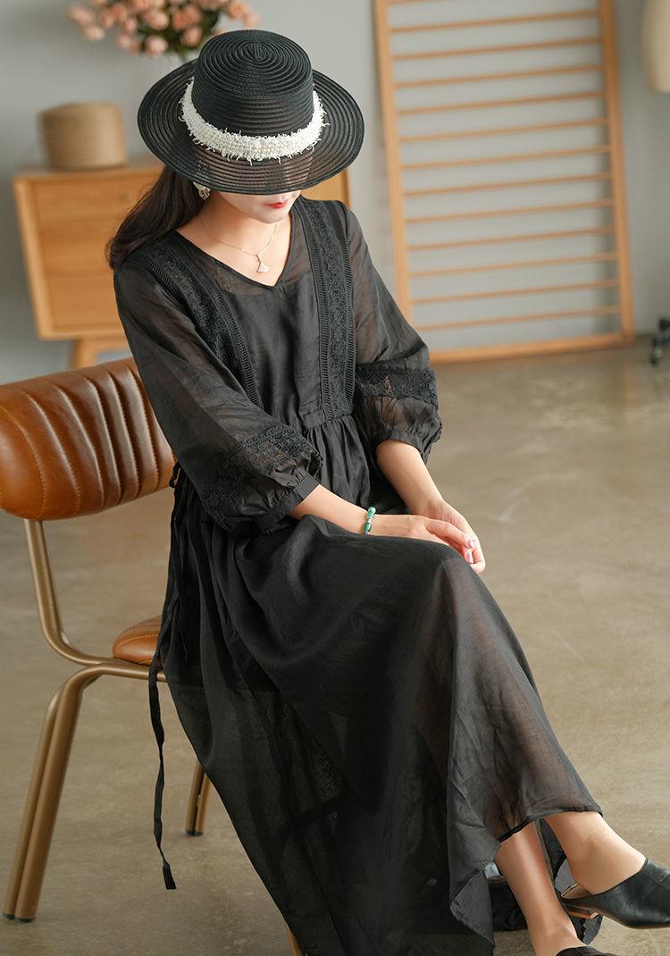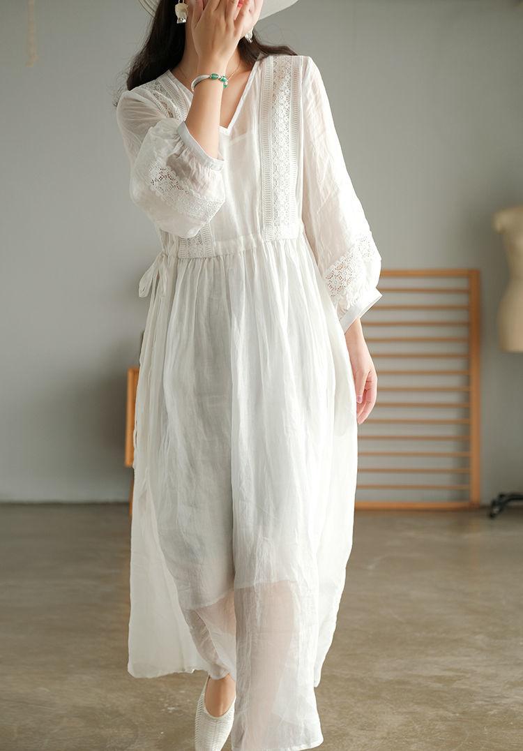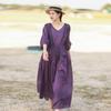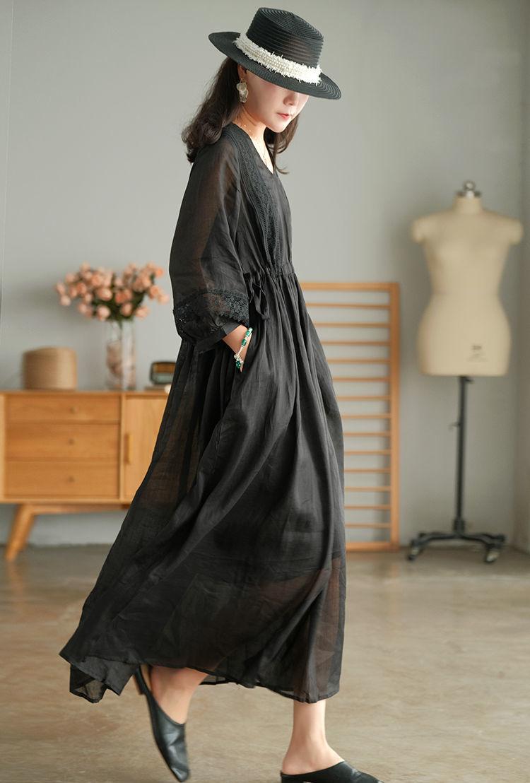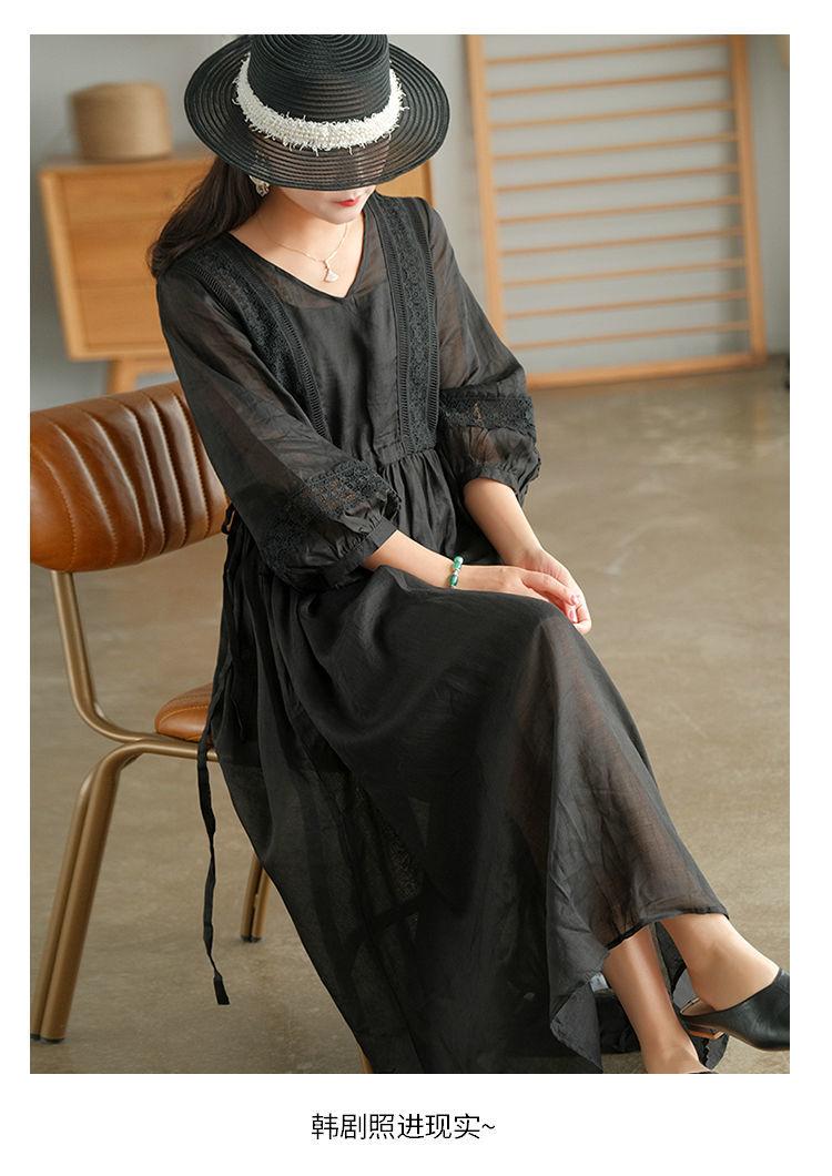 Vestido Cómodo y a la Moda Sencillo de Siete Mangas Estilo Artístico con Cordones Largo Cuello en V Estilo Fresco