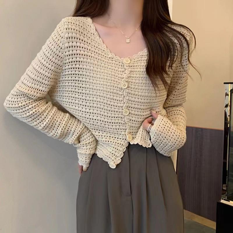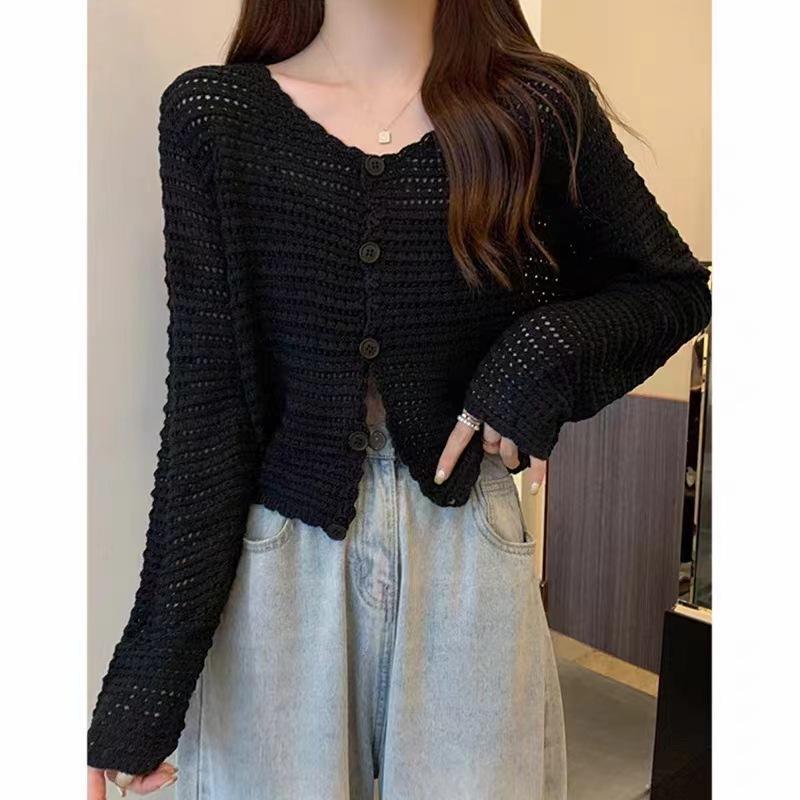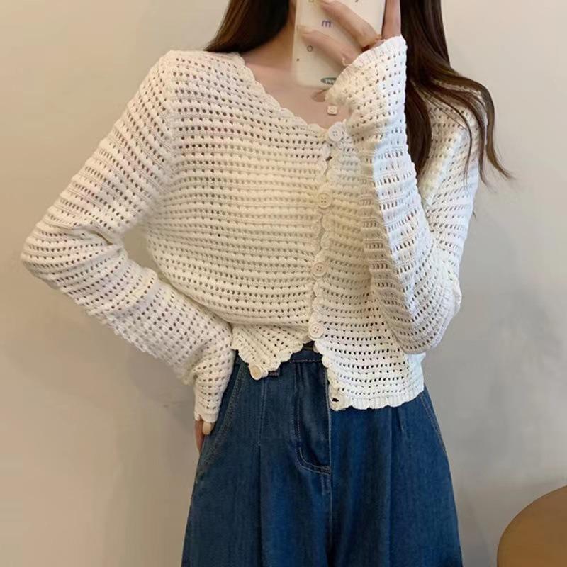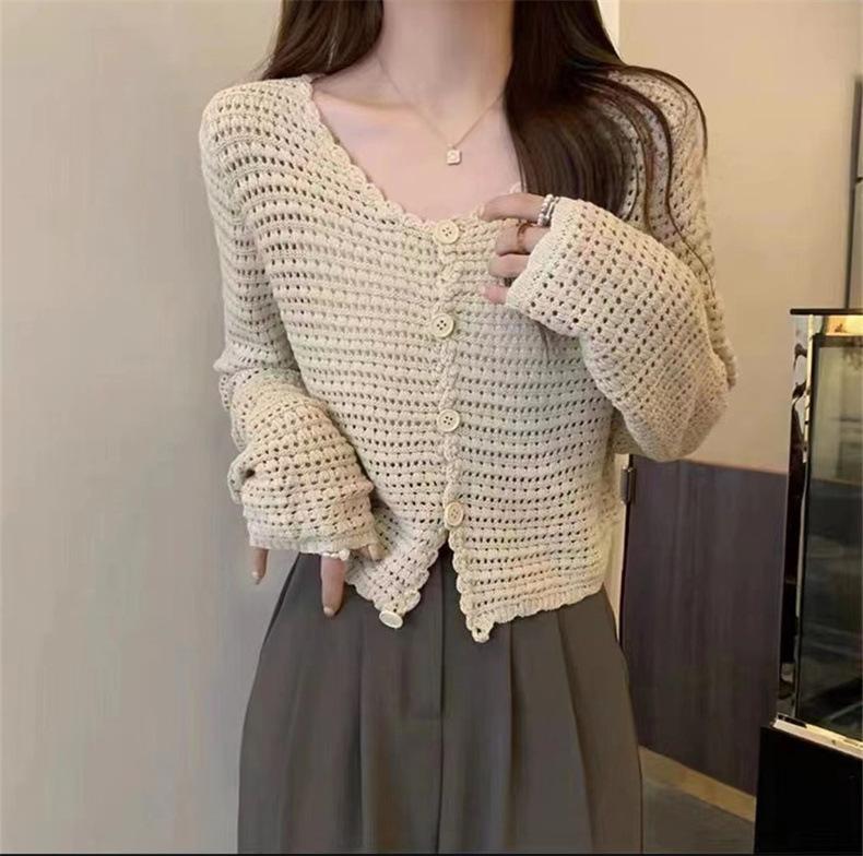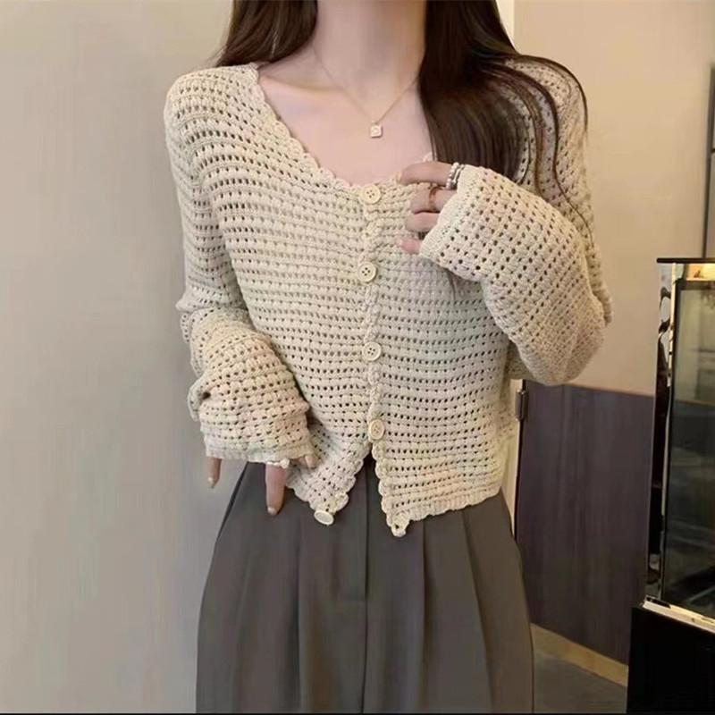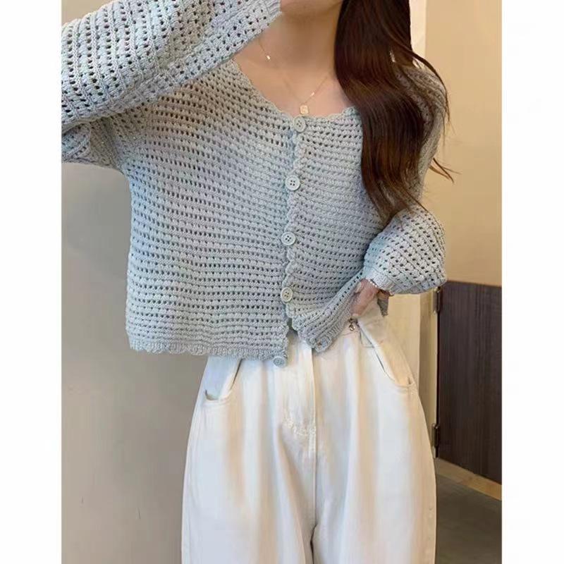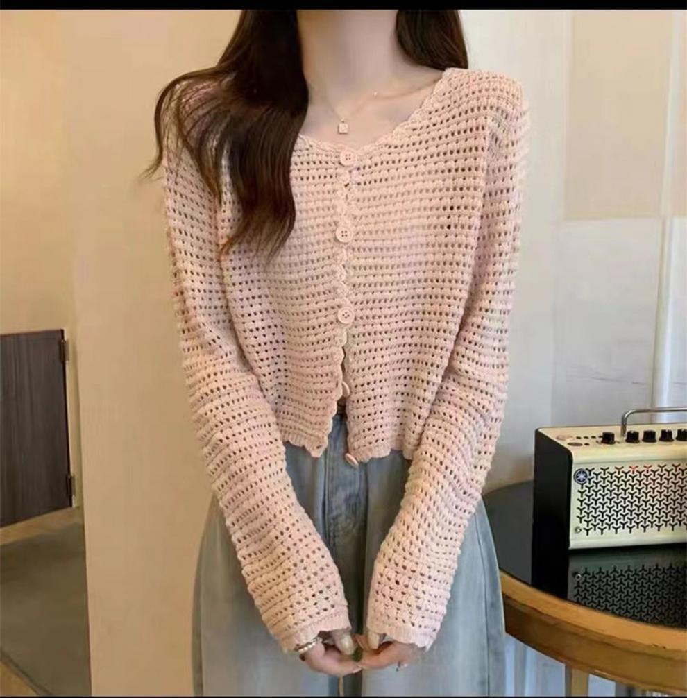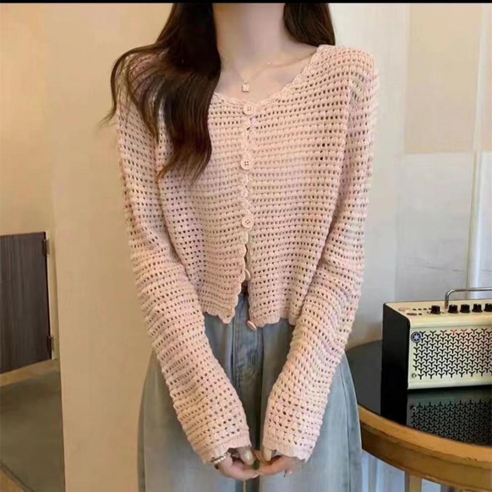 Cárdigan de punto calado de estilo suave para mujer, blusa fina holgada de verano, estilo informal, abrigo con protección solar