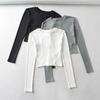 Camiseta de manga larga con cuello redondo y cintura plisada para mujer, estilo europeo y americano, de otoño, de color liso, elástica, ajustada, de corte bajo corto.