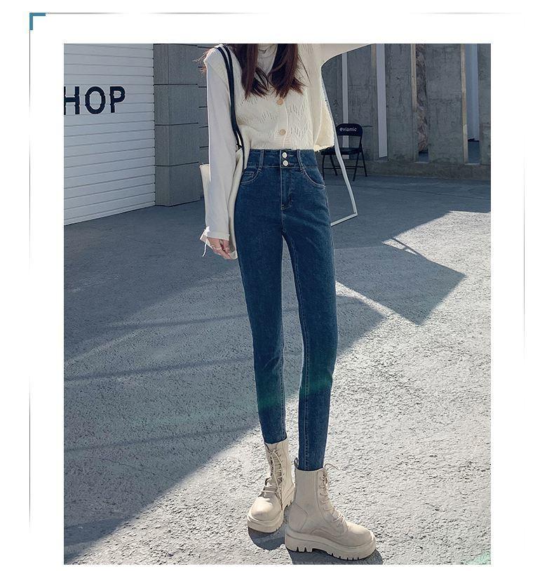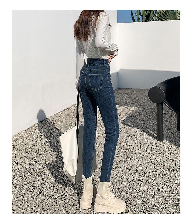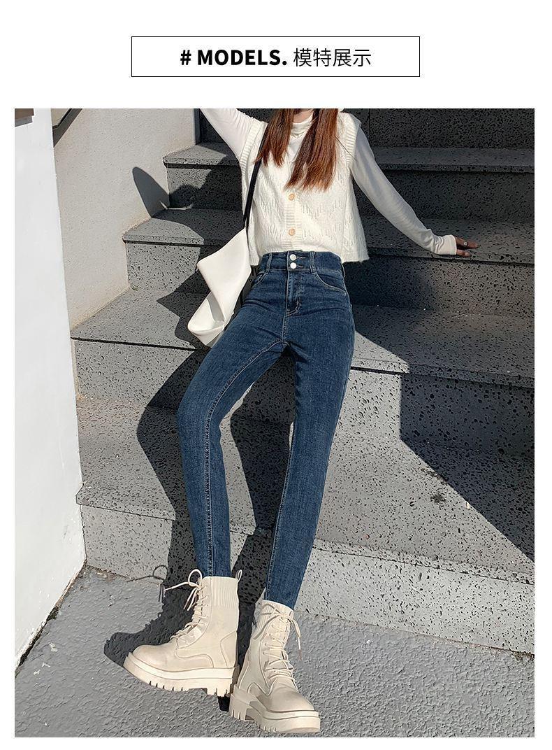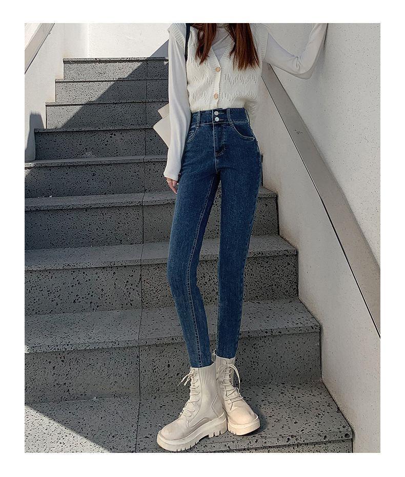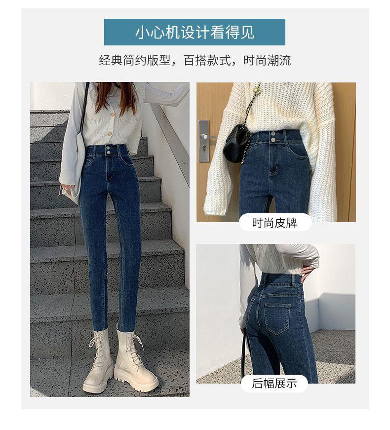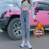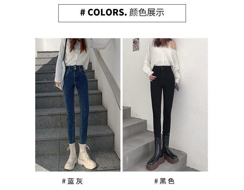 Pantalones vaqueros de doble hebilla azul grisáceo de otoño e invierno para mujer, pantalones elásticos ajustados, pantalones cortos de cintura alta ajustados, pantalones de moda que combinan con todo.