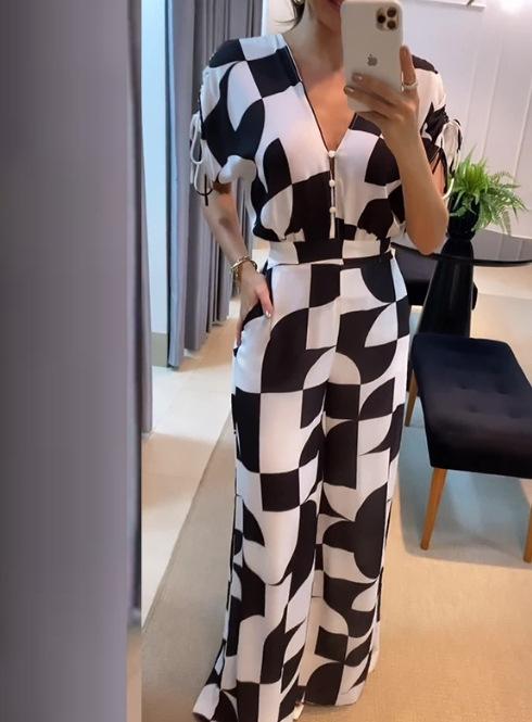 2023 Comercio exterior europeo y americano Mujeres hora del té Francés nicho bloque de color Cuello en V manga abullonada moda casual mono