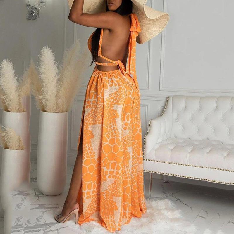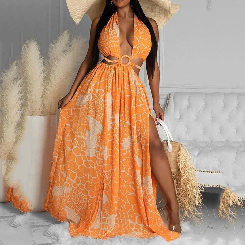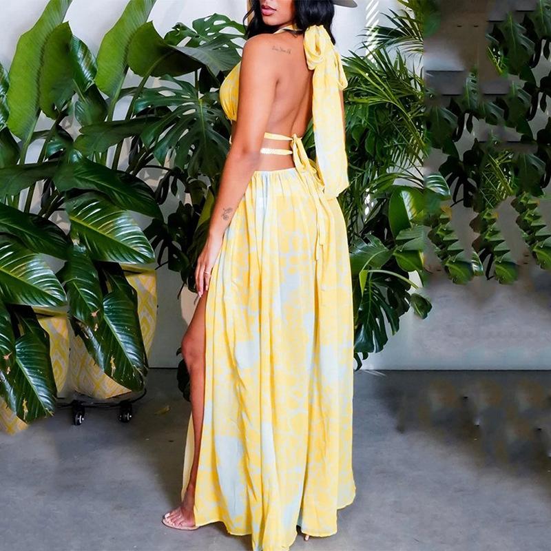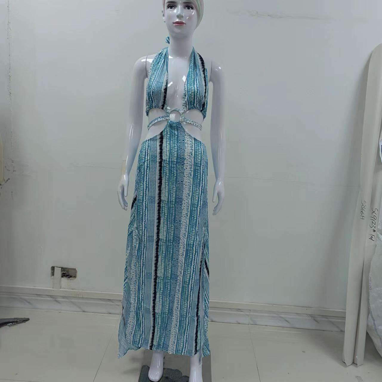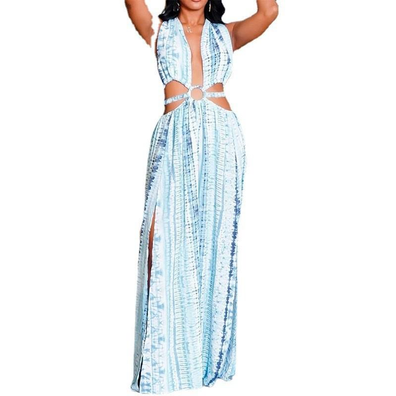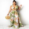 Sc8303 Ropa Europea y Americana Amazon Ropa Transfronteriza de Club Nocturno Sexy Estampado Tirantes Cruzados Cuello en V Abertura Vestido