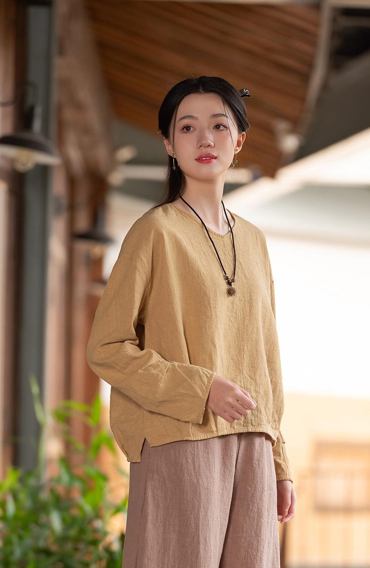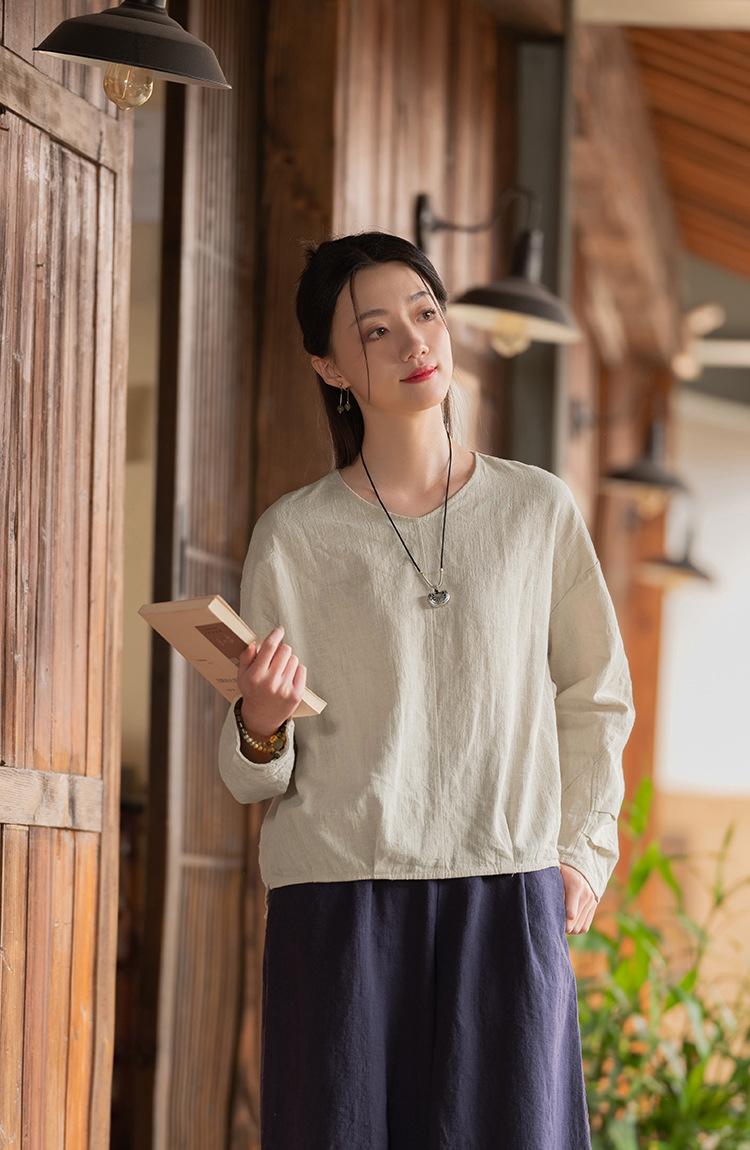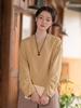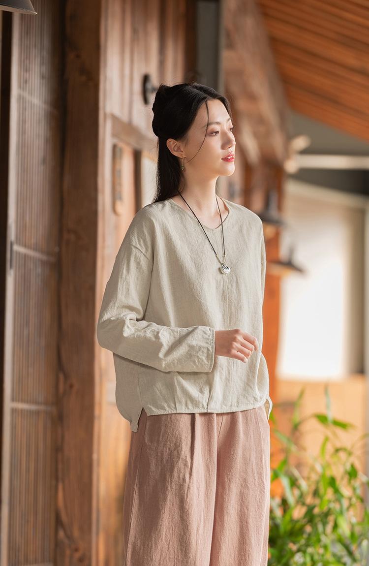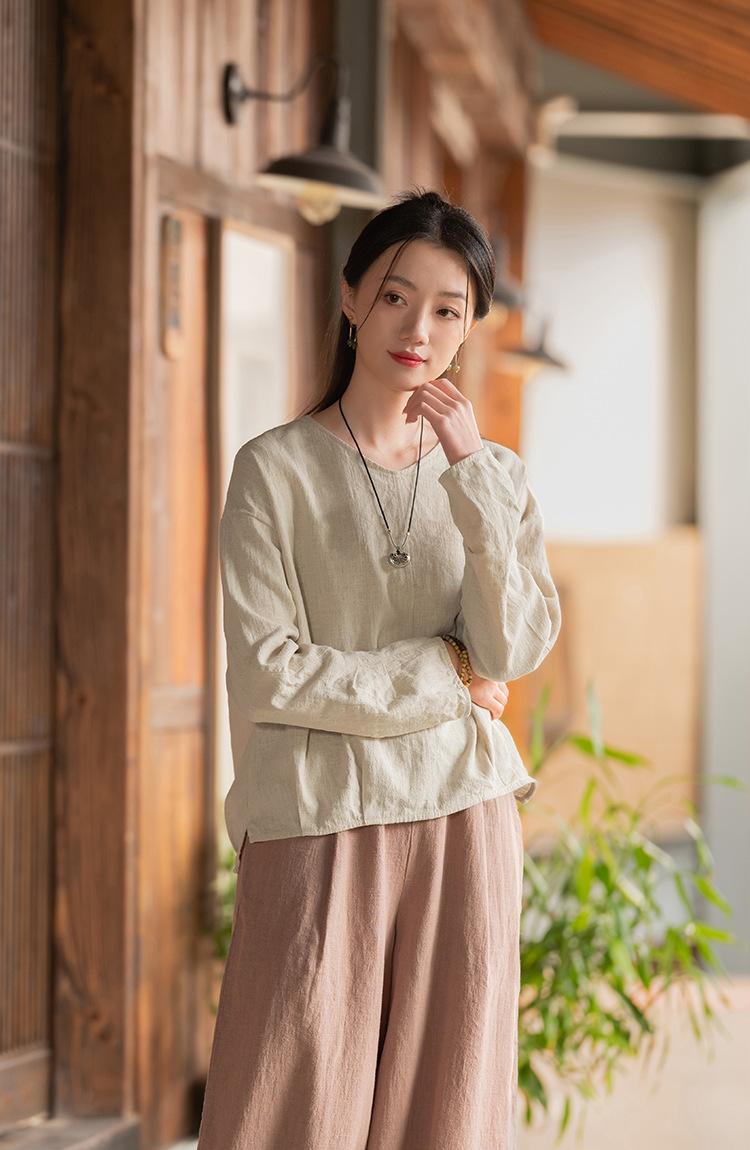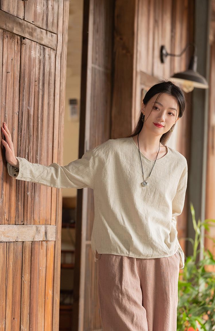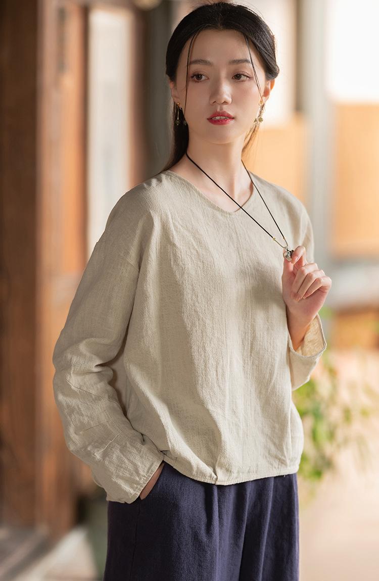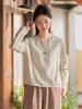2025 Otoño Nuevo Algodón y Lino para Mujer Literario Slim Cuello en V Top Manga Larga Más Fácil de Combinar Camiseta de Mujer