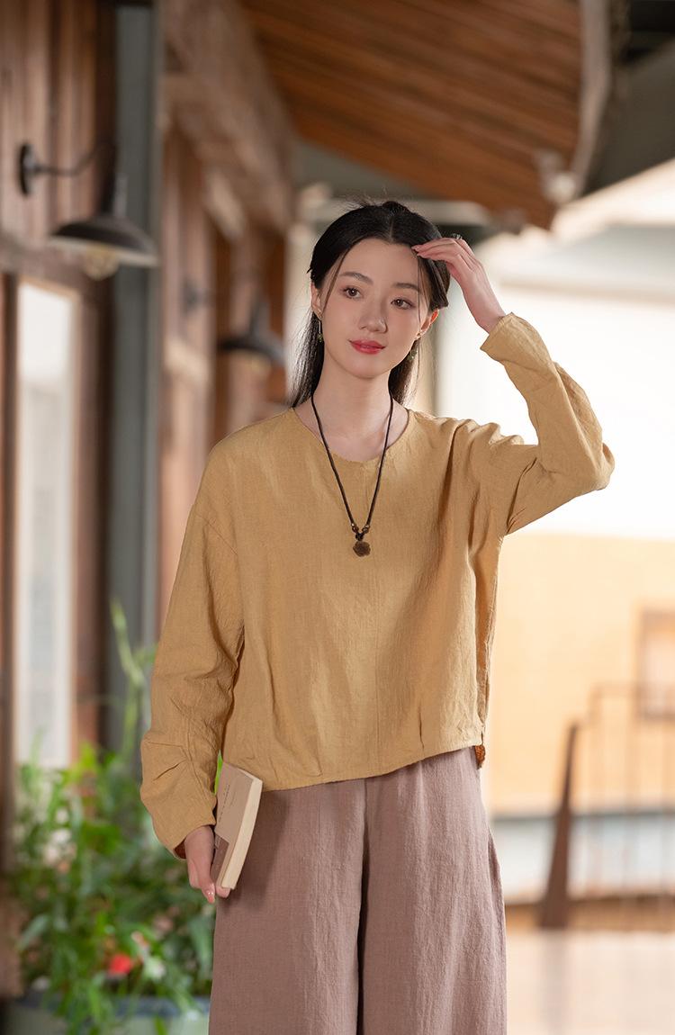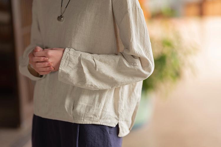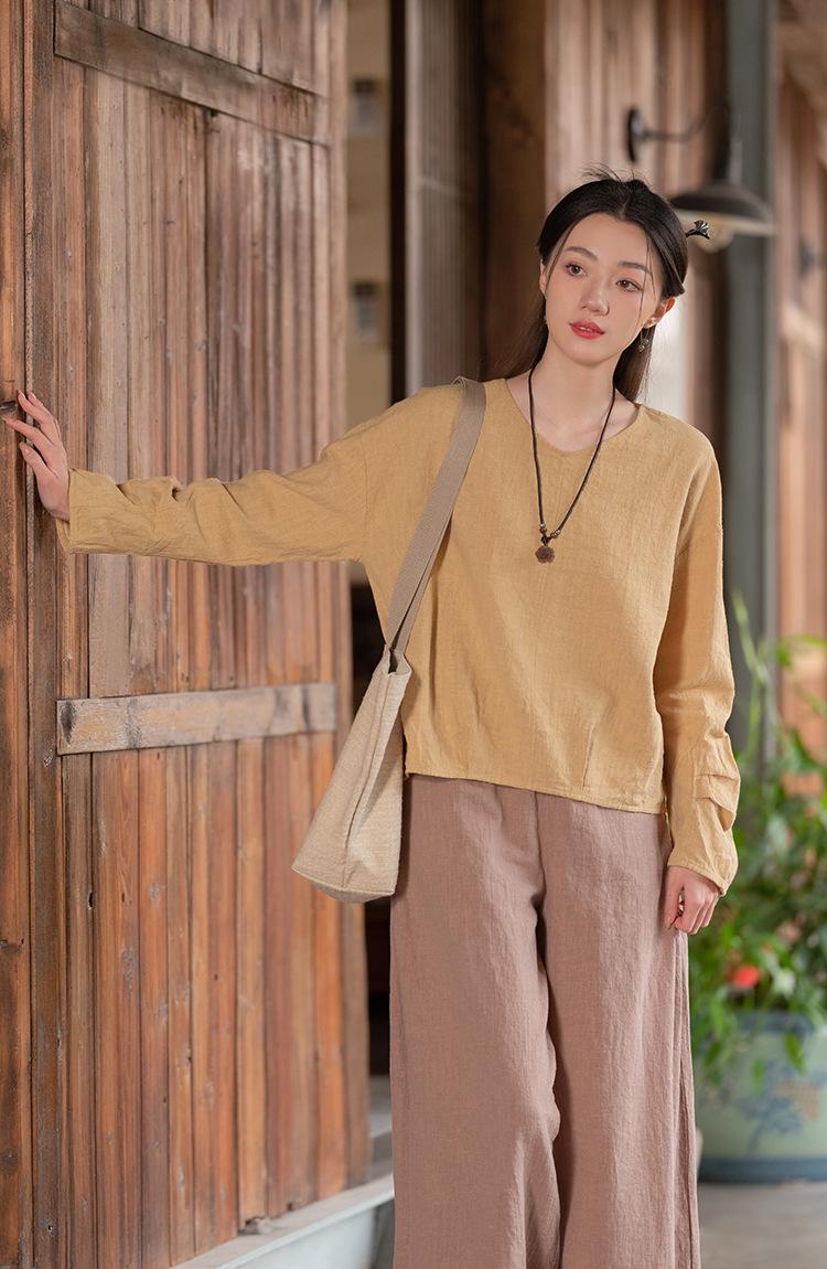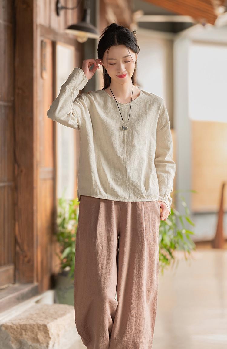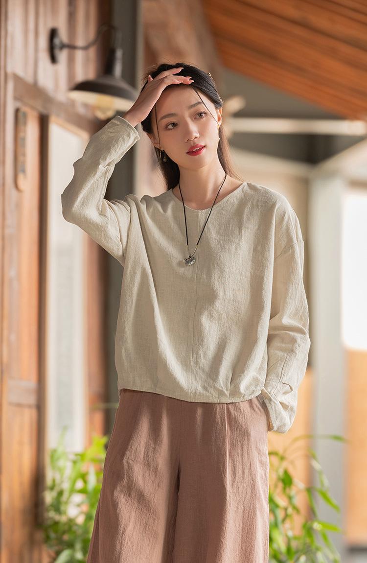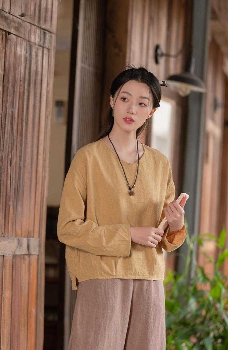 2025 Otoño Nuevo Algodón y Lino para Mujer Literario Slim Cuello en V Top Manga Larga Más Fácil de Combinar Camiseta de Mujer