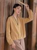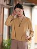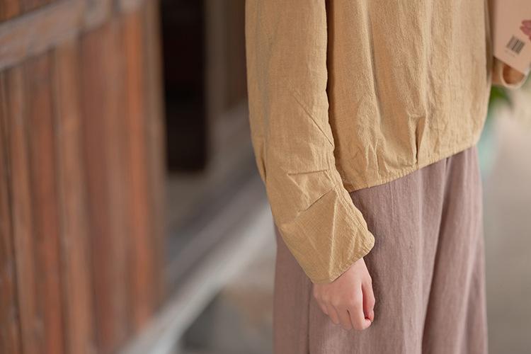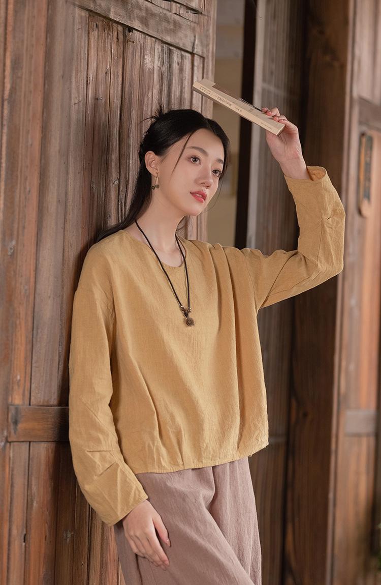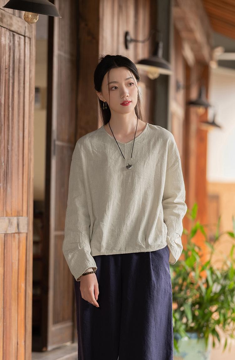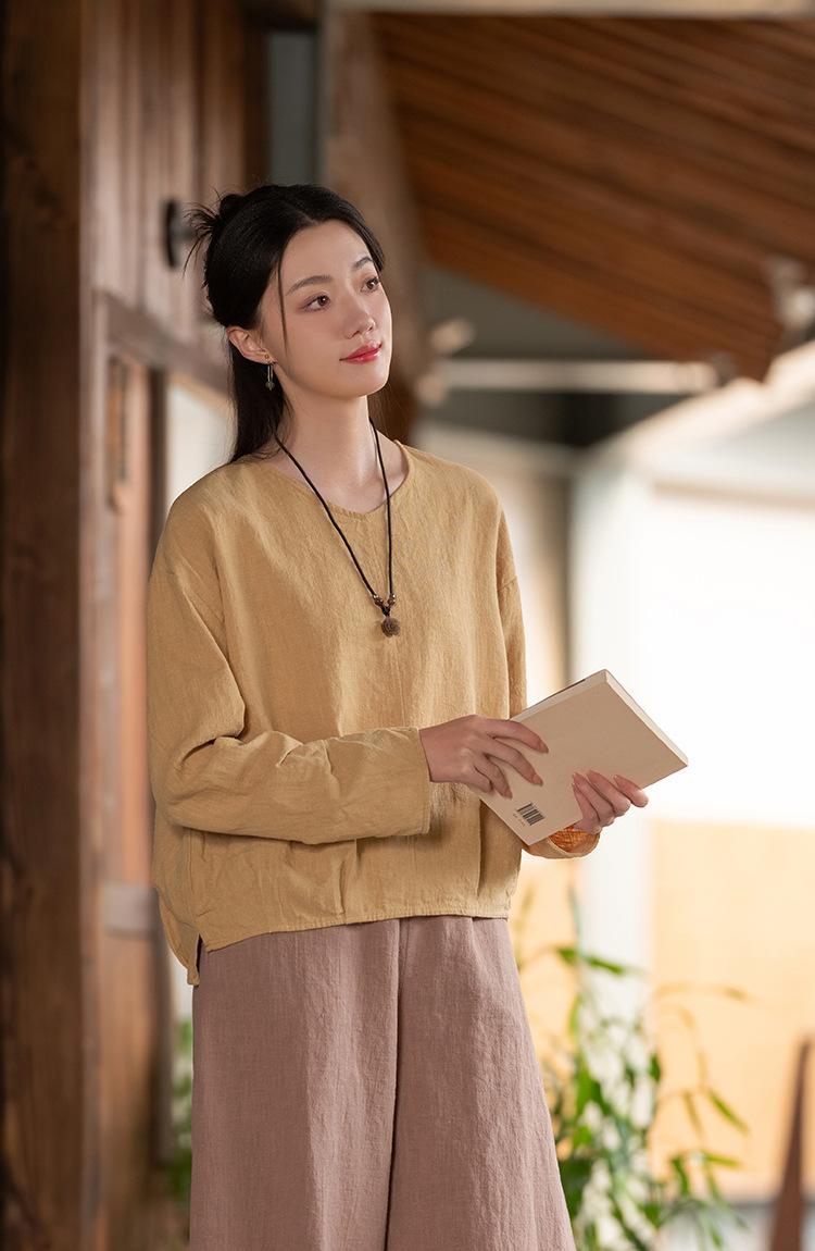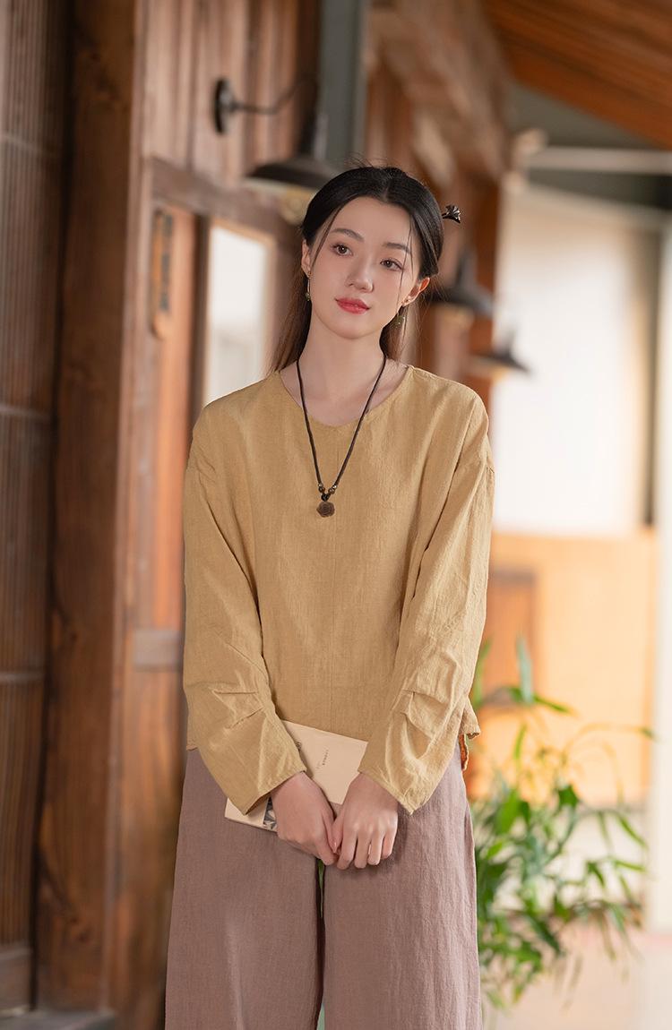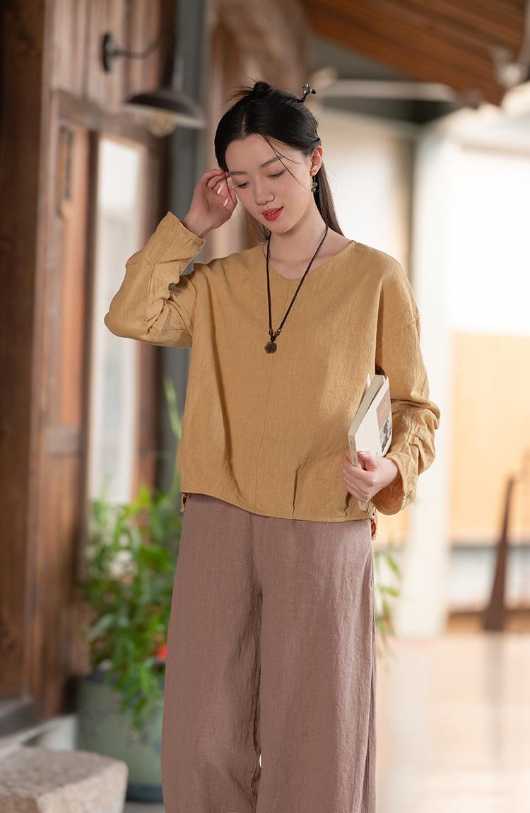2025 Otoño Nuevo Algodón y Lino para Mujer Literario Slim Cuello en V Top Manga Larga Más Fácil de Combinar Camiseta de Mujer