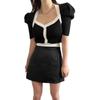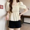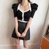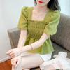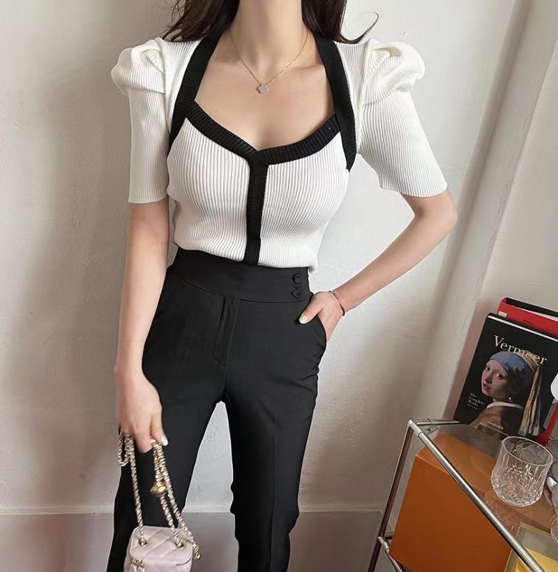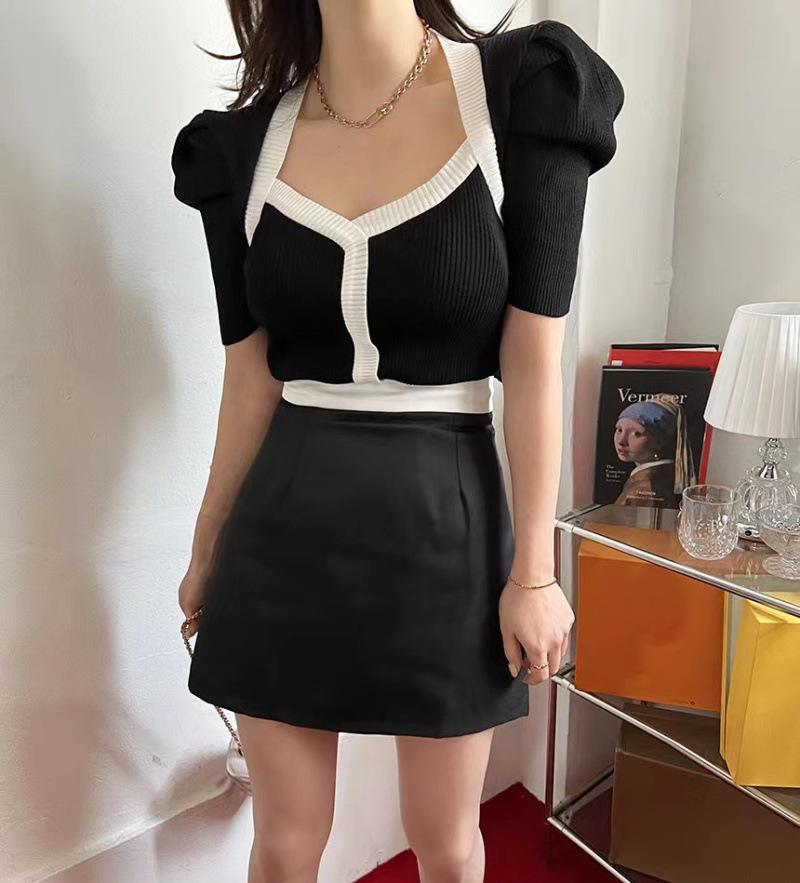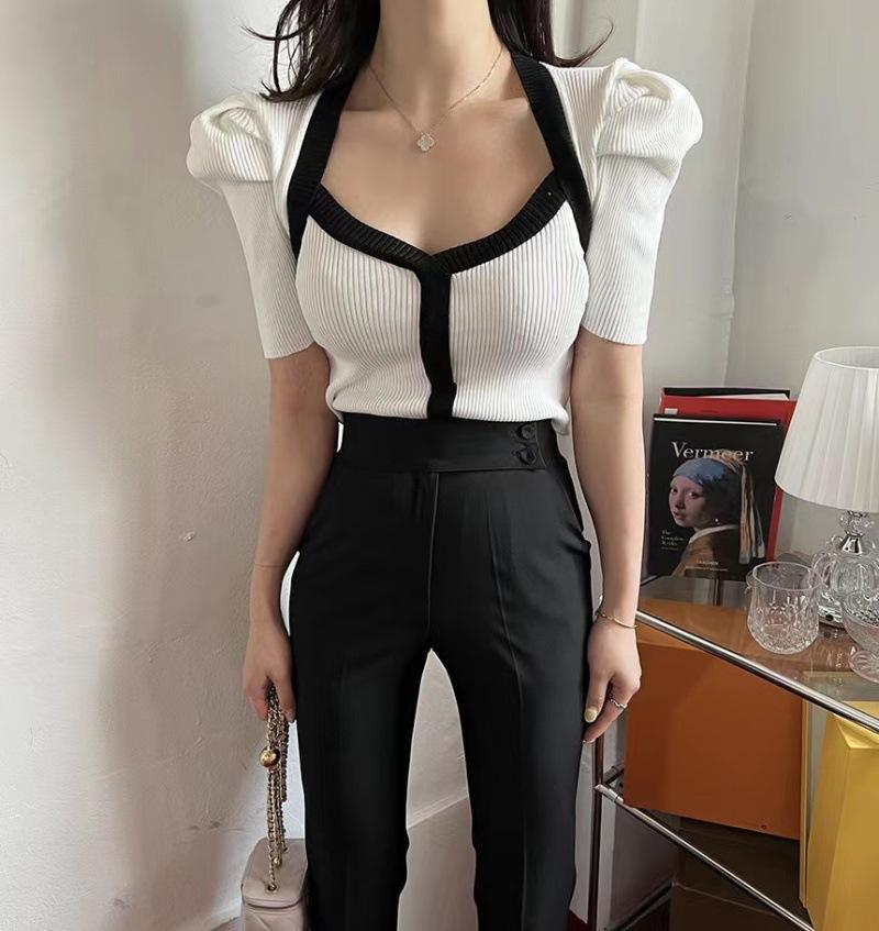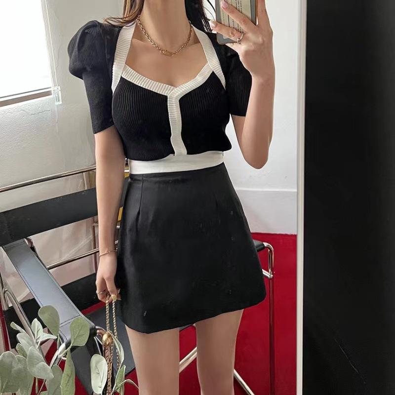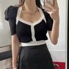 Top corto de manga corta de verano para mujer, diseño de nicho, tejido de punto con cuello cuadrado, moderno