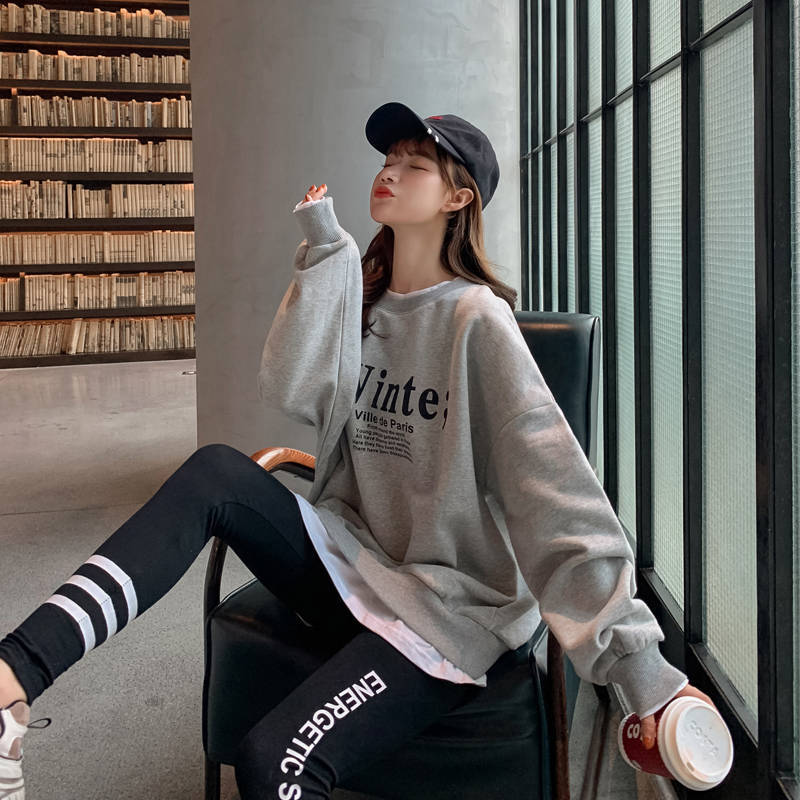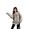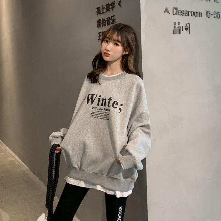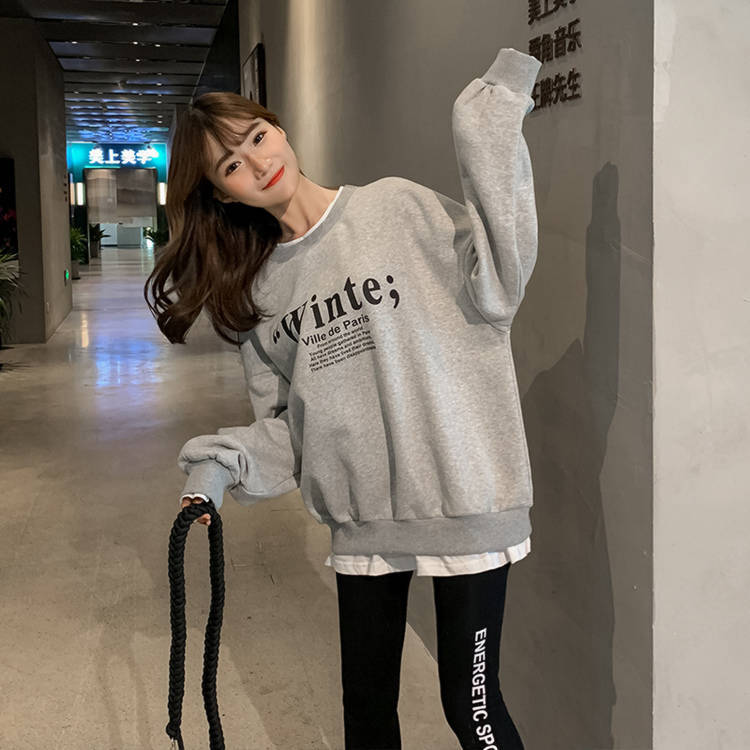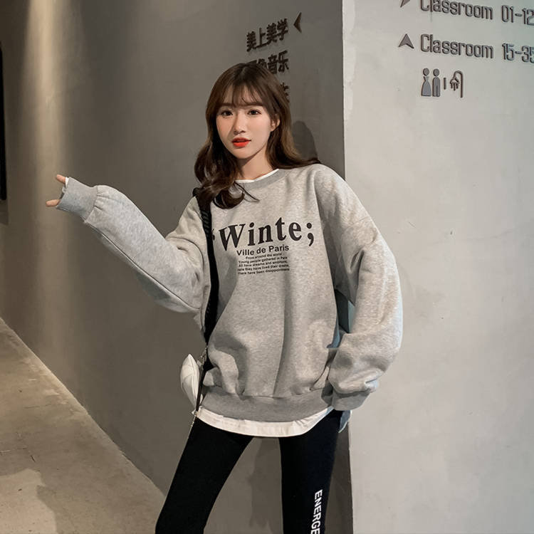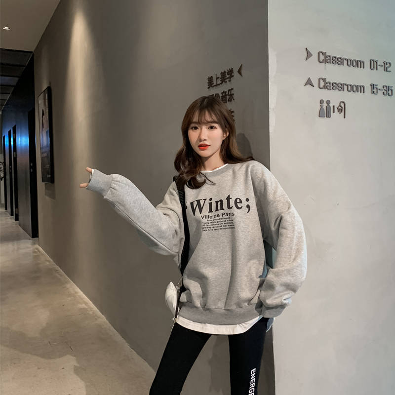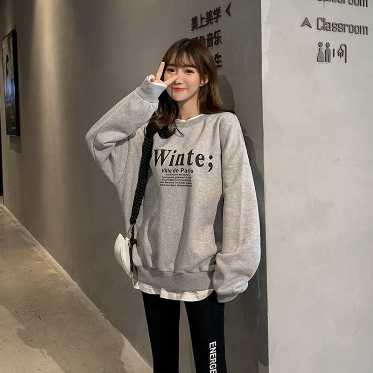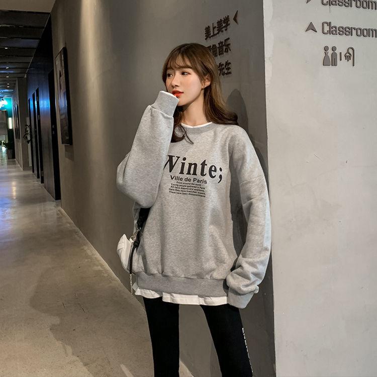 Otoño/Invierno 2025 Nuevo Estilo Coreano Suelto Estampado de Letras Versátil Falso de Dos Piezas Forrado de Felpa Sudadera de Cuello Redondo para Estudiantes Top
