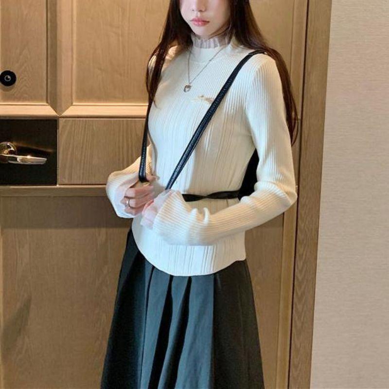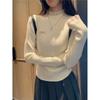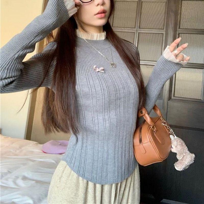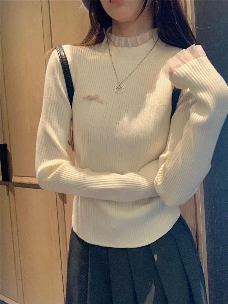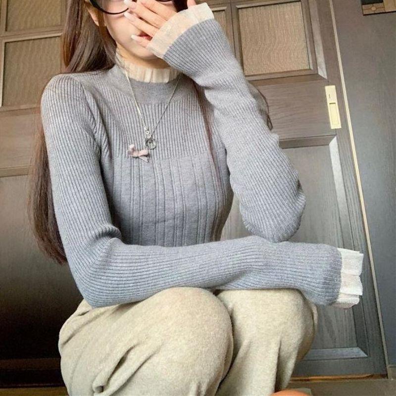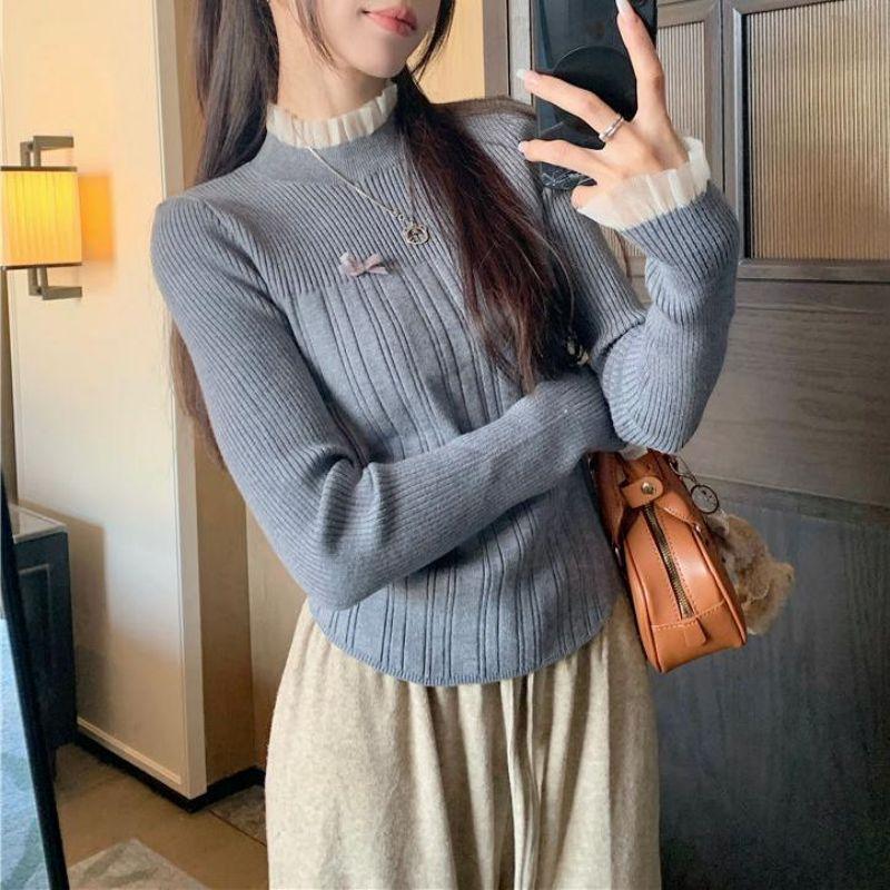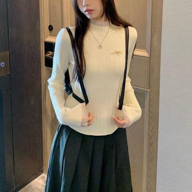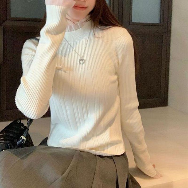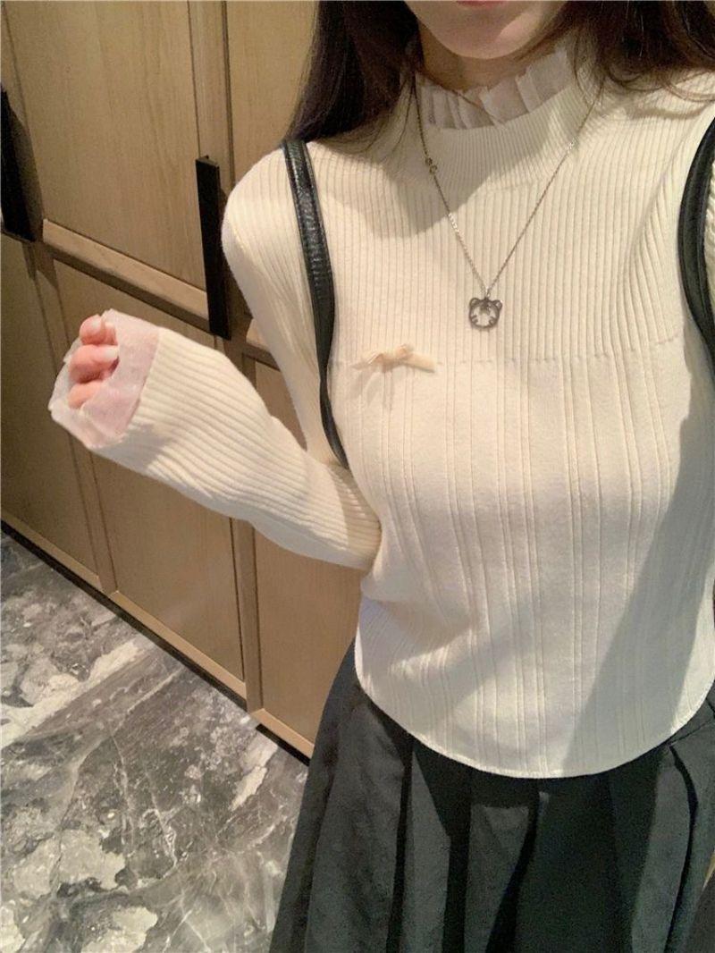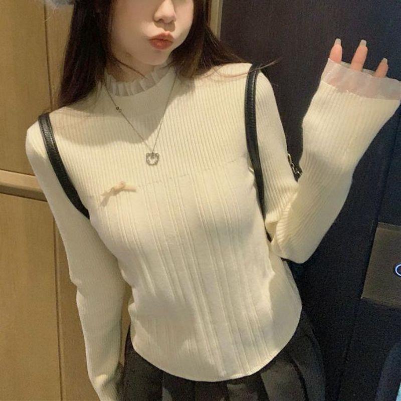 Camiseta de Punto de Cuello Medio Alto para Mujer, Suéter con Lazo de Otoño e Invierno, Nuevo Estilo, Top Interior Súper Bonito y de Alta Gama