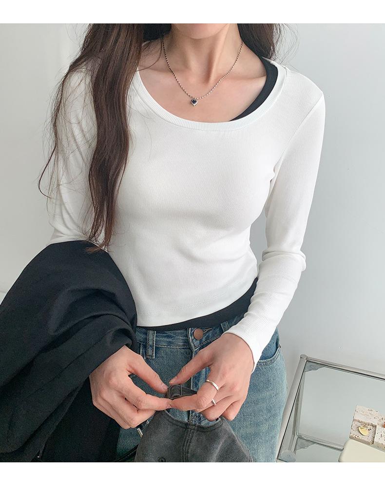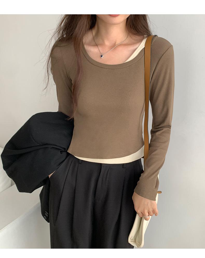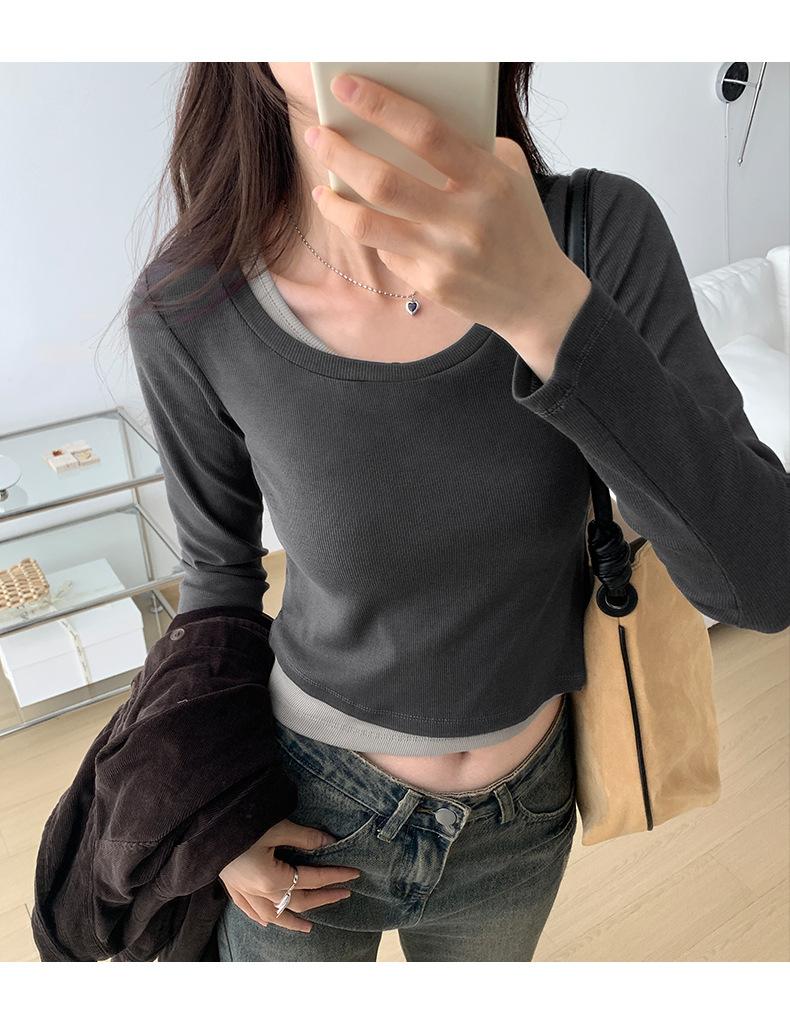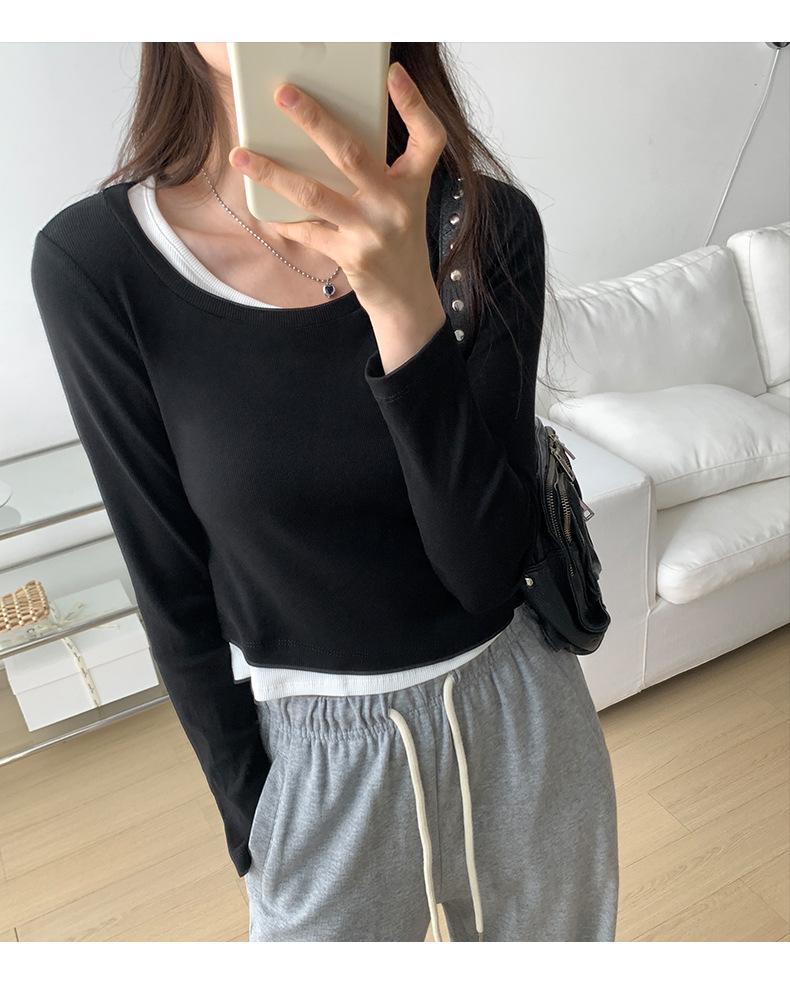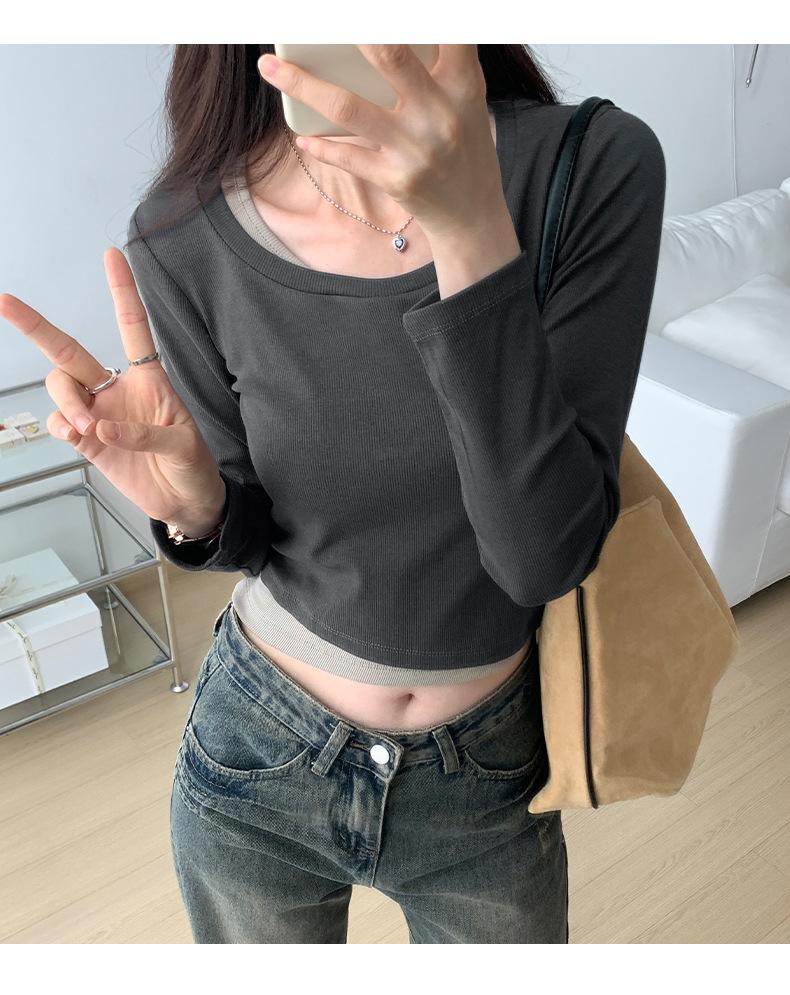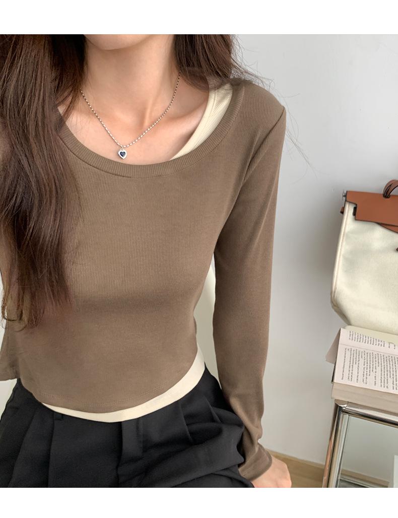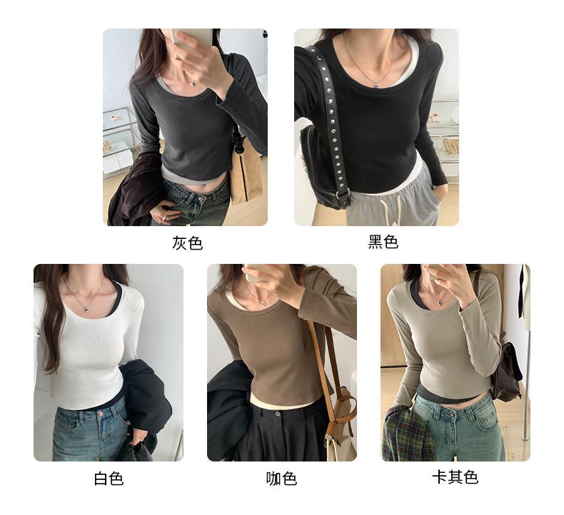 Foto real de camiseta de manga larga de dos piezas falsas a contraste para mujer en otoño temprano 2023 nuevo diseño nicho top clavícula para fondo