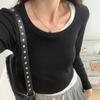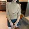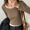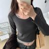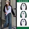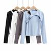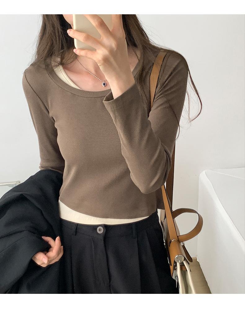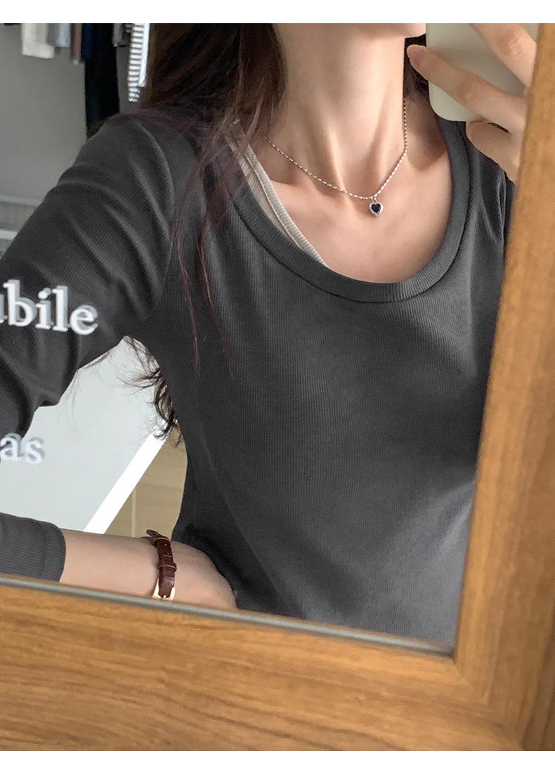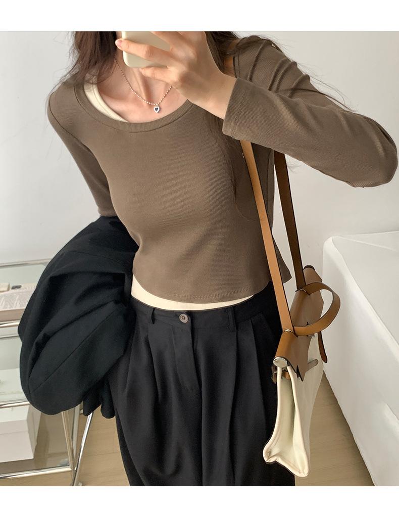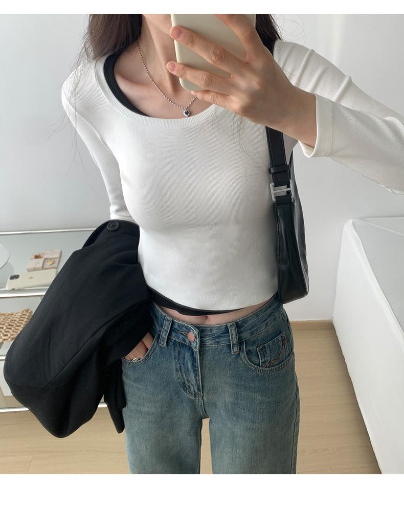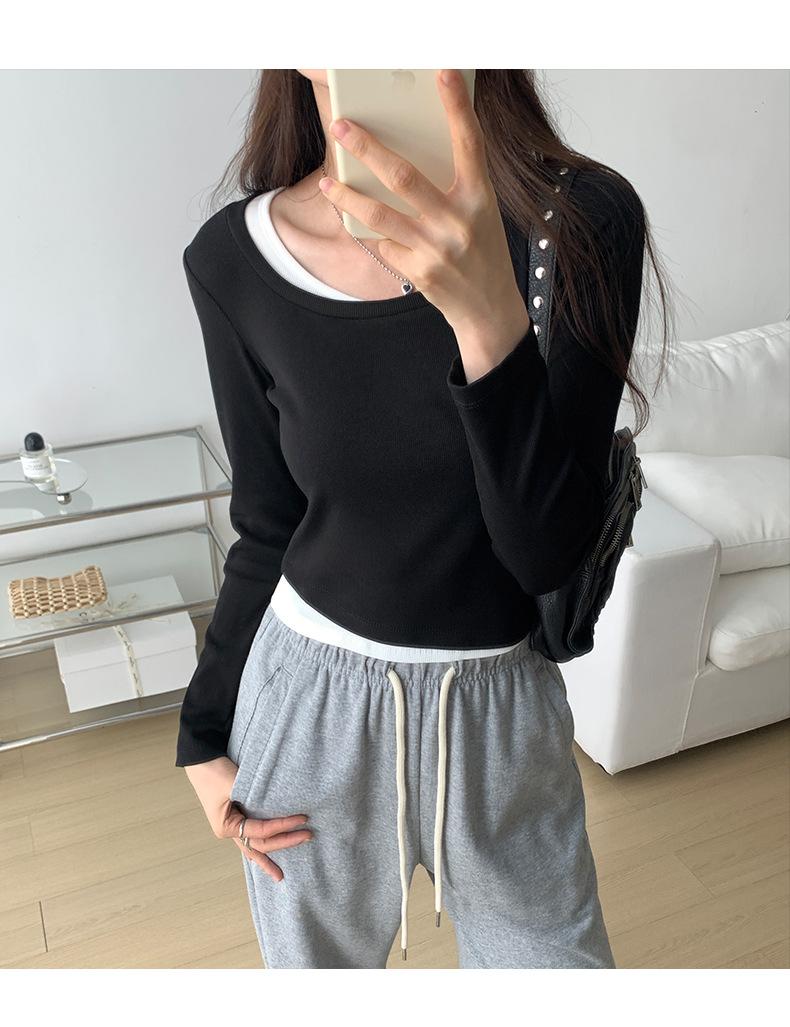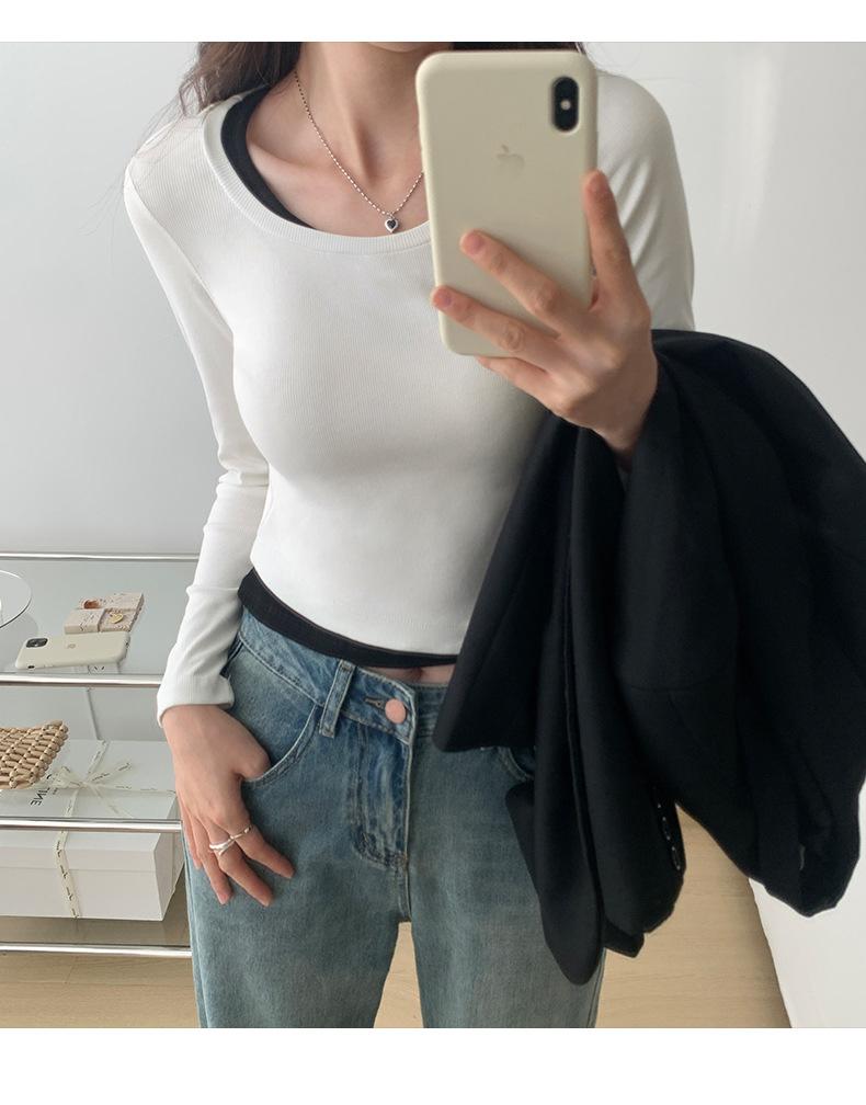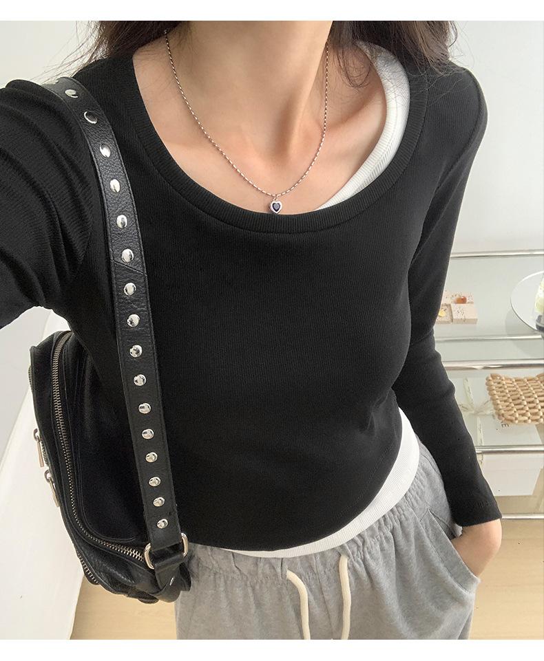 Foto real de camiseta de manga larga de dos piezas falsas a contraste para mujer en otoño temprano 2023 nuevo diseño nicho top clavícula para fondo