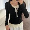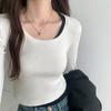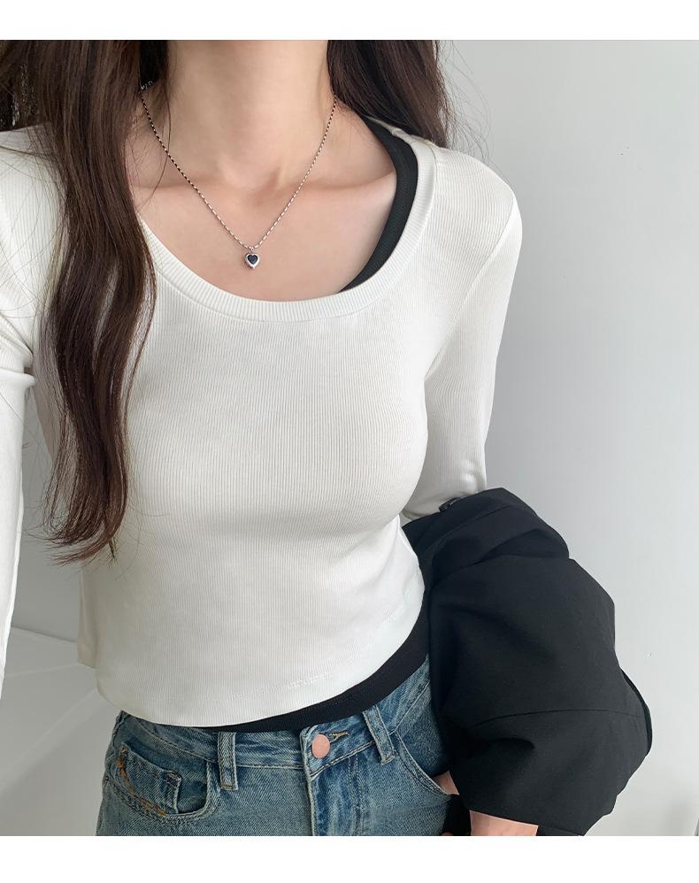Camiseta de manga larga de dos piezas falsas en color contraste de tiro real para mujer, nuevo diseño nicho con sentido del diseño de principios de otoño 2023, top básico con clavícula