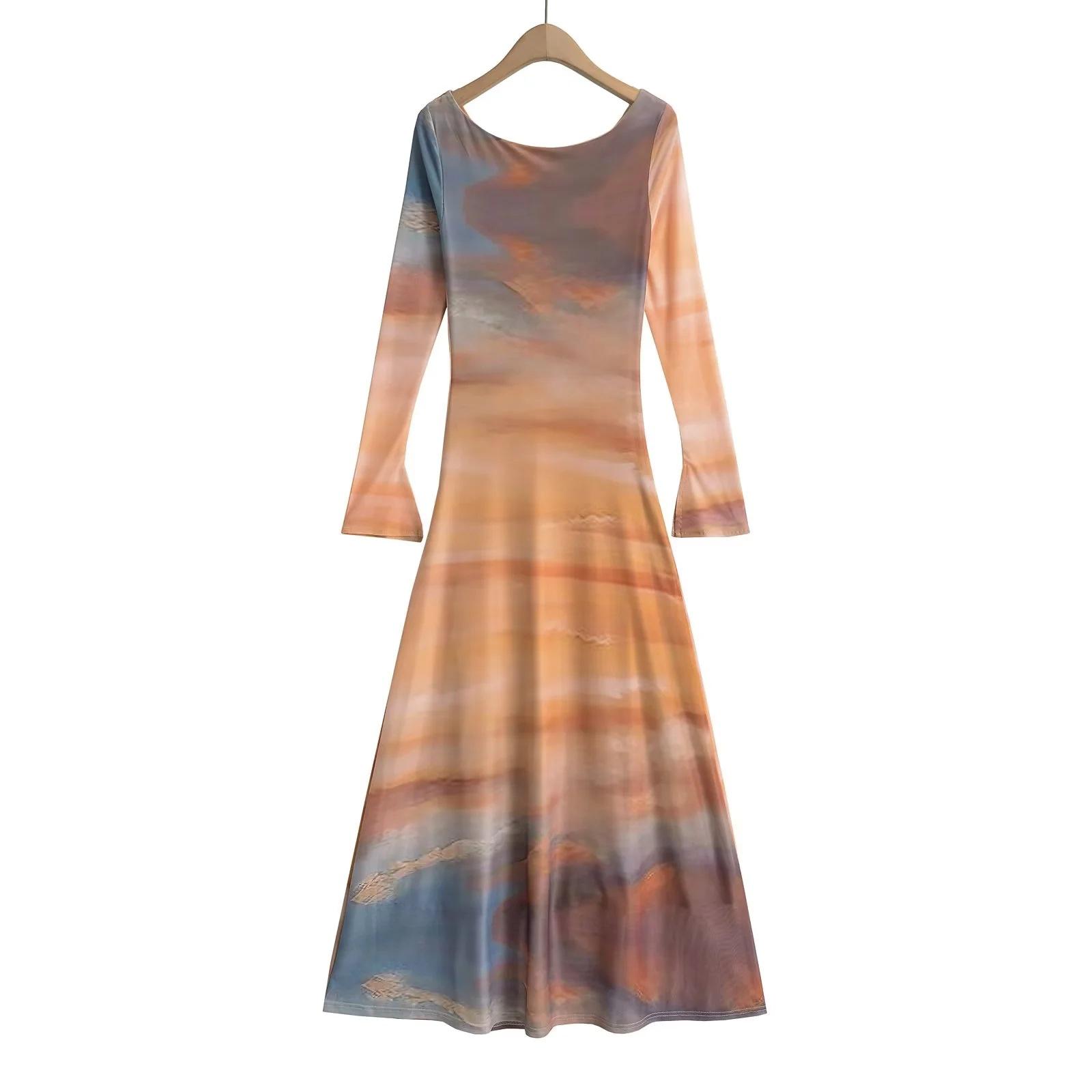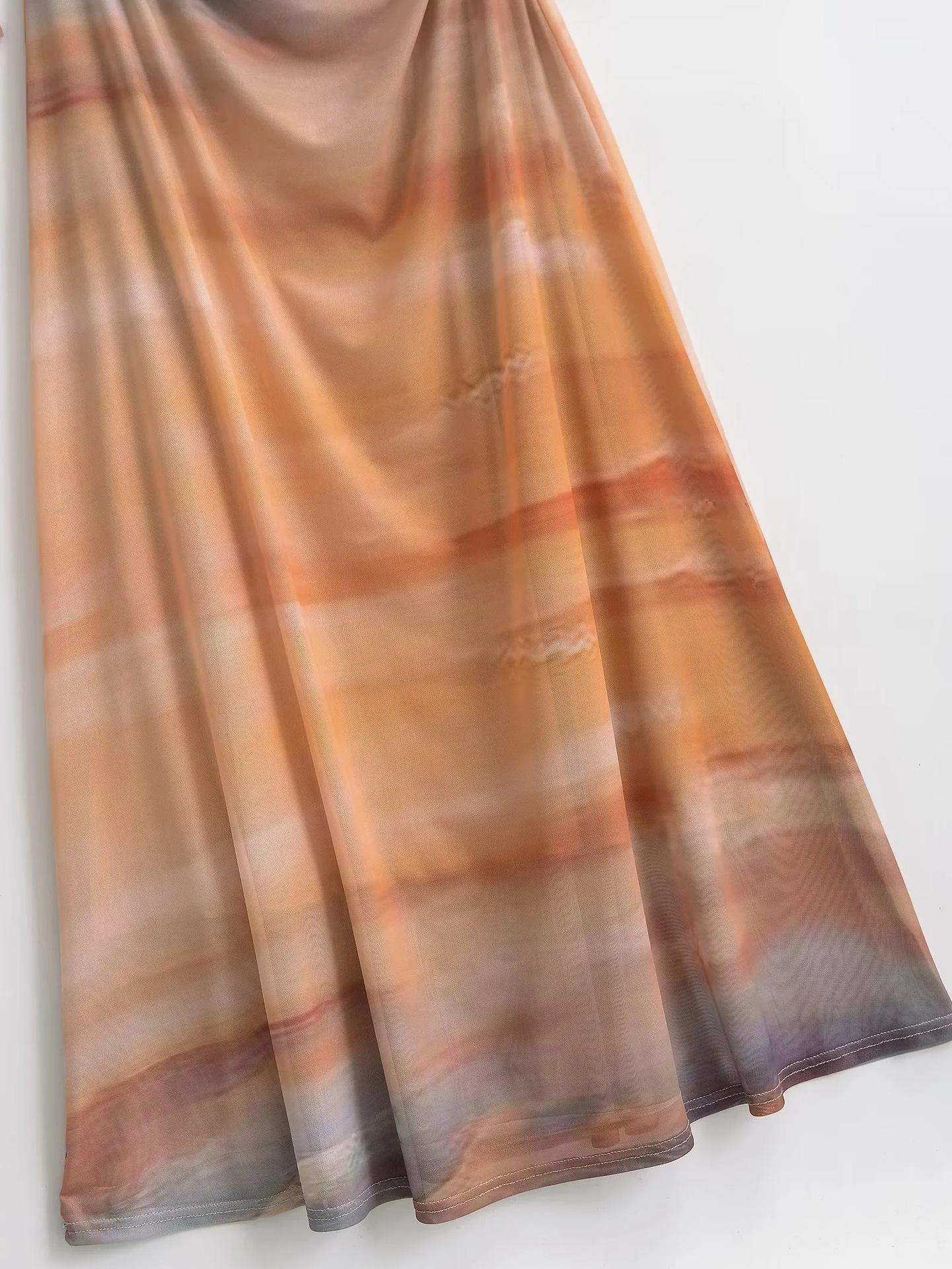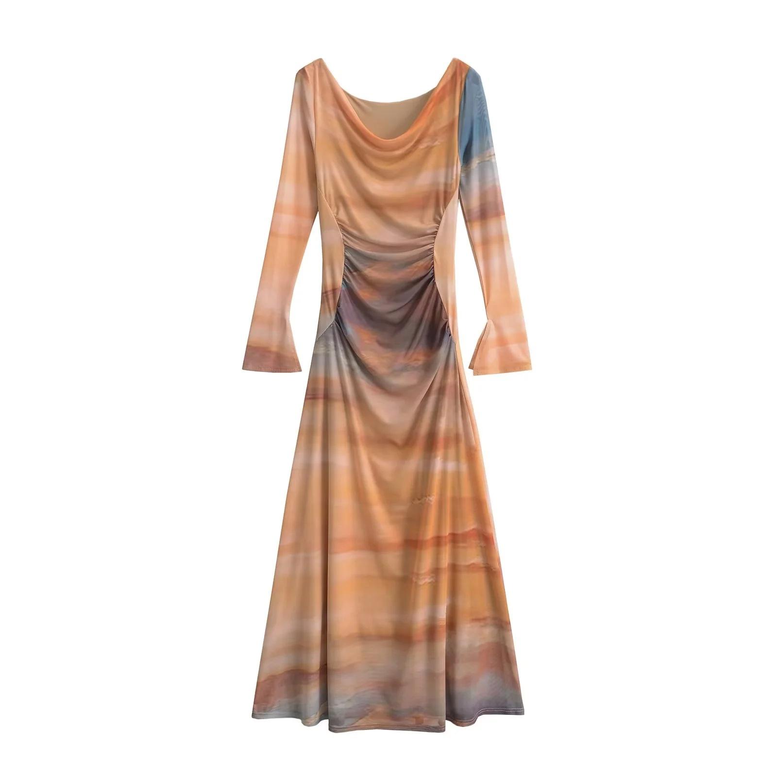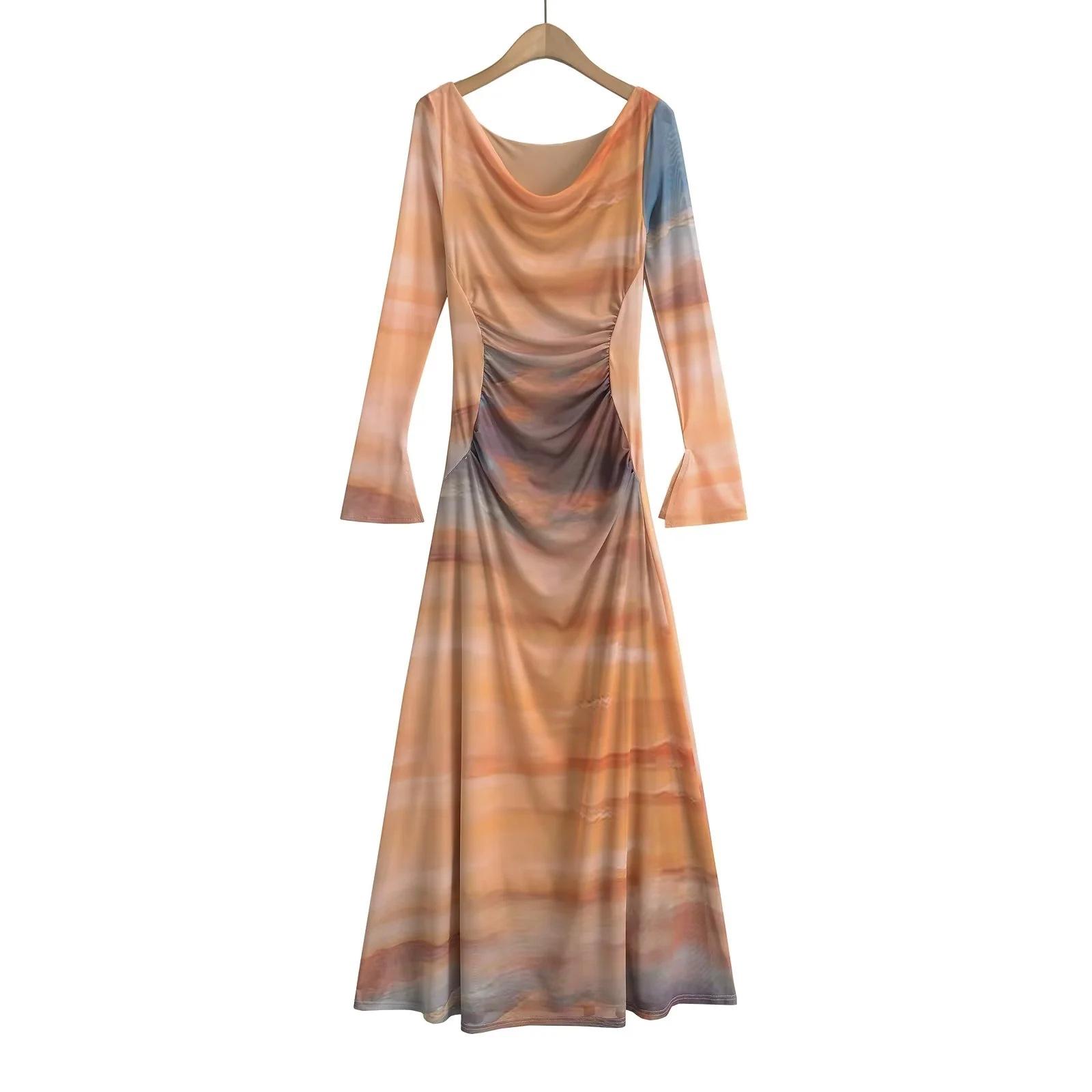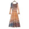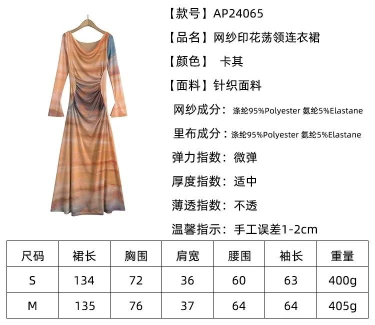 Vestido largo de malla con estampado de pintura al óleo de estilo francés para mujer, nuevo estilo de verano, cuello alto, manga larga y abertura lateral.