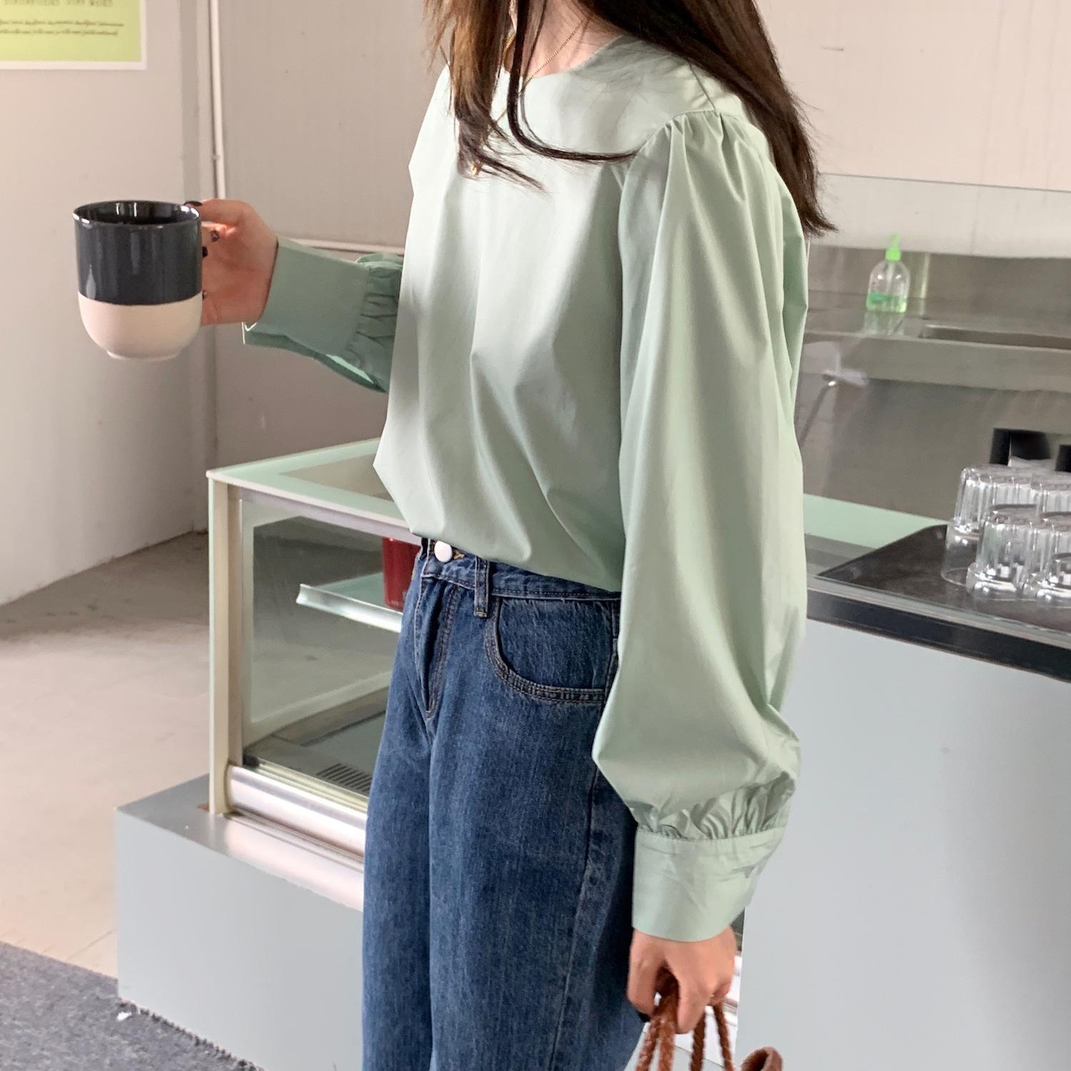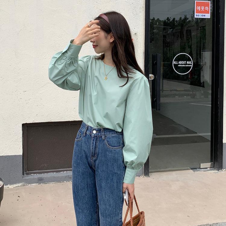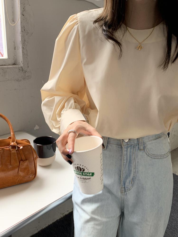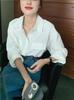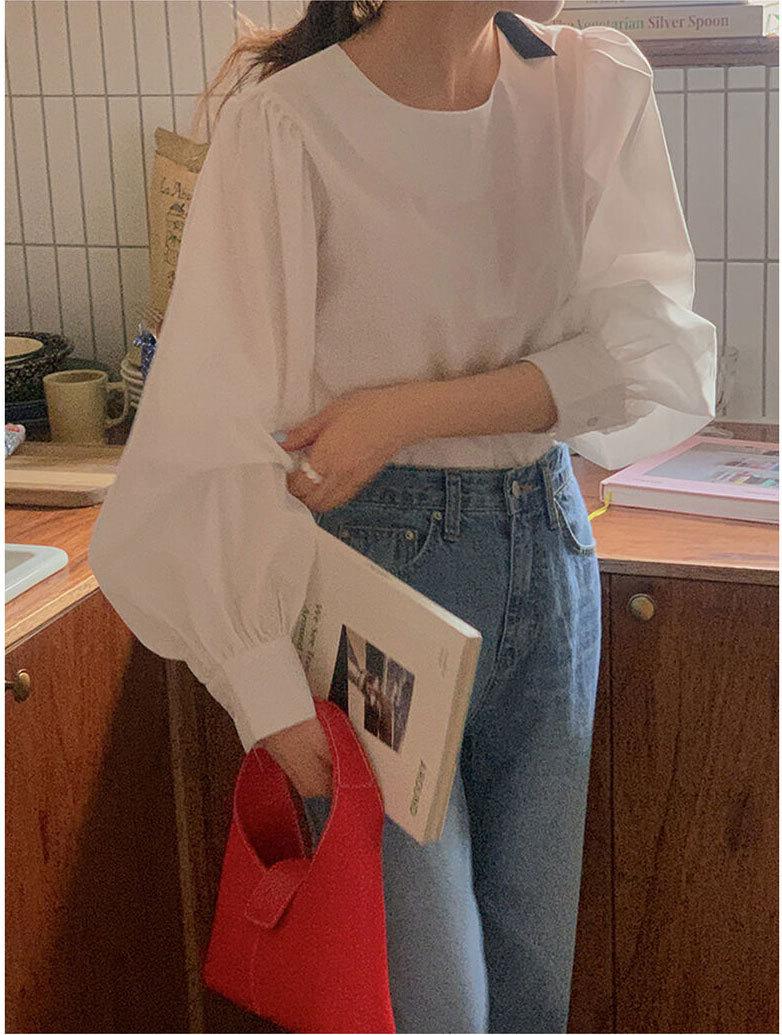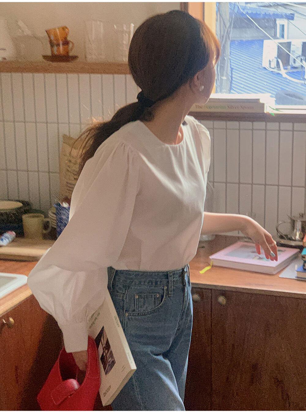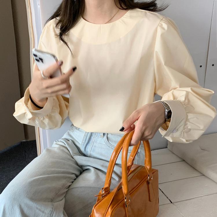 Foto real de 2025 Principios de Otoño Nuevo Estilo Coreano Ins Versátil Manga Abullonada Color Puro Camisa Blanca para Mujer
