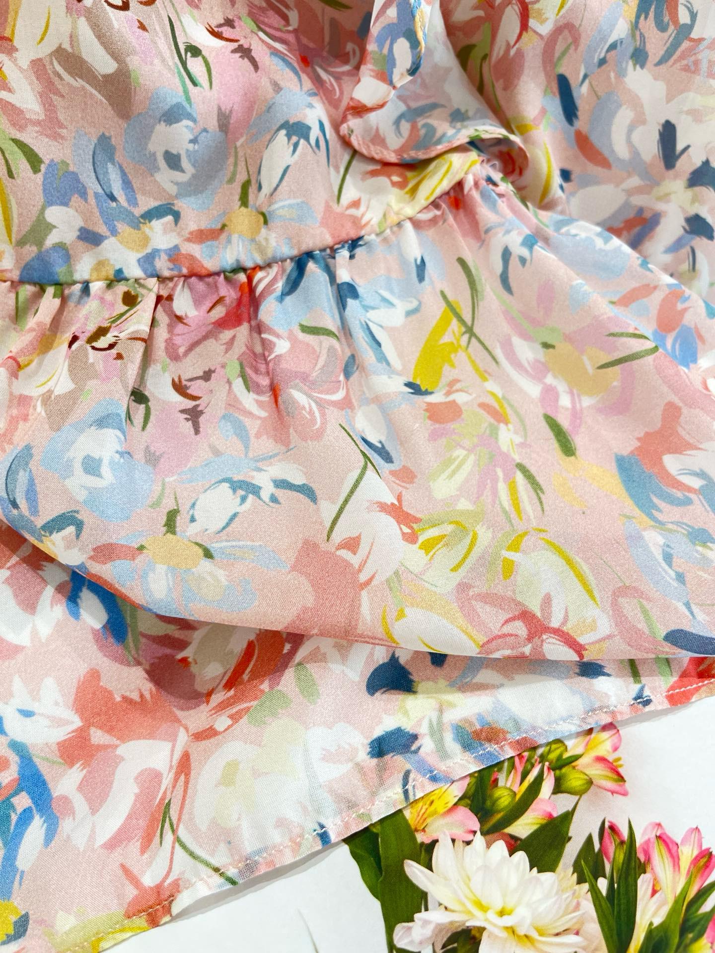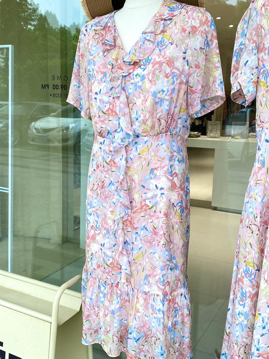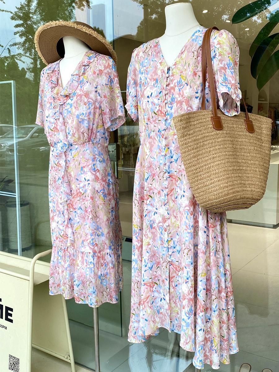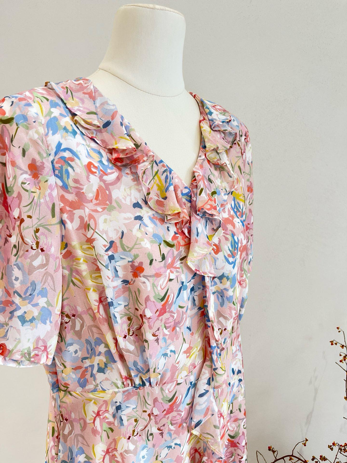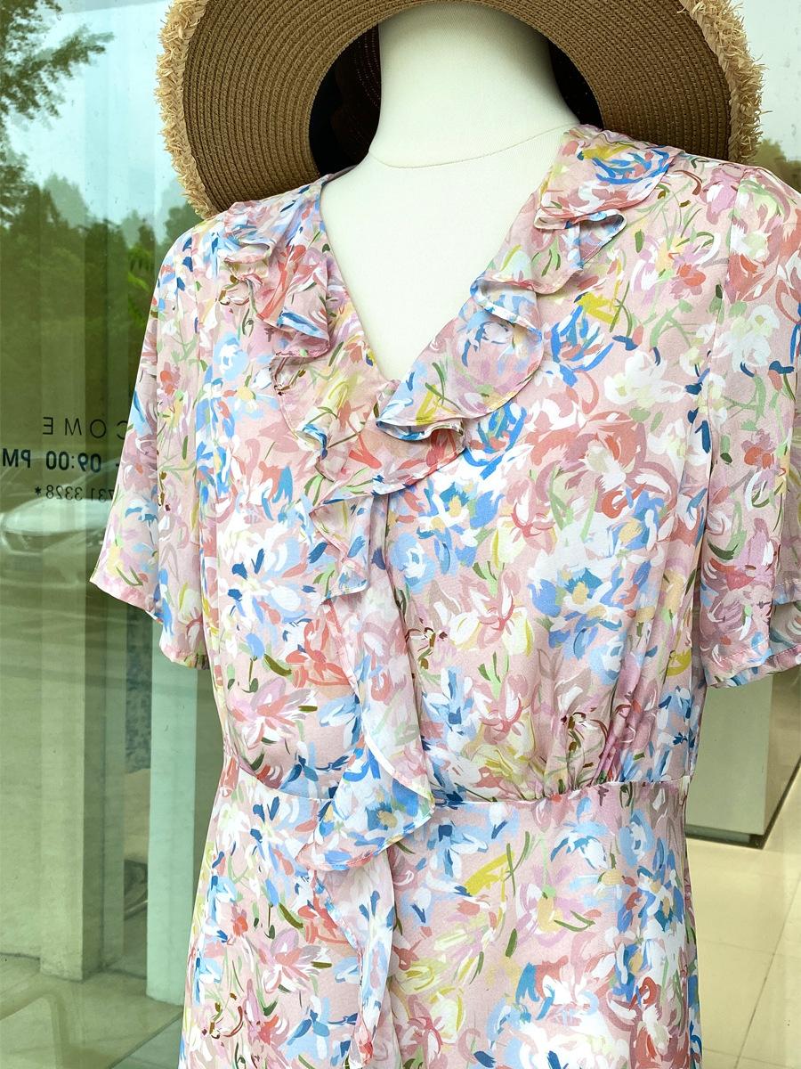 Vestido de Seda de Manga Corta para Mujer Primavera y Verano 2025 Nuevo Estampado Francés Cintura Estilo Joven Falda de Seda de Morera