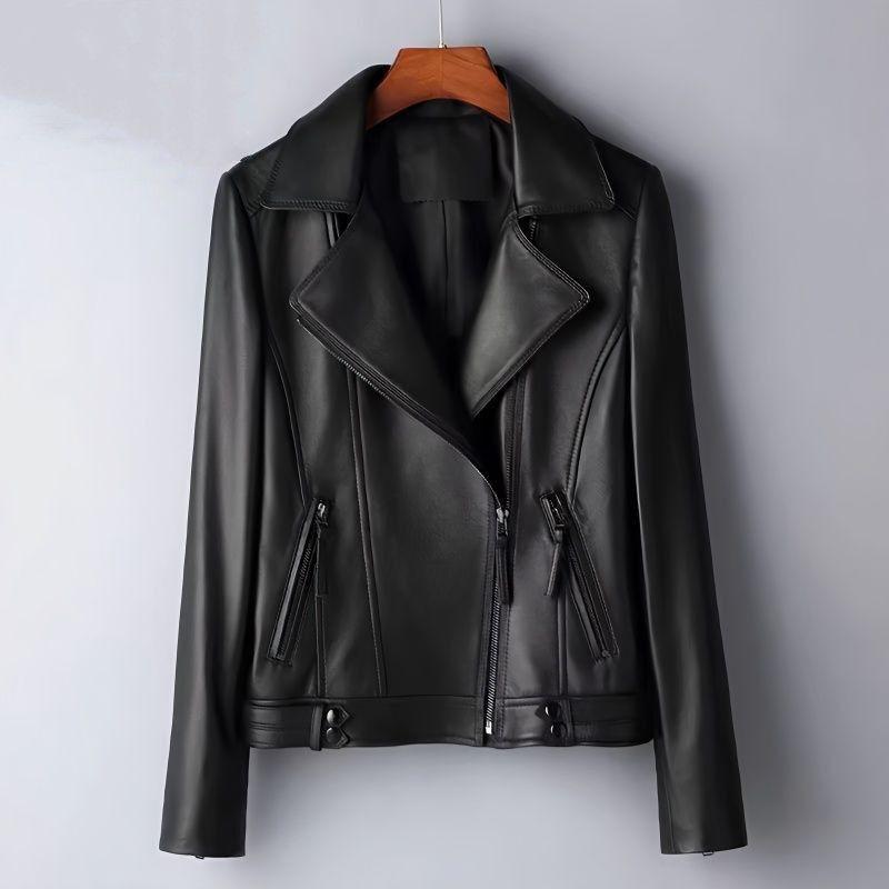 Haining Cuero Chaqueta de Cuero Corta Ajustada para Mujer Cuello Chaqueta de Cuero de Motociclista Abrigo de Primavera y Otoño Estilo Occidental