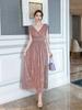 2026 Ropa Nueva de Verano para Mujer Diseño Francés de Cuello en V Cordón Manga Corta Cintura Ajustada Vestido Plisado de Línea A 21248