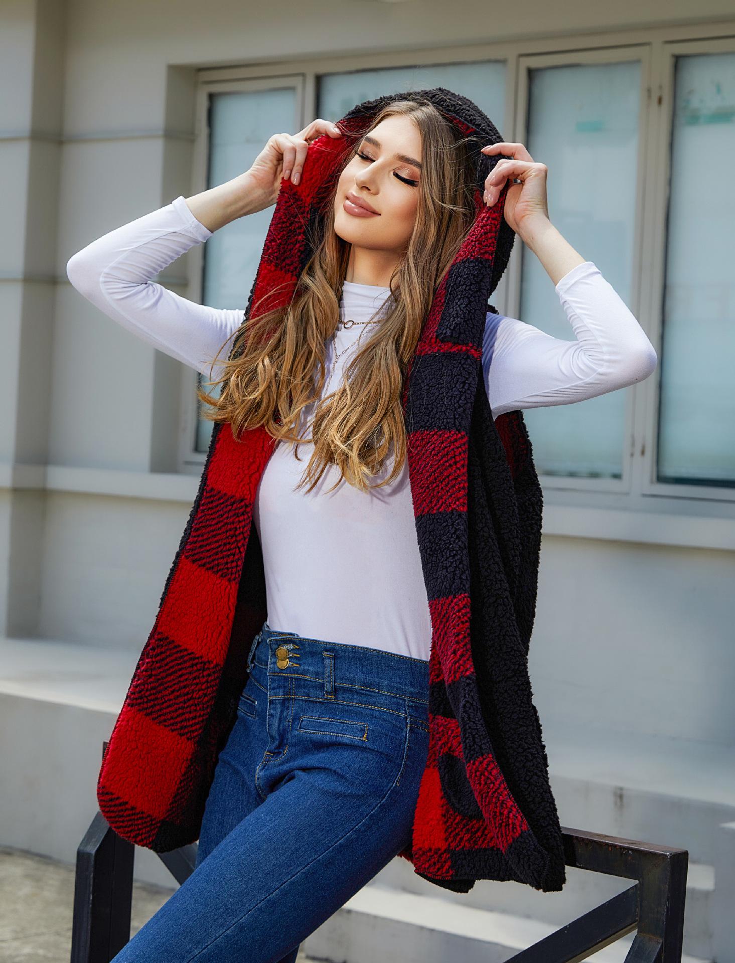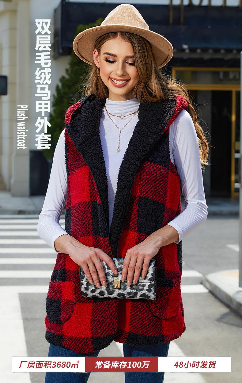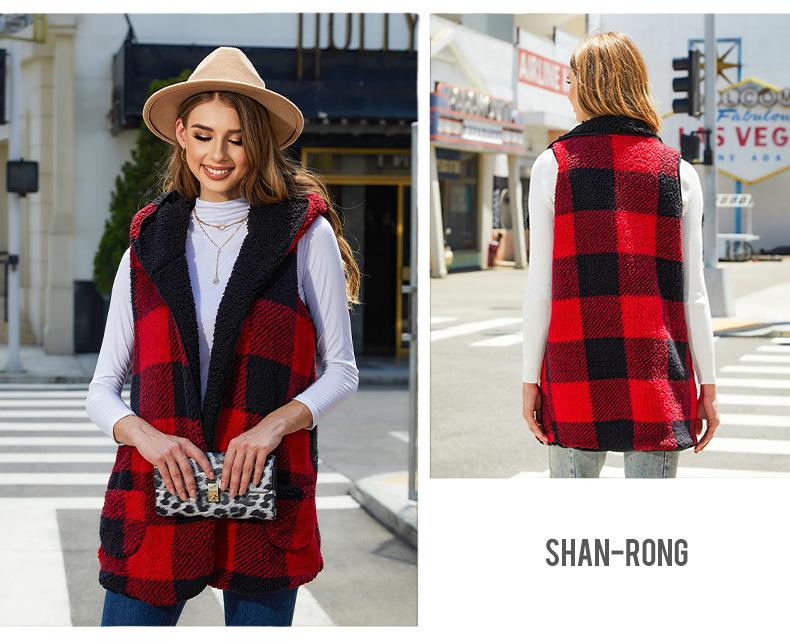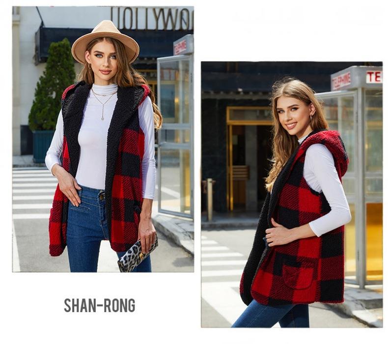 Cárdigan holgado con capucha y hebilla de terciopelo para mujer, estilo europeo y americano, a cuadros, de felpa, para otoño