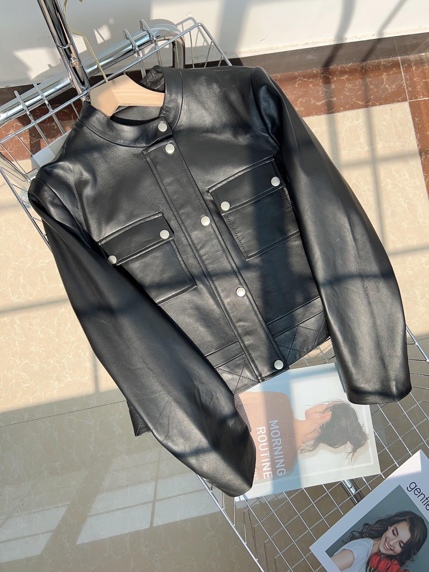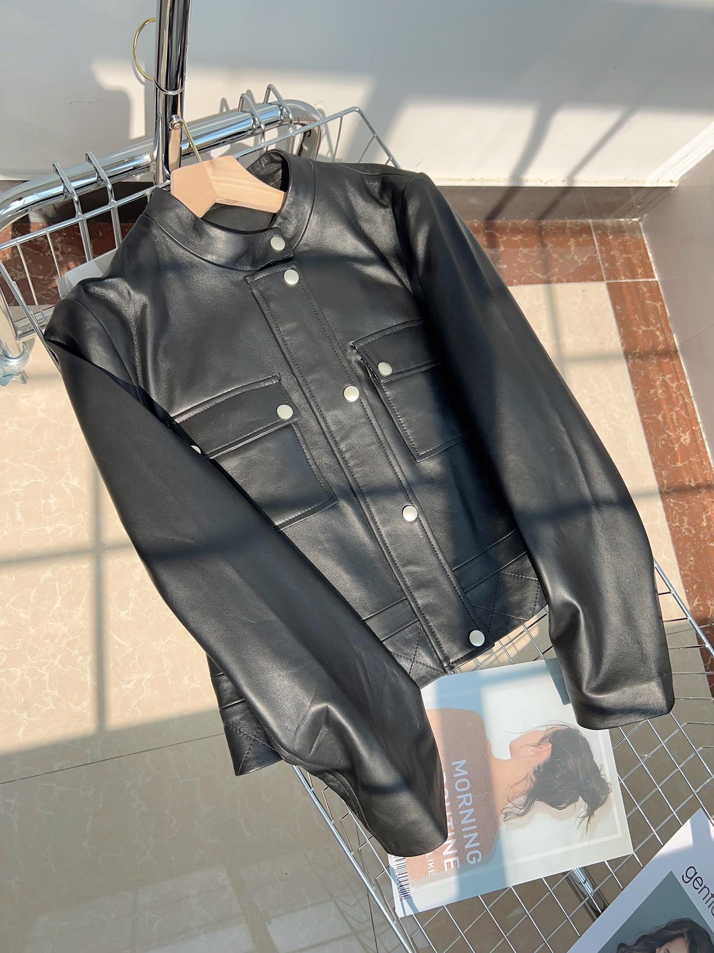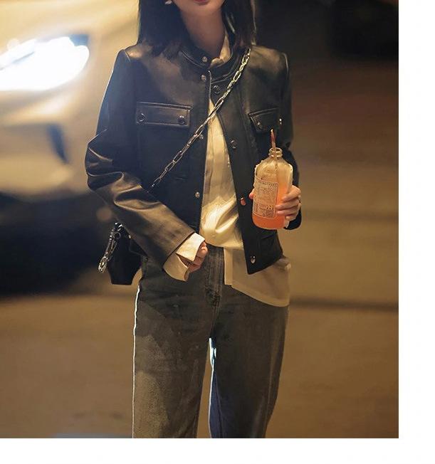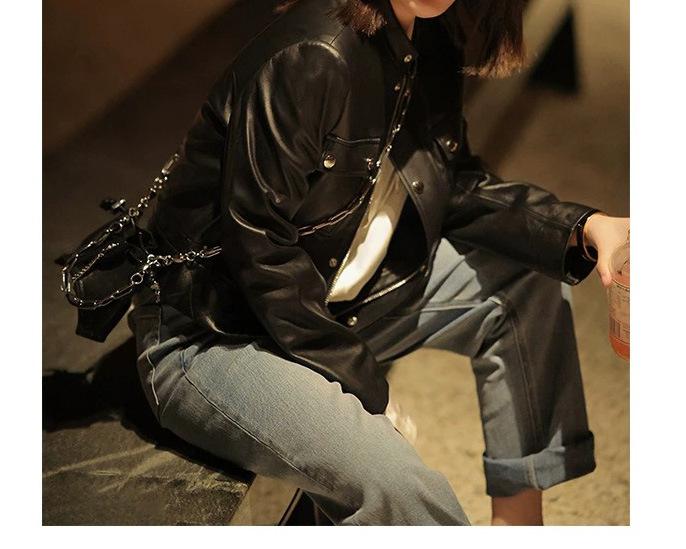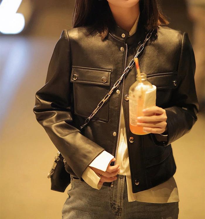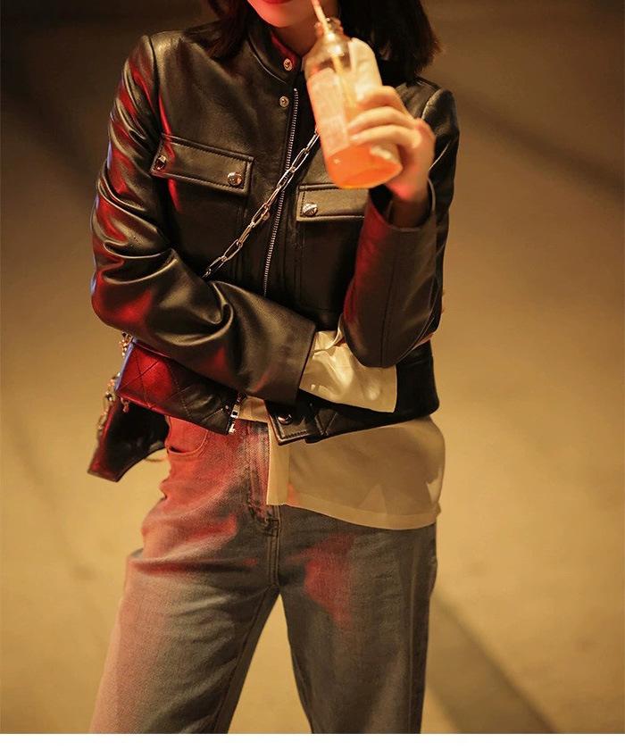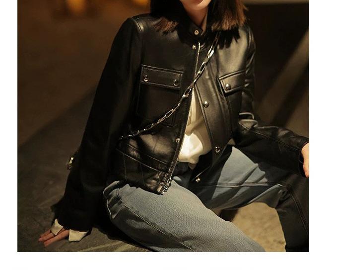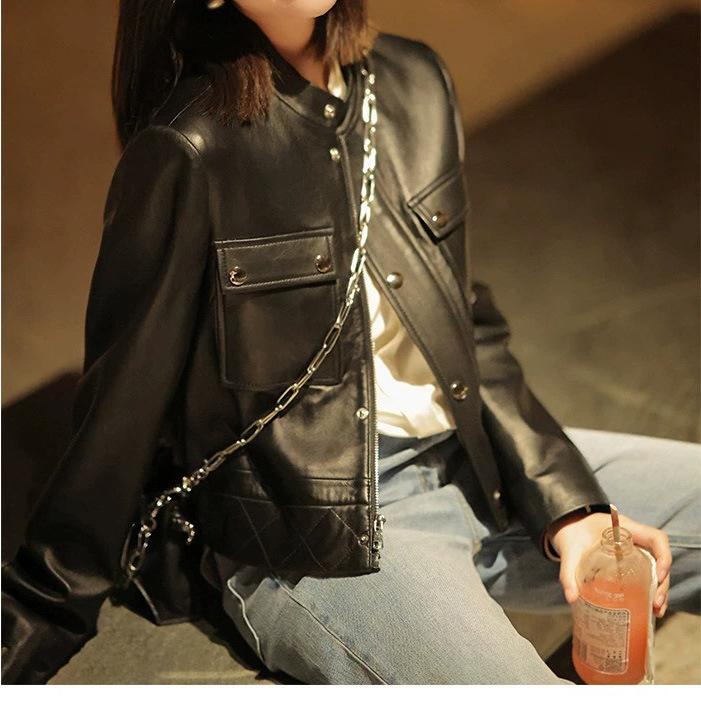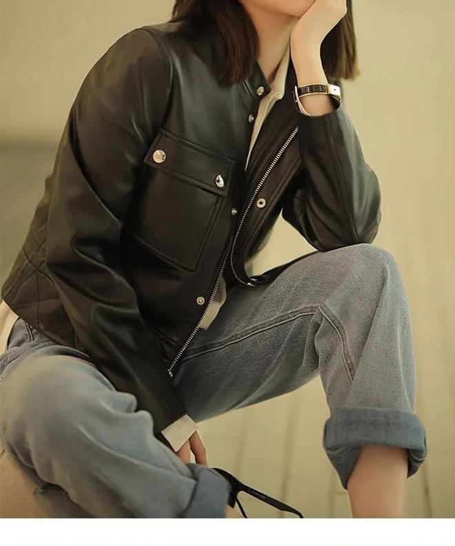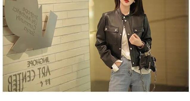 2025 Primavera Nuevo Pequeño Corto Cuello Mao Chaqueta de Cuero Genuino para Mujer Chaqueta de Piel de Oveja Otoño Guapo Chaqueta de Motociclista