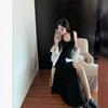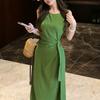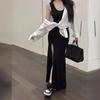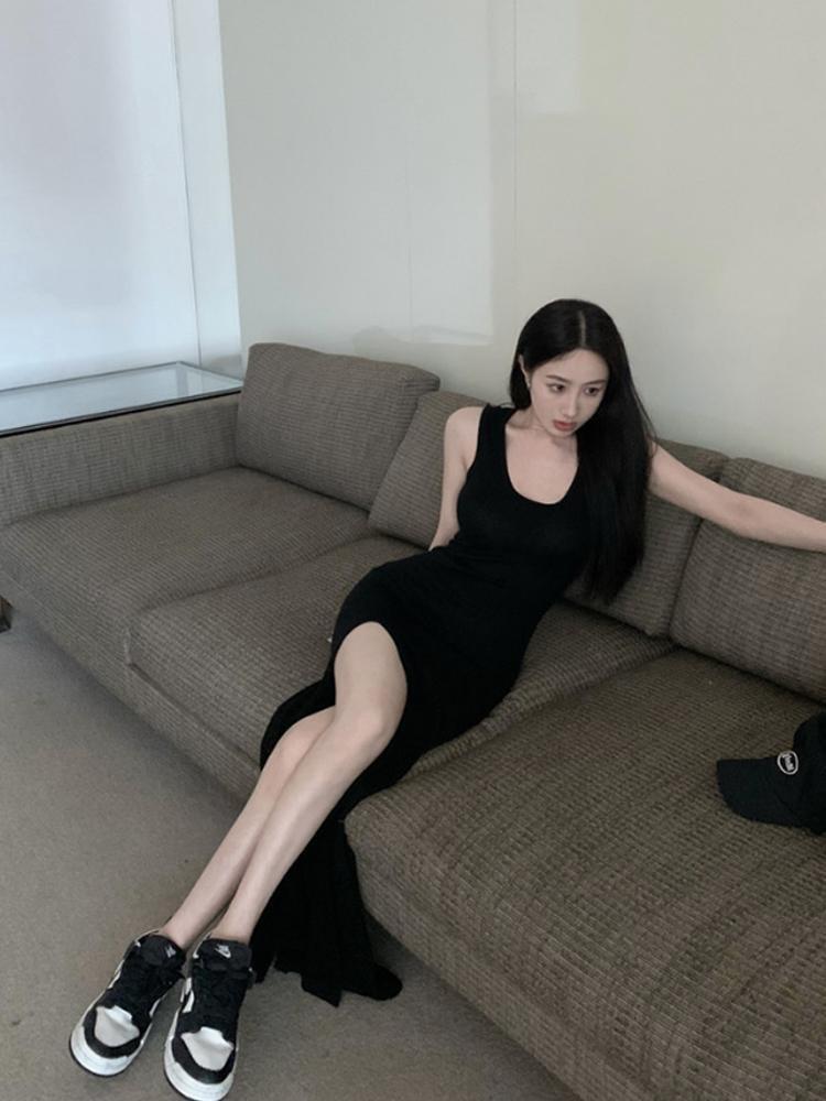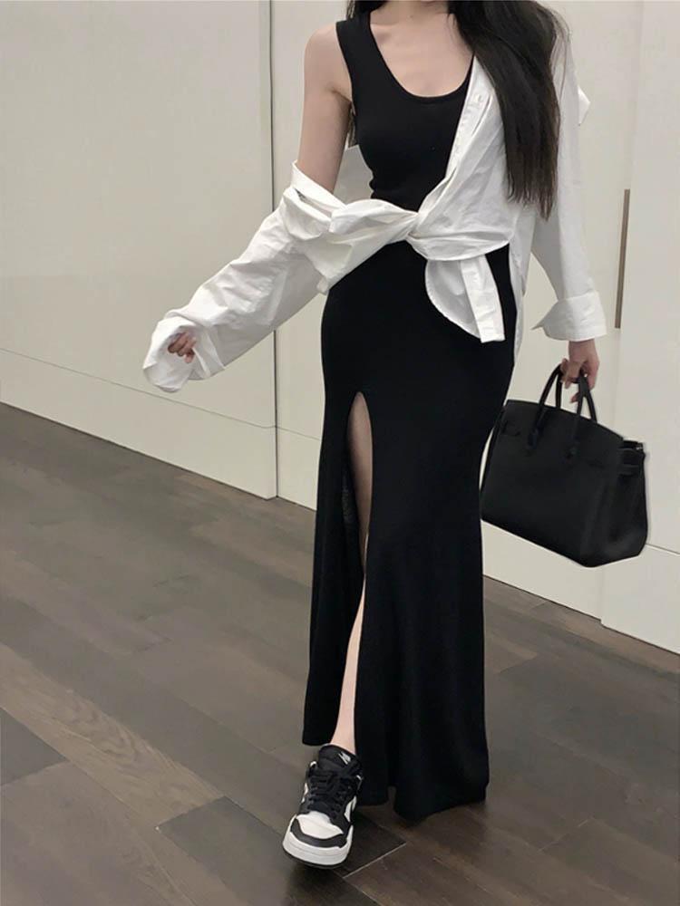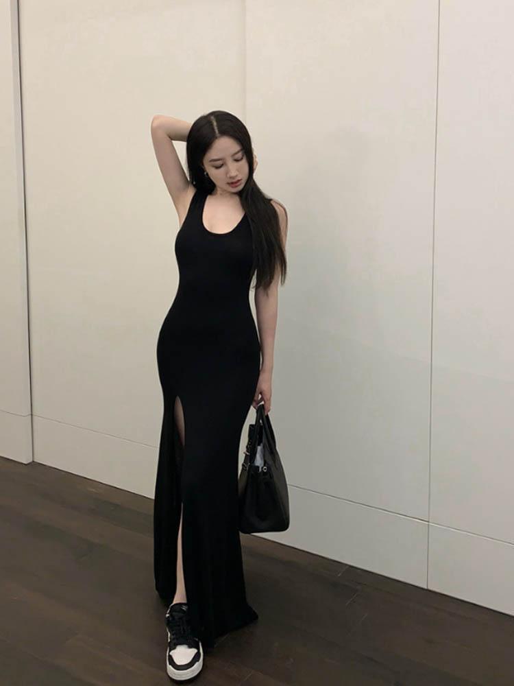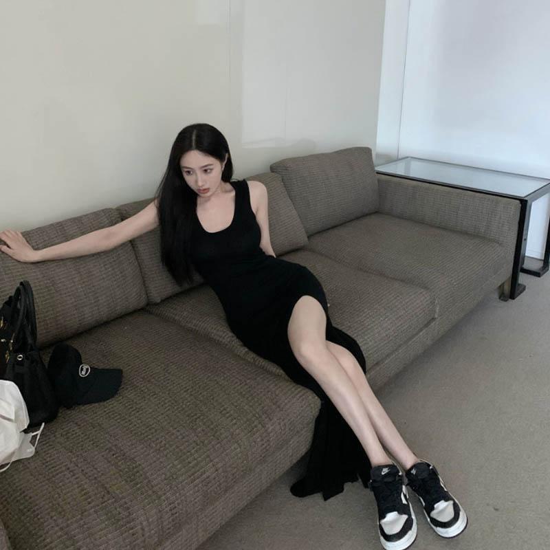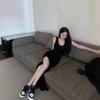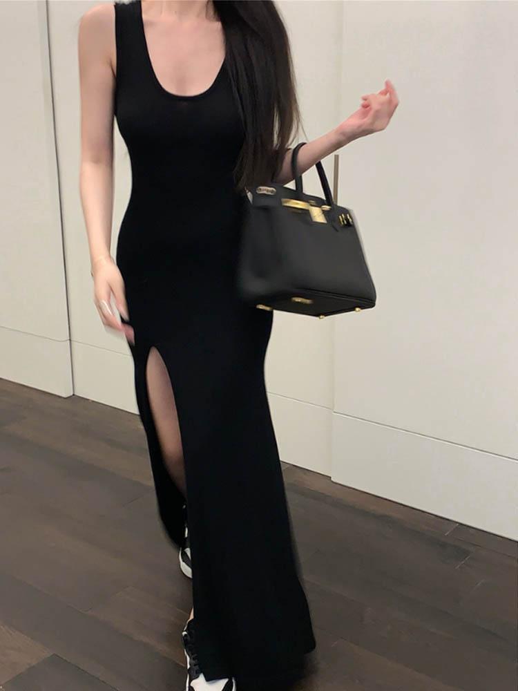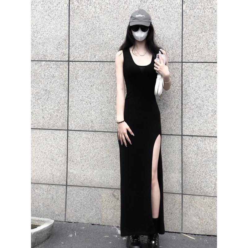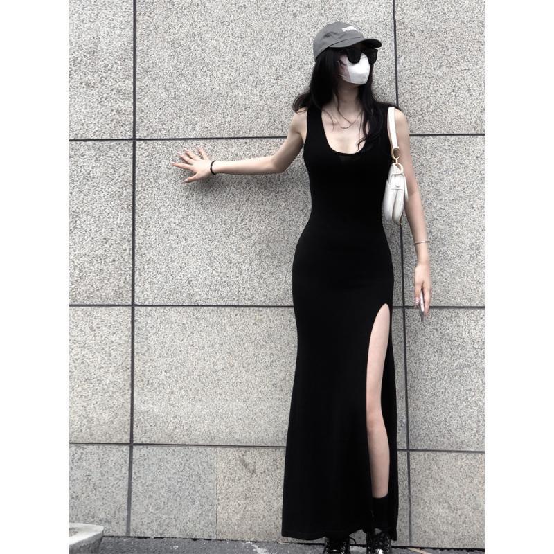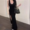 Estilo Deseo Puro Retro Chaleco Sin Mangas Verano 2024 vestido Mujer Ajustado Negro Tirantes Abertura Falda Sobre la Rodilla