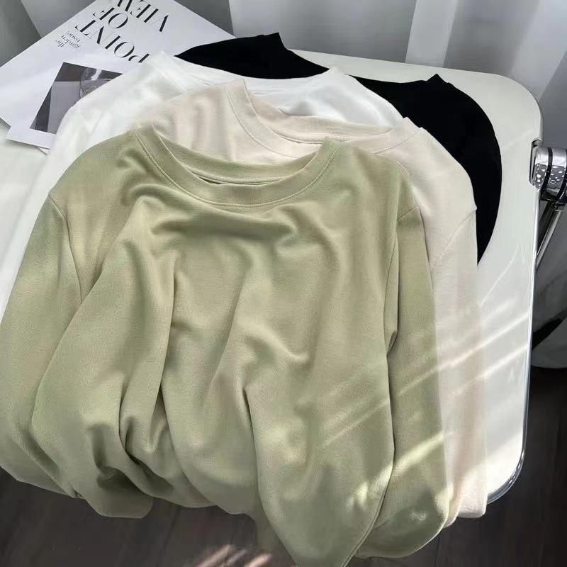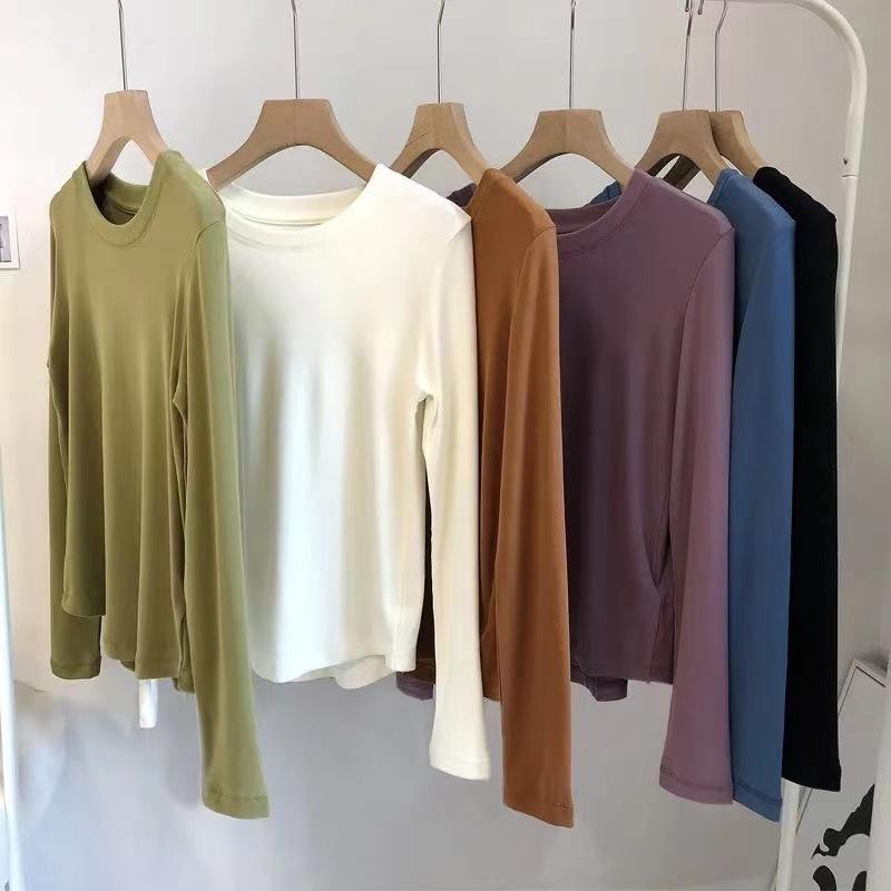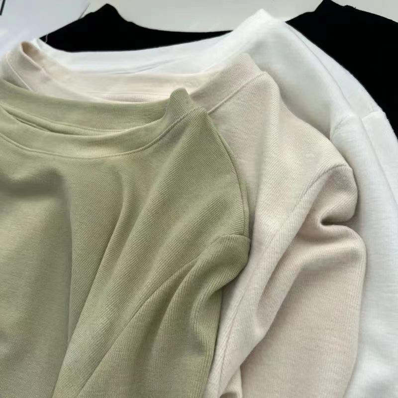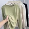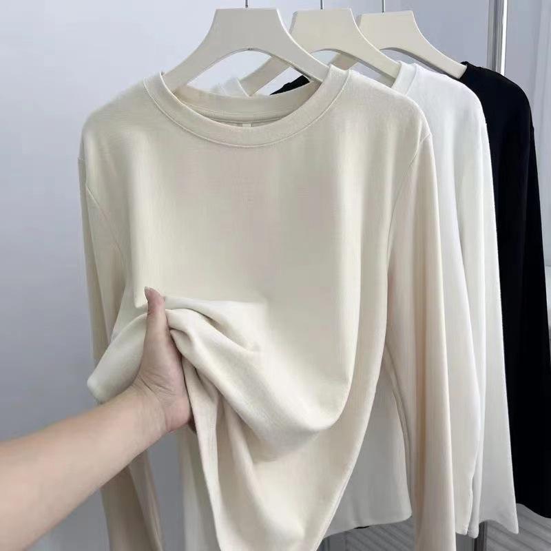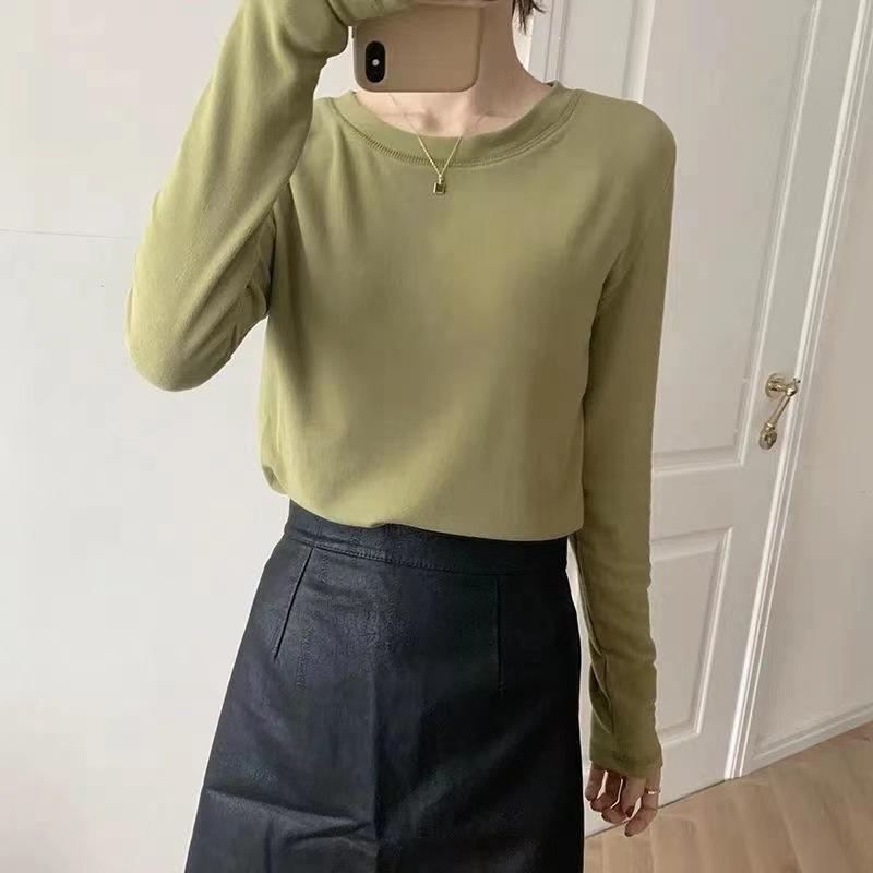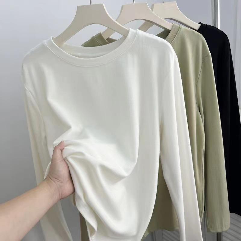 | Camiseta de manga larga con cuello redondo de algodón de alta calidad para mujer, corte entallado y ajustado, nuevo estilo de otoño 22, color sólido, versión coreana de camisa de algodón puro para mujer. |