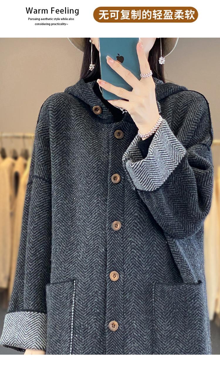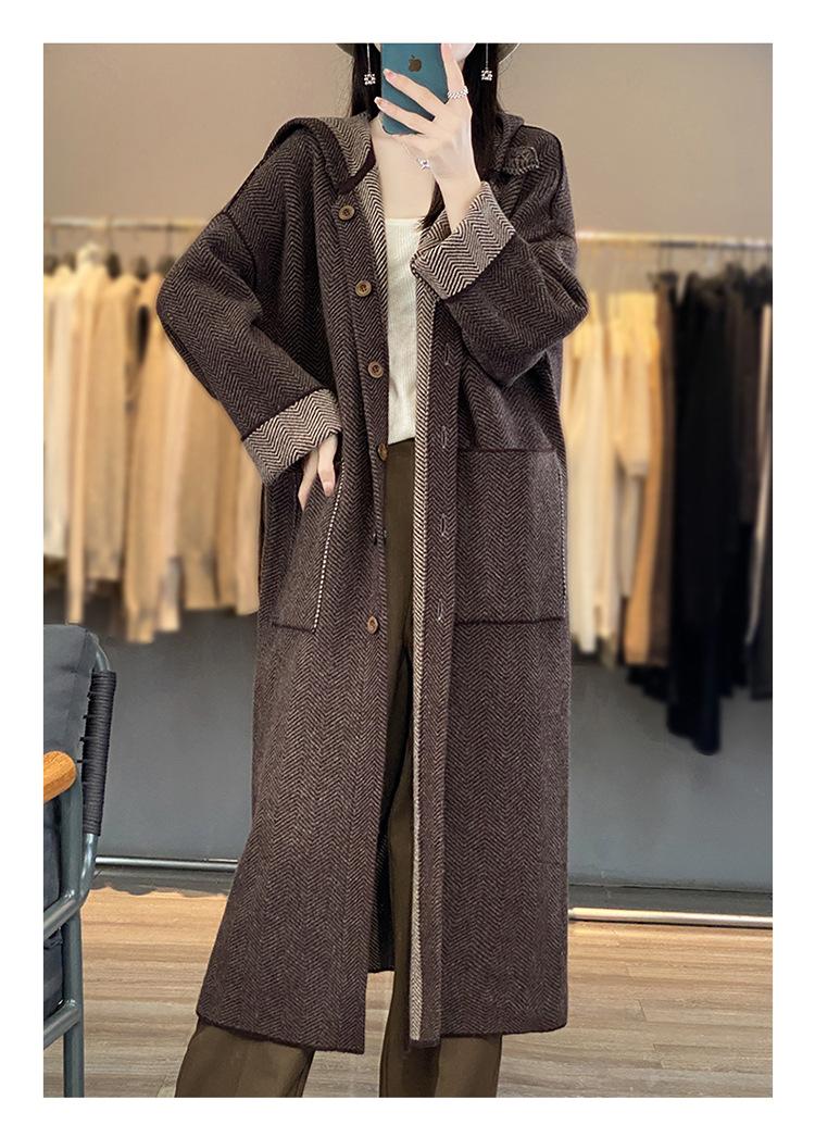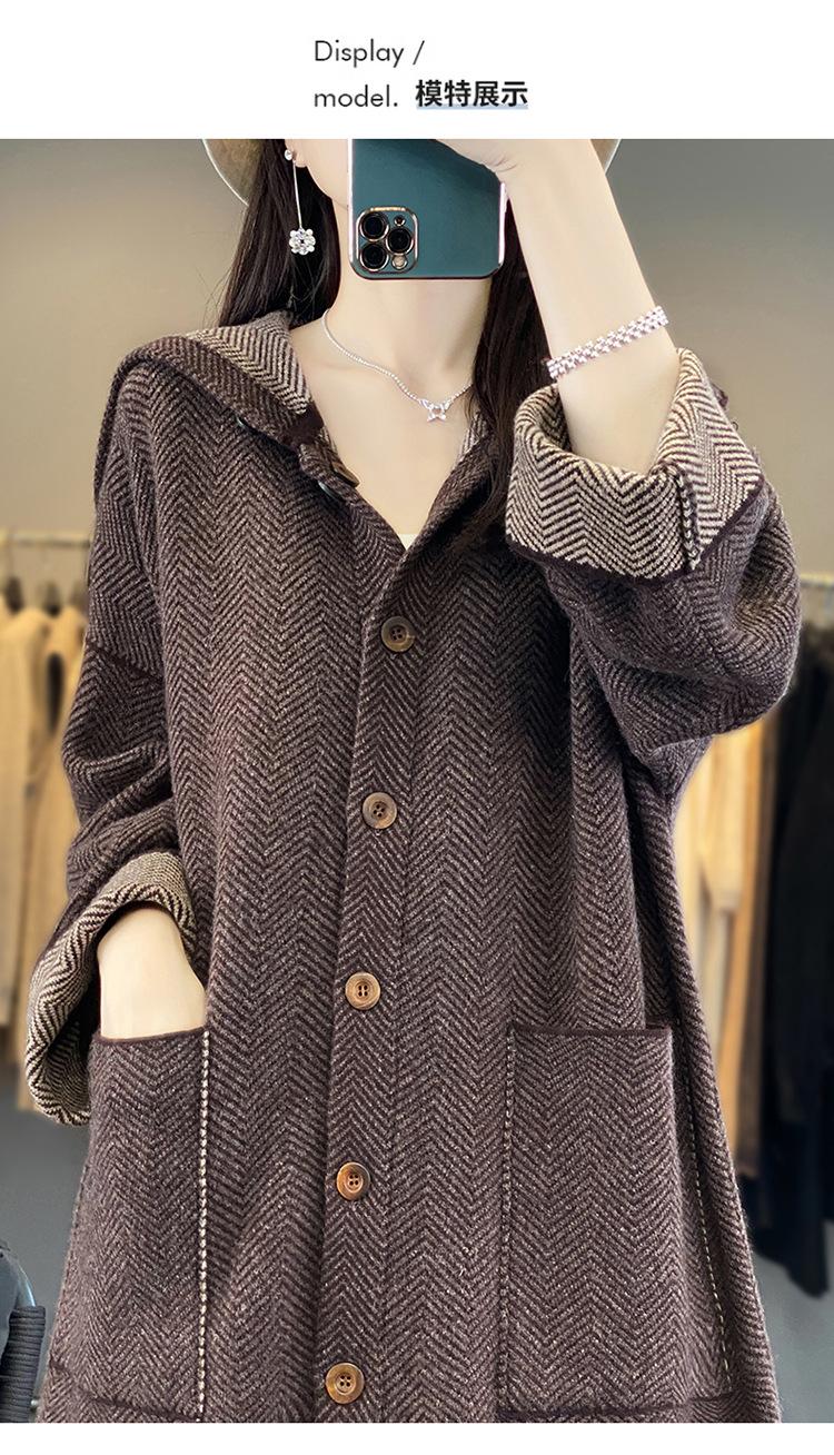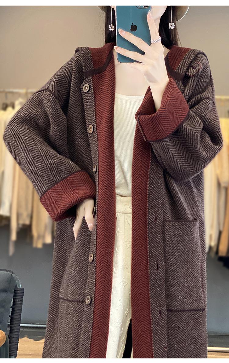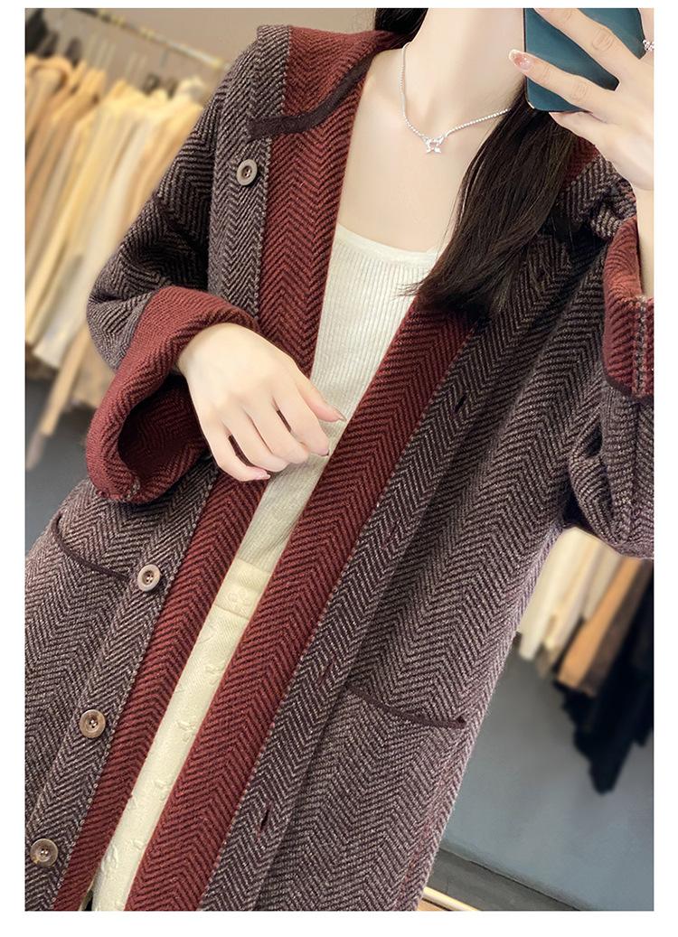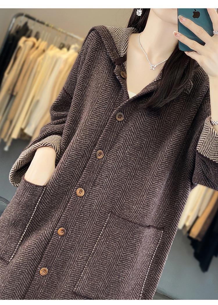 Cárdigan Vintage de Largo Medio para Mujer de Lana 100 Pura Nuevo Otoño Chaqueta No Cachemira Abrigo Exterior Grueso con Capucha