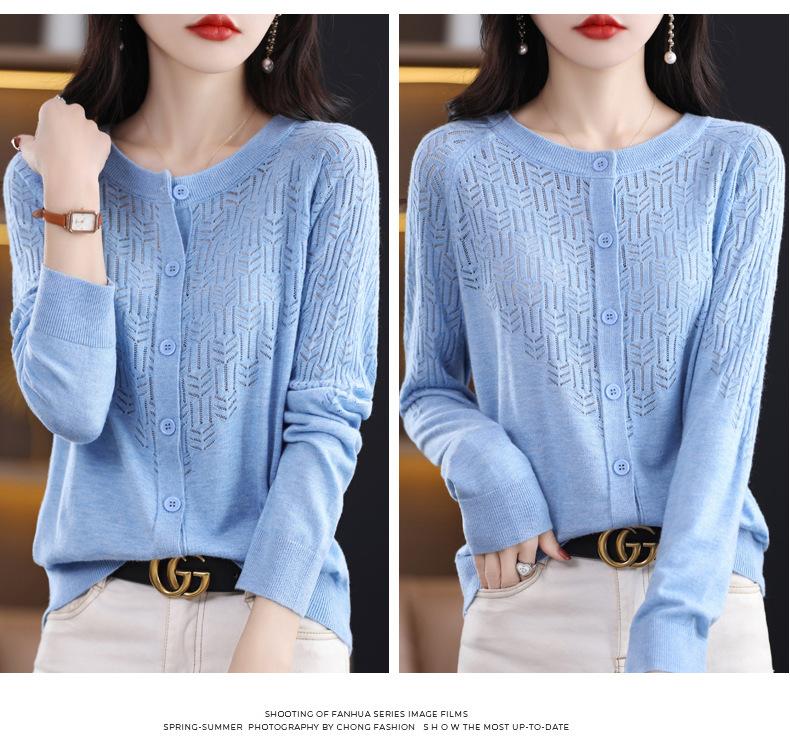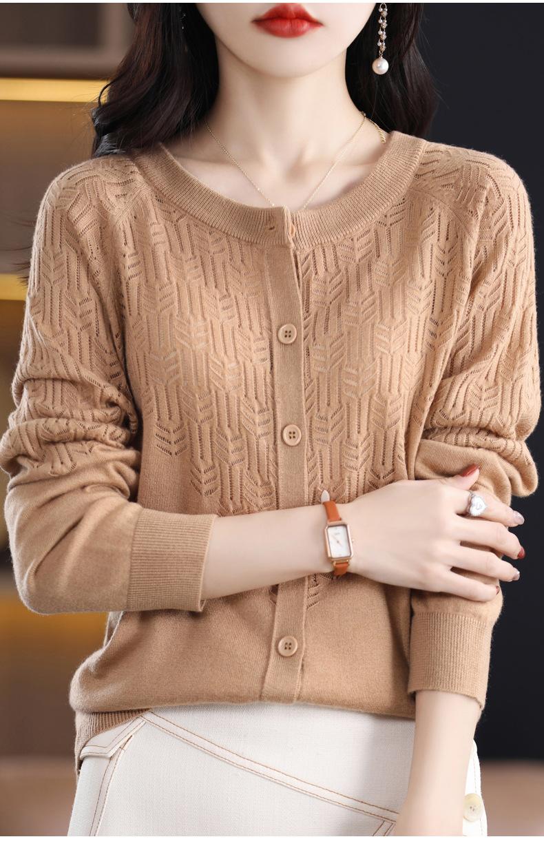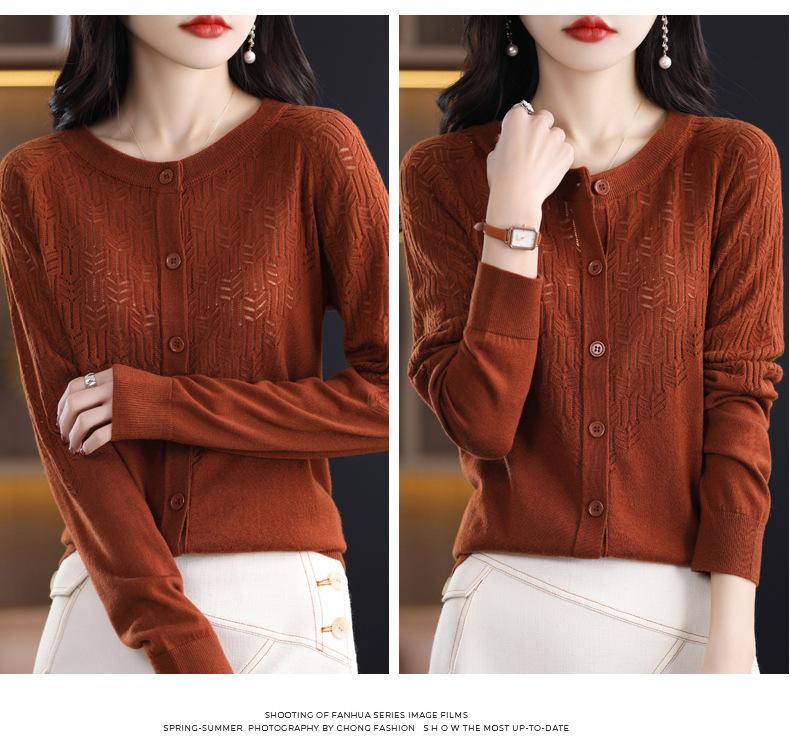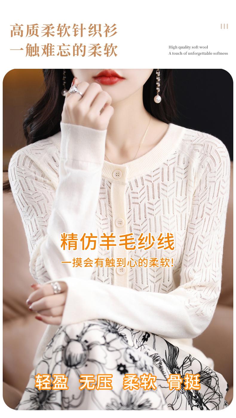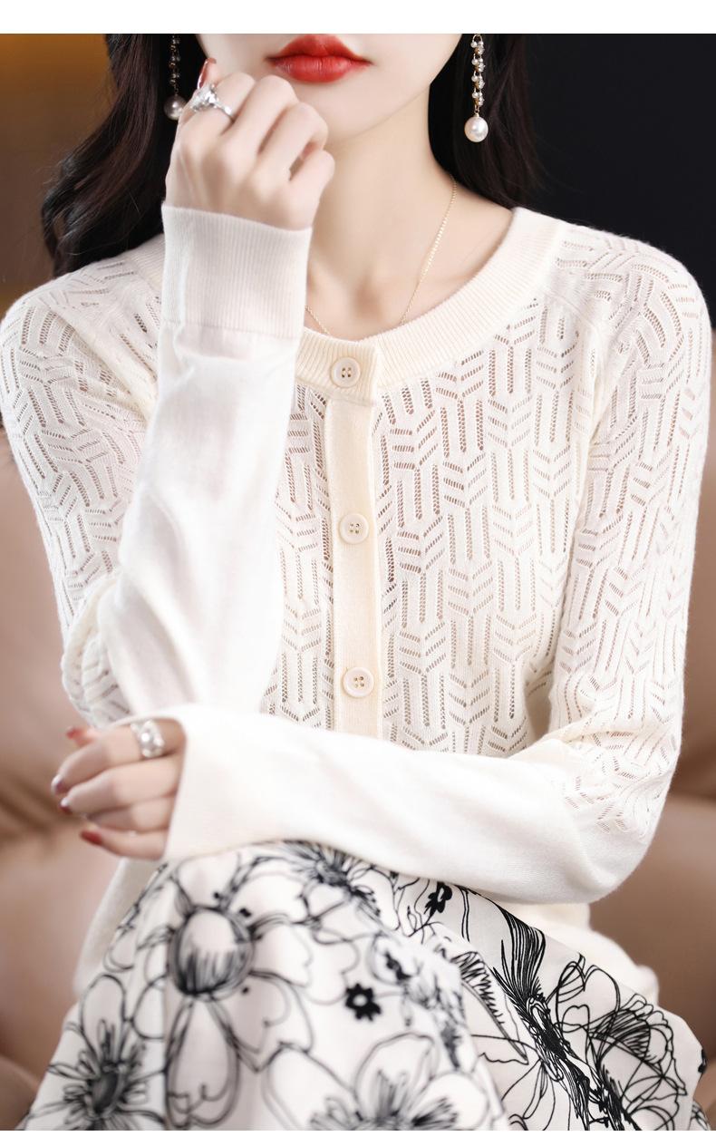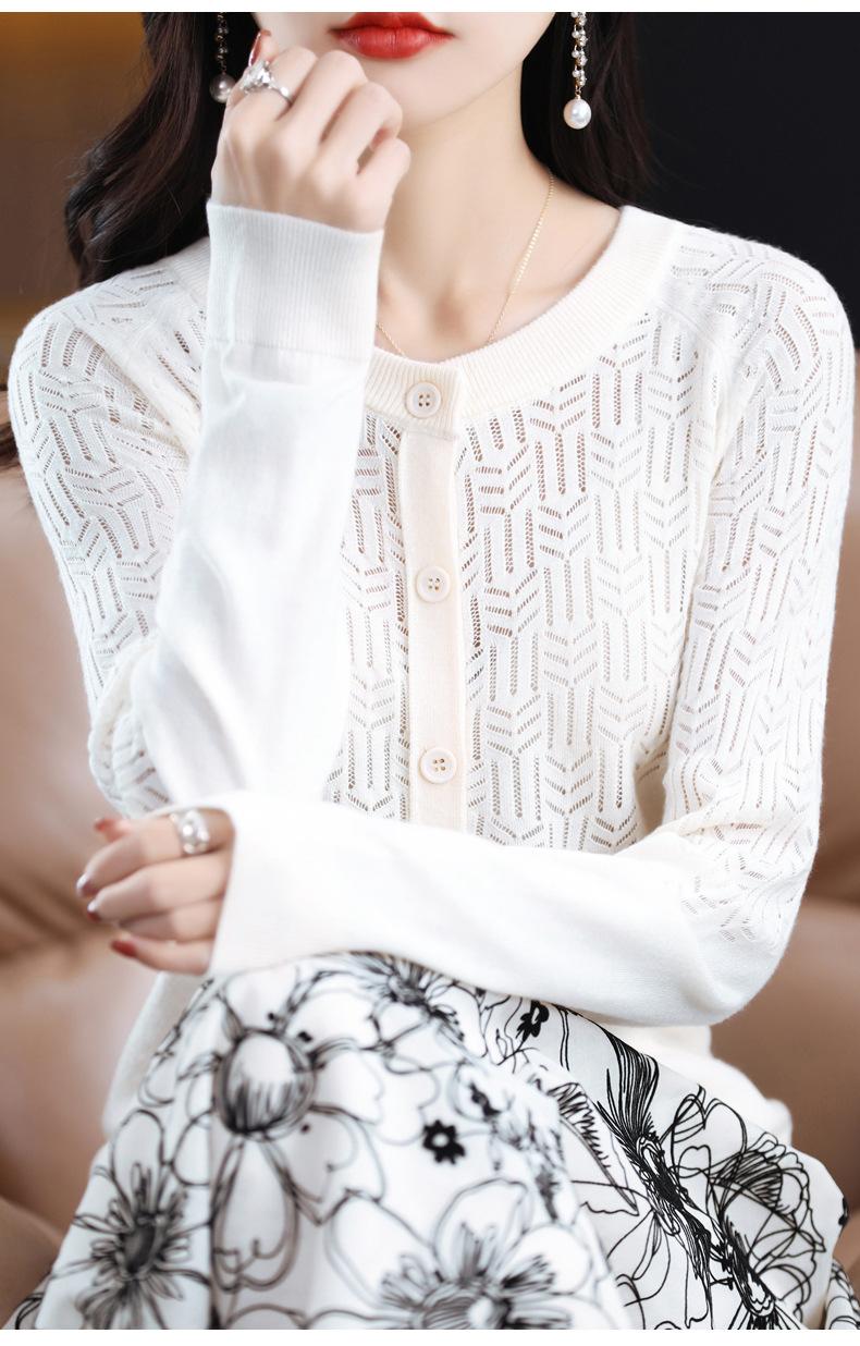 Cárdigan de Lana Fina Imitación Primavera Temprana Estilo Coreano para Mujer Camiseta Base Holgada Calada Cuello Redondo Manga Larga Top Color Sólido Chaqueta Delgada