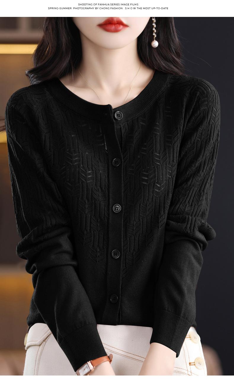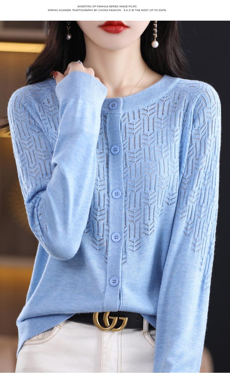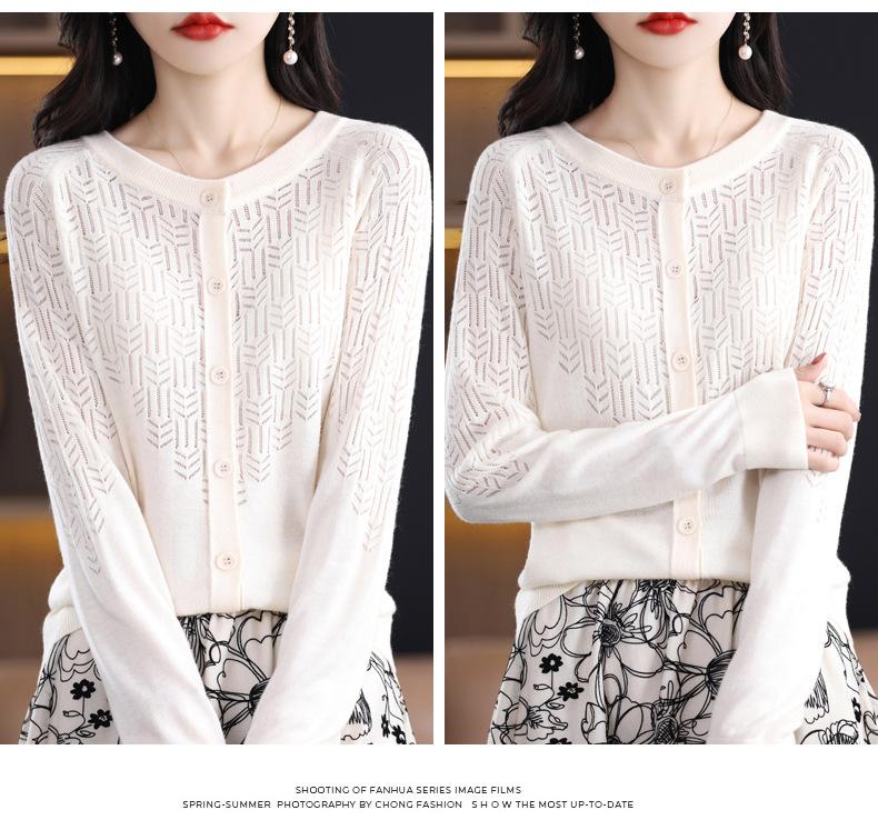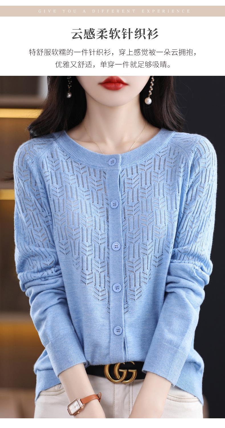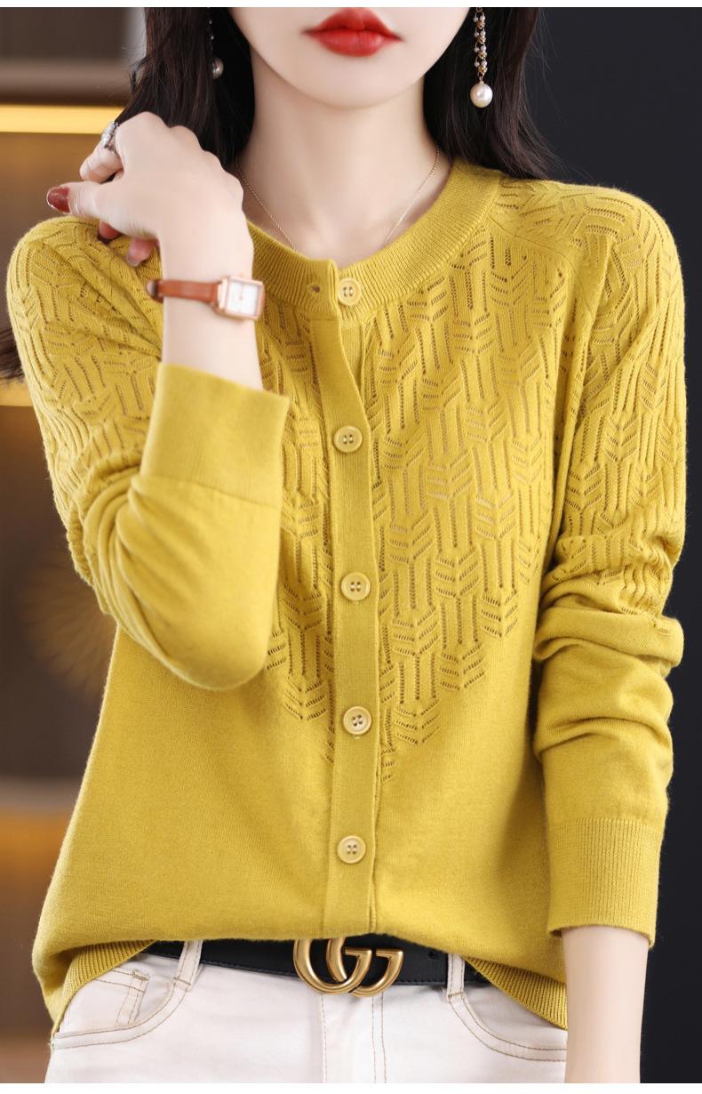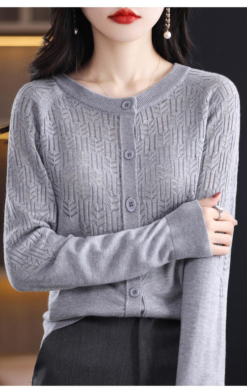 Cárdigan de Lana Fina Imitación Primavera Temprana Estilo Coreano para Mujer Camiseta Base Holgada Calada Cuello Redondo Manga Larga Top Color Sólido Chaqueta Delgada
