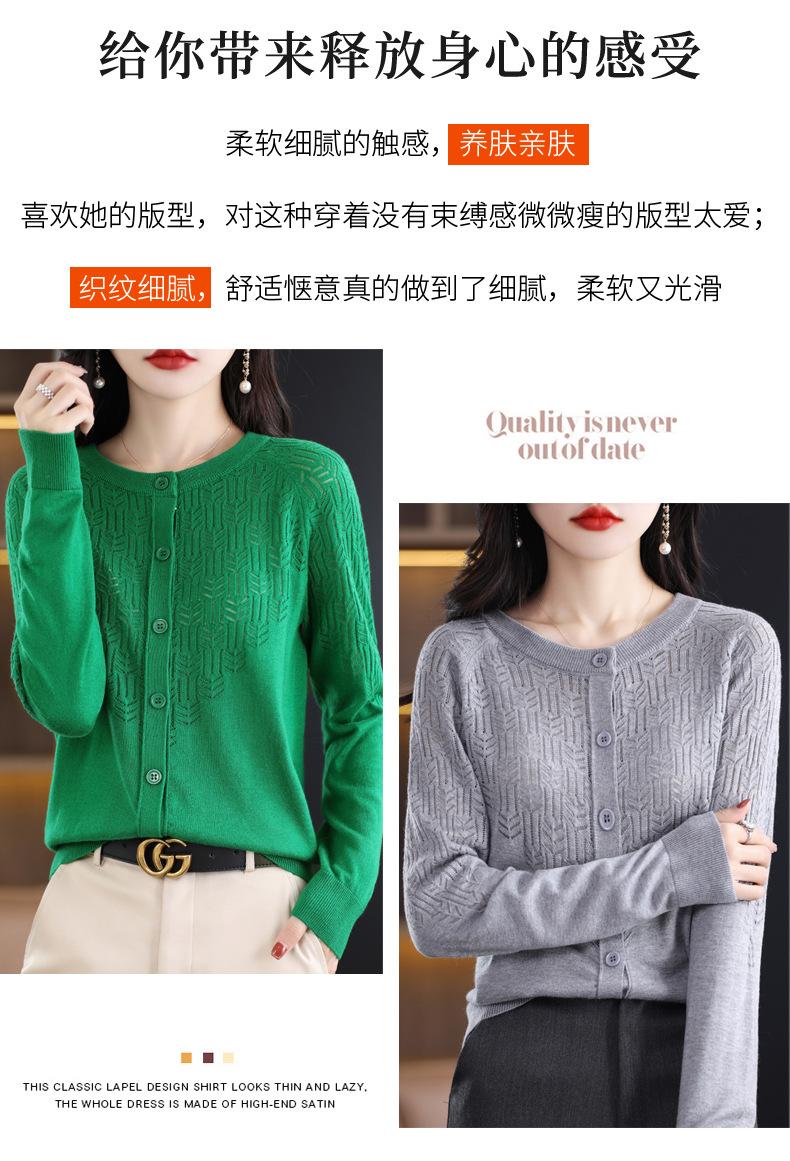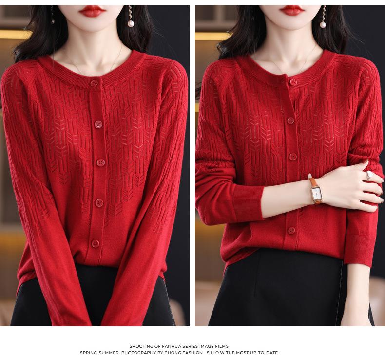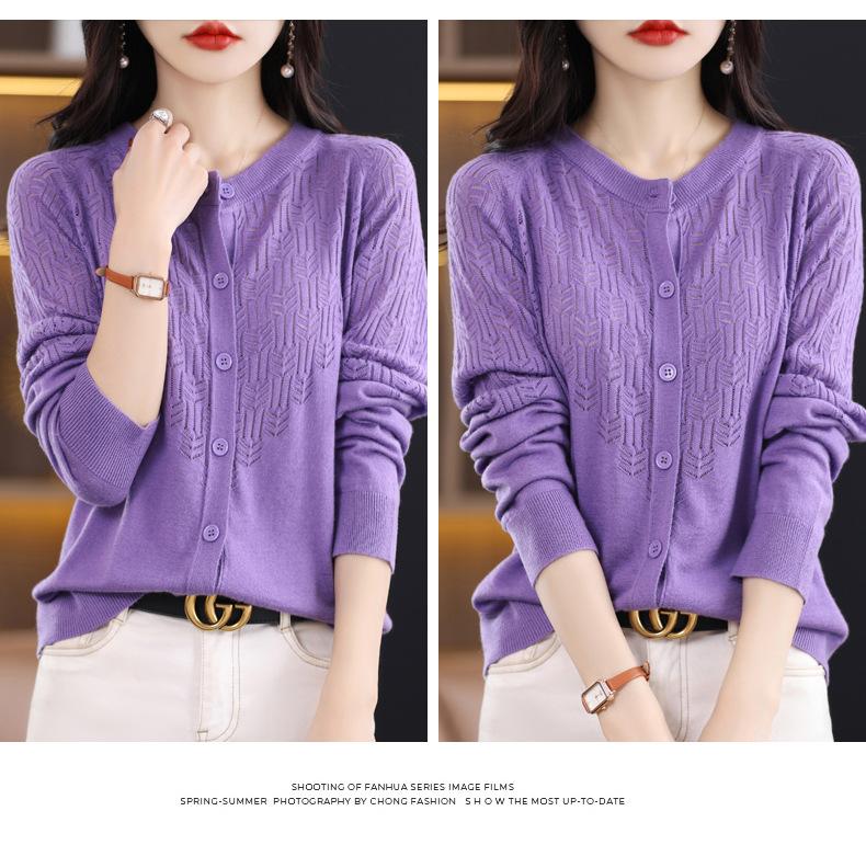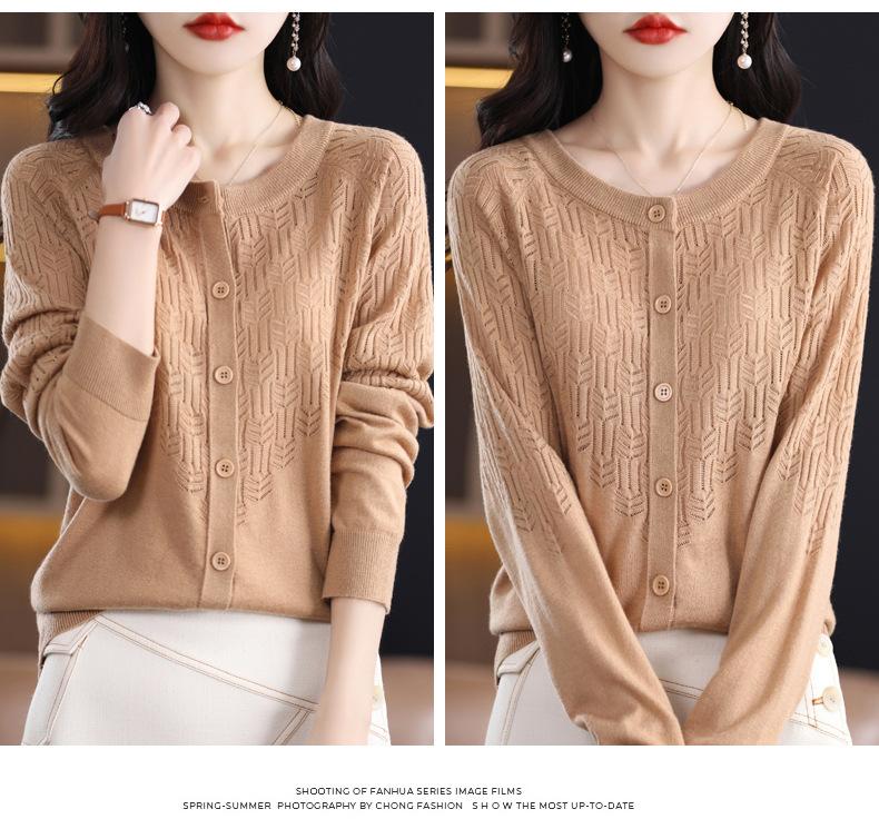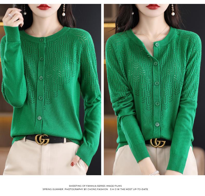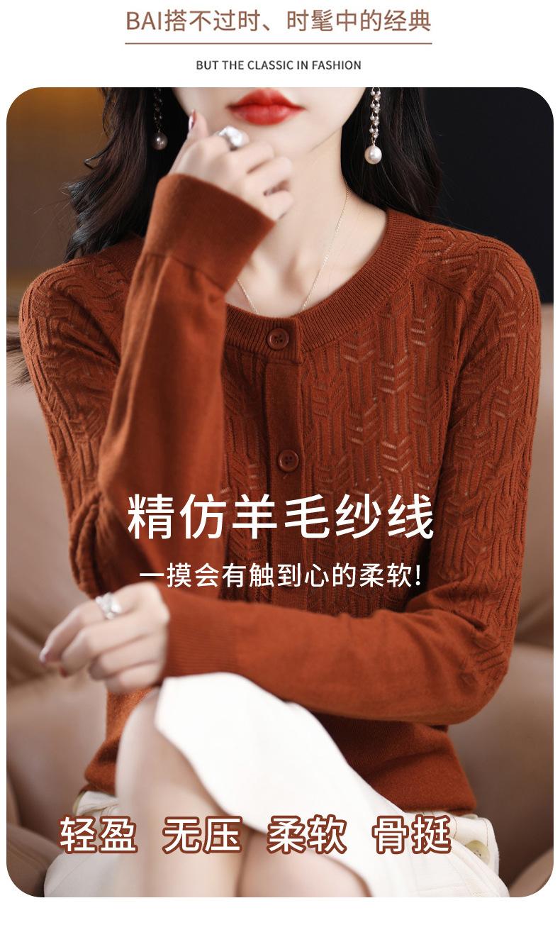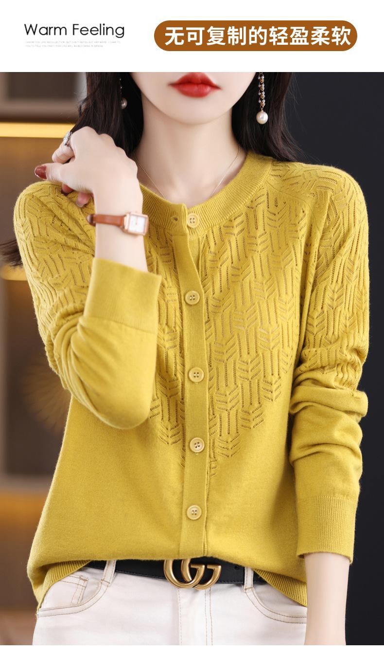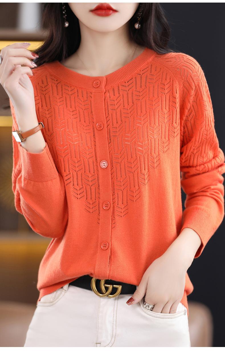Cárdigan de Lana Fina Imitación Primavera Temprana Estilo Coreano para Mujer Camiseta Base Holgada Calada Cuello Redondo Manga Larga Top Color Sólido Chaqueta Delgada
