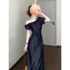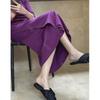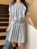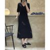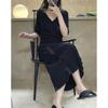 Lu Fu Verano Nuevo Estilo Coreano Vestido de Manga Corta con Cuello en V Plisado Ajustado Abertura Falda Larga para Mujer