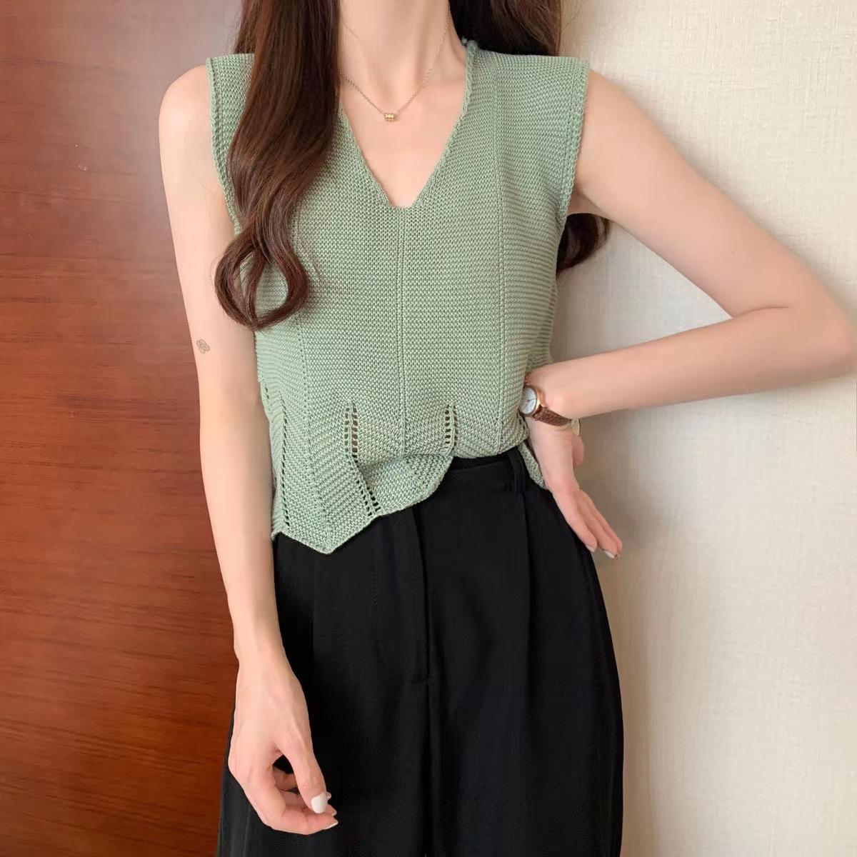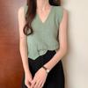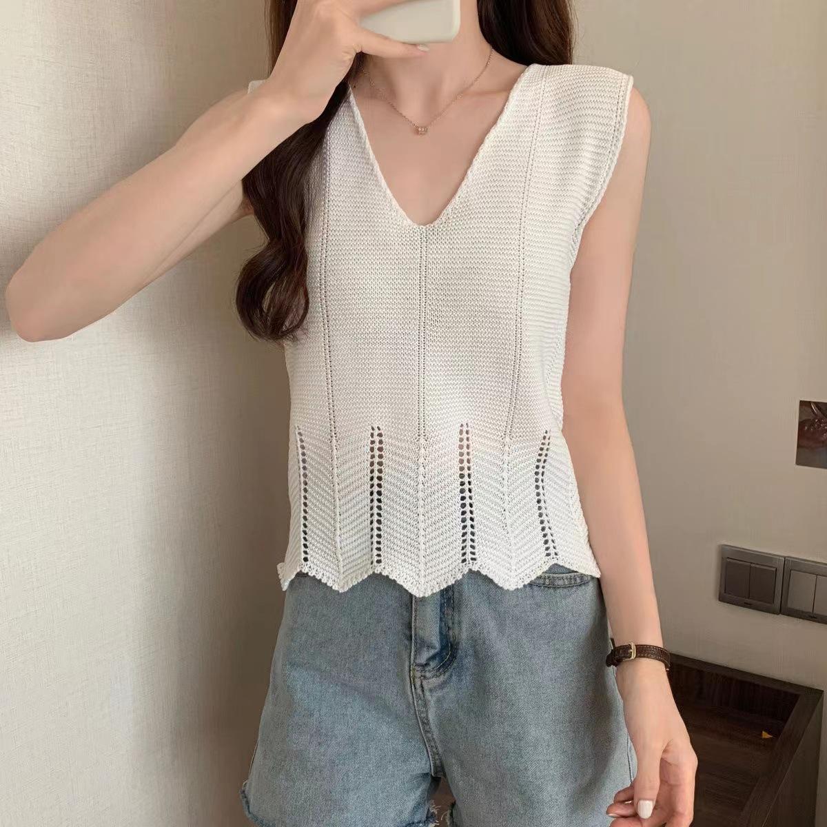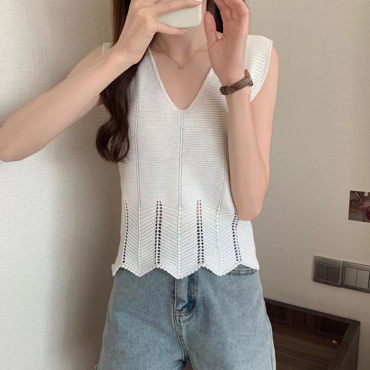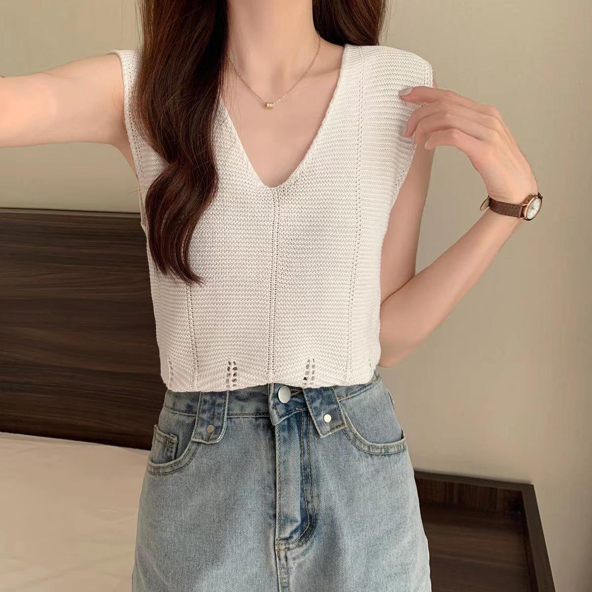 Design Sense Niche Chaleco de punto sin mangas con cuello en V pequeño y fresco para mujer Top sin mangas ajustado con agujeros de verano para mujer