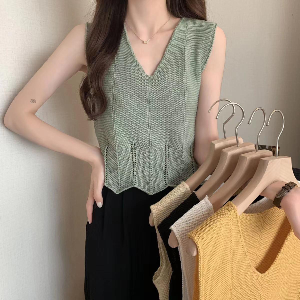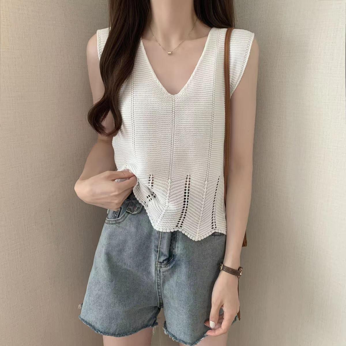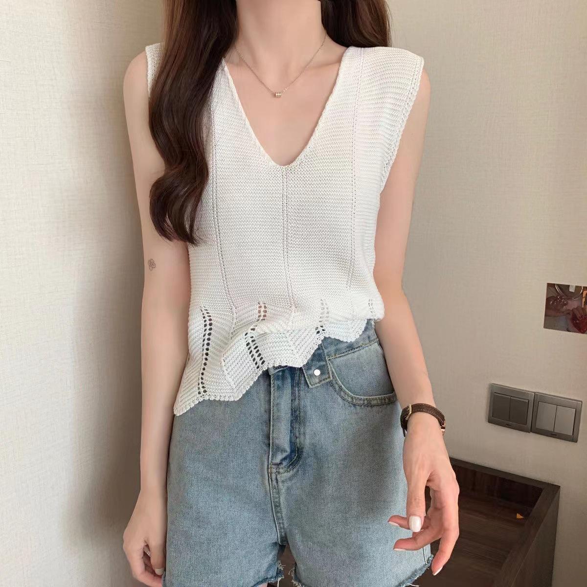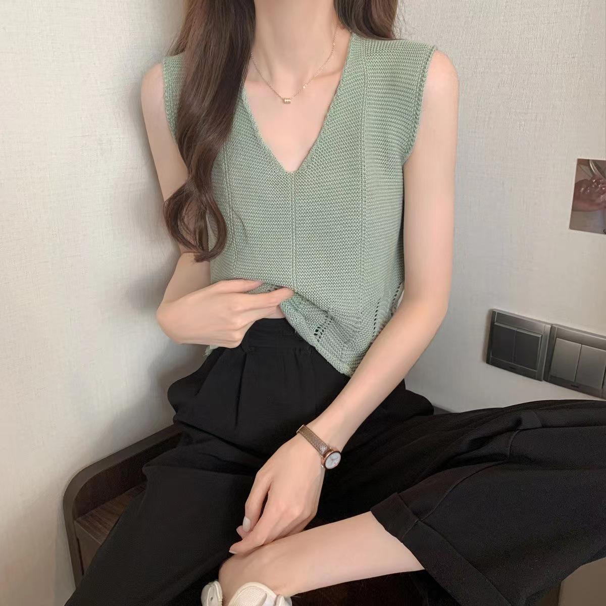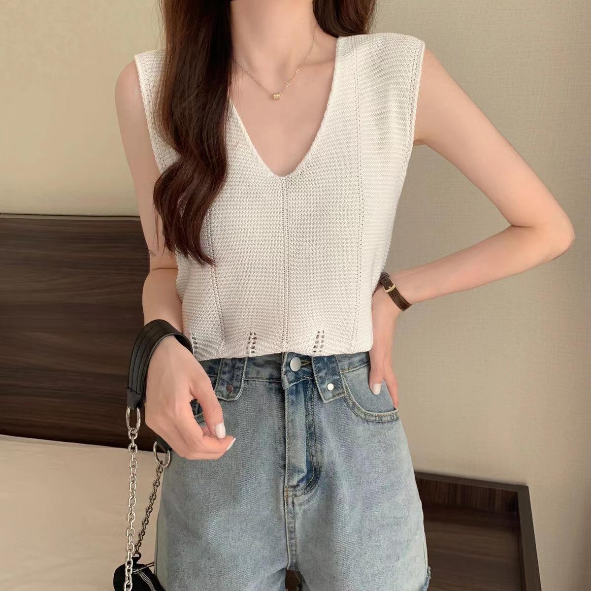 Design Sense Niche Chaleco de punto sin mangas con cuello en V pequeño y fresco para mujer Top sin mangas ajustado con agujeros de verano para mujer