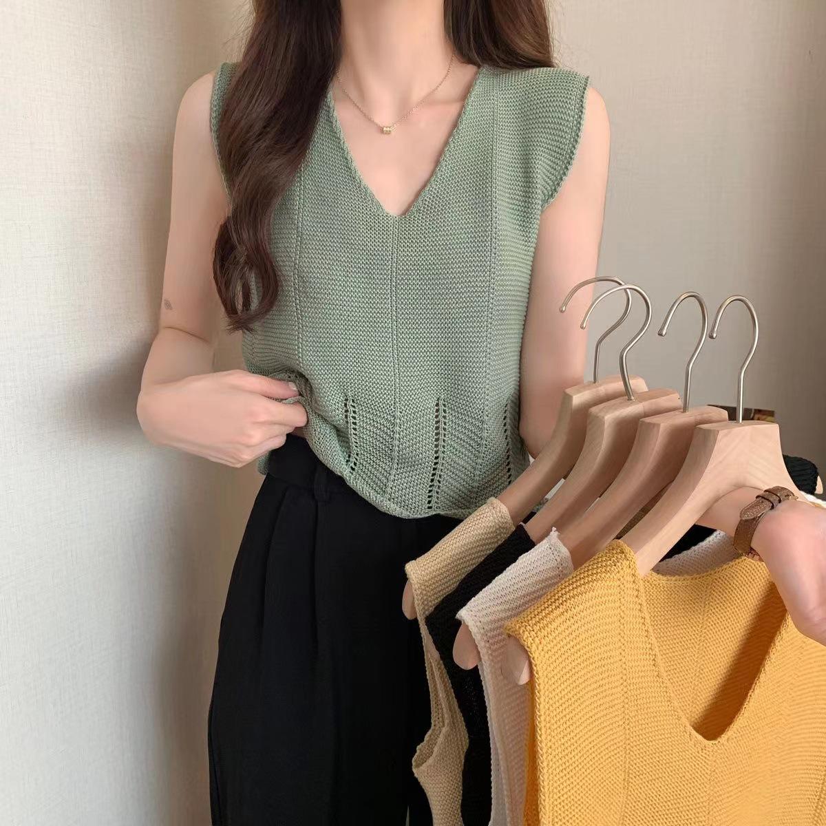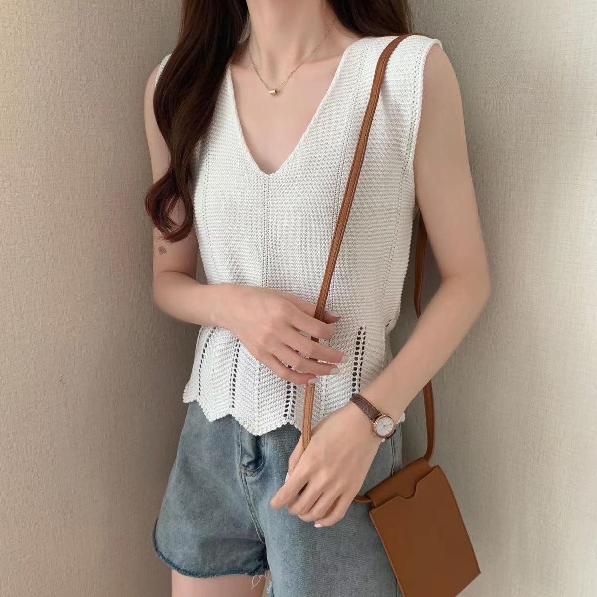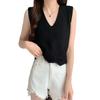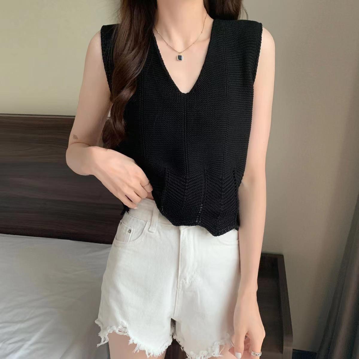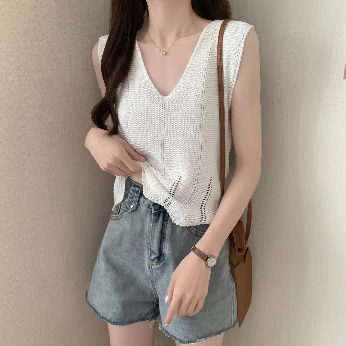 Design Sense Niche Chaleco de punto sin mangas con cuello en V pequeño y fresco para mujer Top sin mangas ajustado con agujeros de verano para mujer