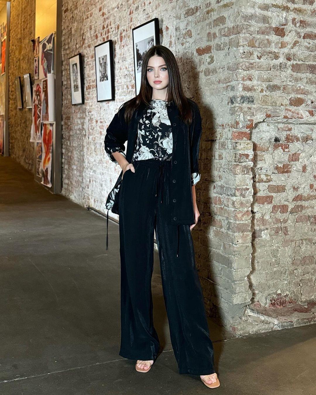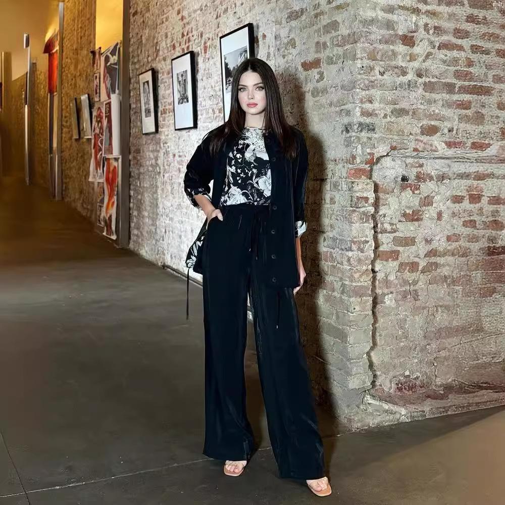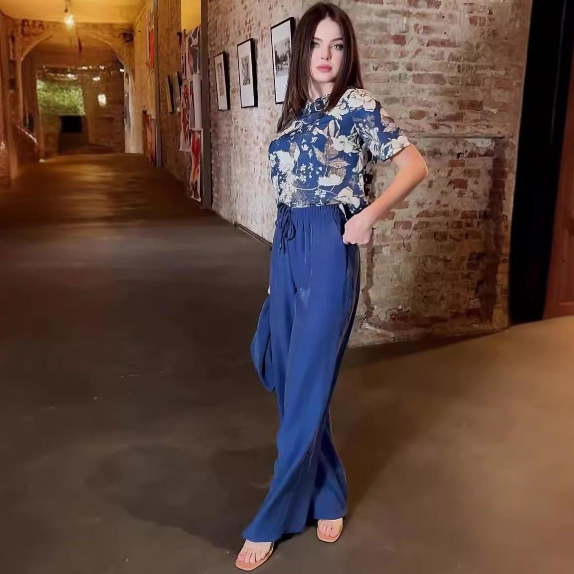 Otoño 2024 Nuevo Europeo y Americano Amazon Transfronterizo Moda para Mujer Cuello Redondo Estampado Primeros Pantalones con Cordón Conjunto Casual