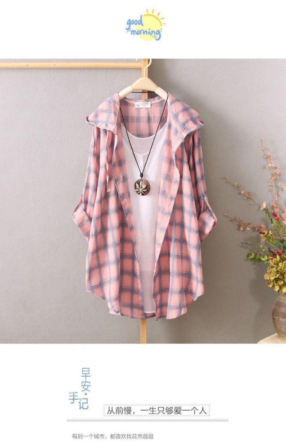 Ropa de protección solar 2 023 nueva camisa de mujer con capucha a cuadros de manga larga suelta versión coreana del abrigo cárdigan fino Joker