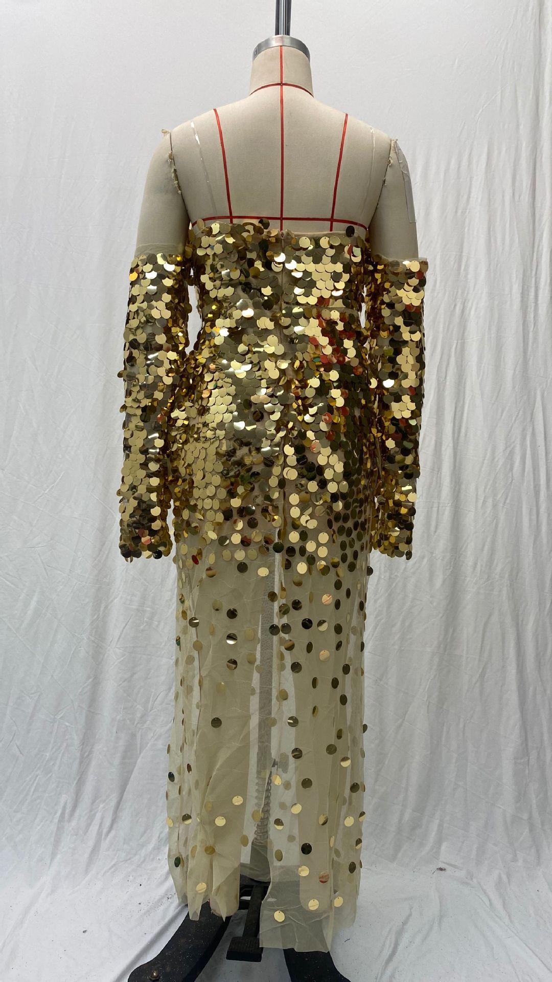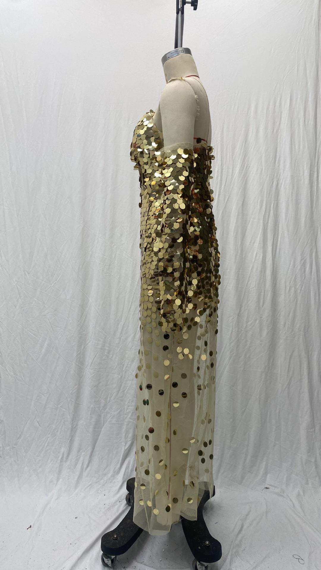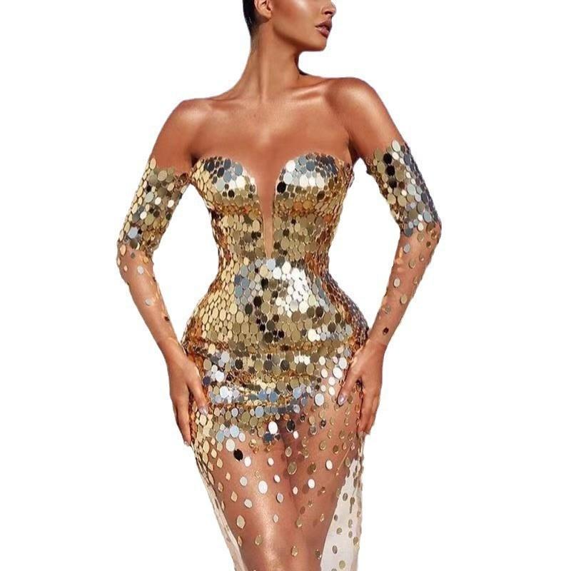 2025 Nuevo Verano Ropa Transfronteriza Europea y Americana Vestido Lentejuelado Un Hombro Sexy Malla Transparente Vestido Largo de Noche
