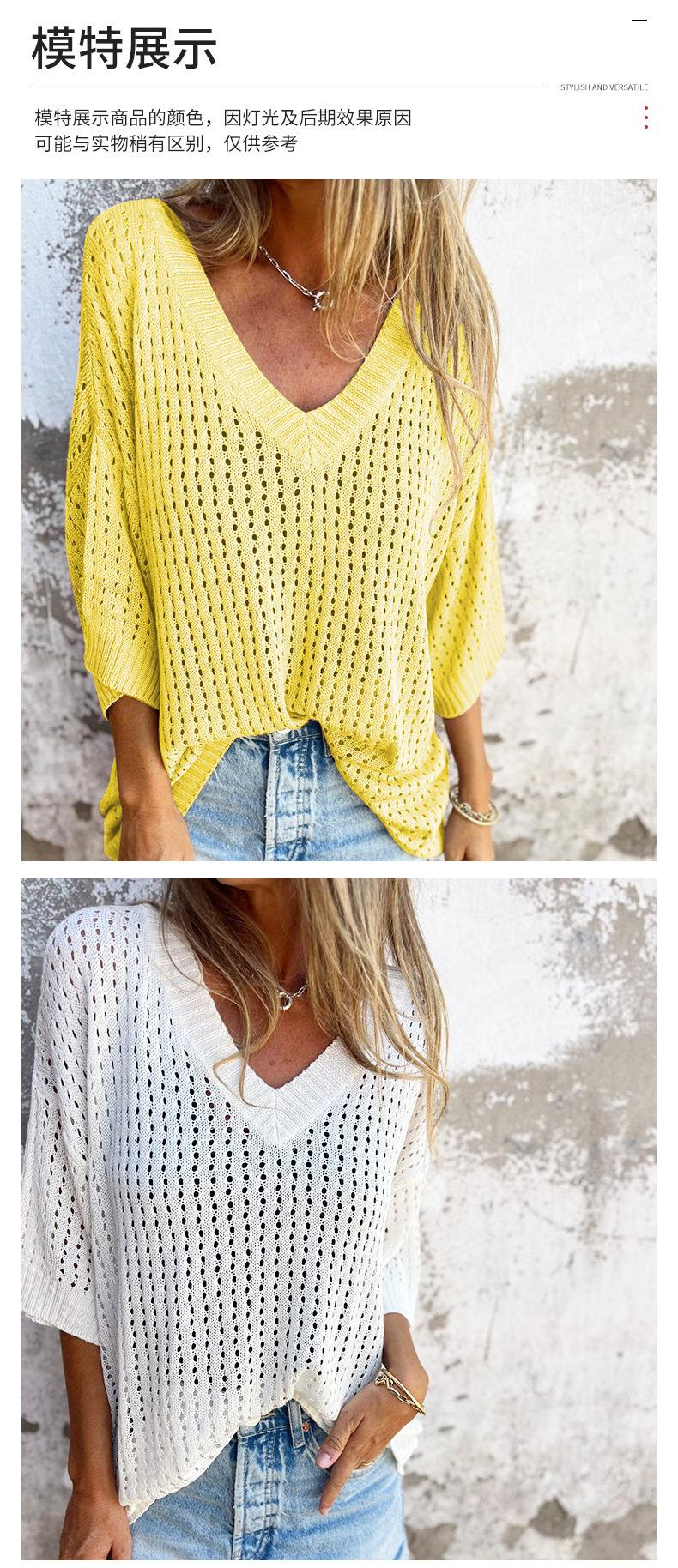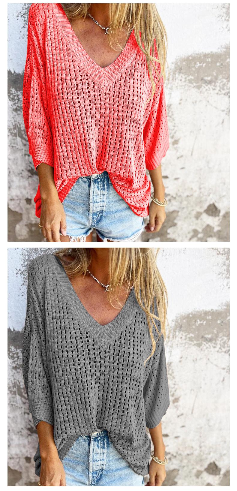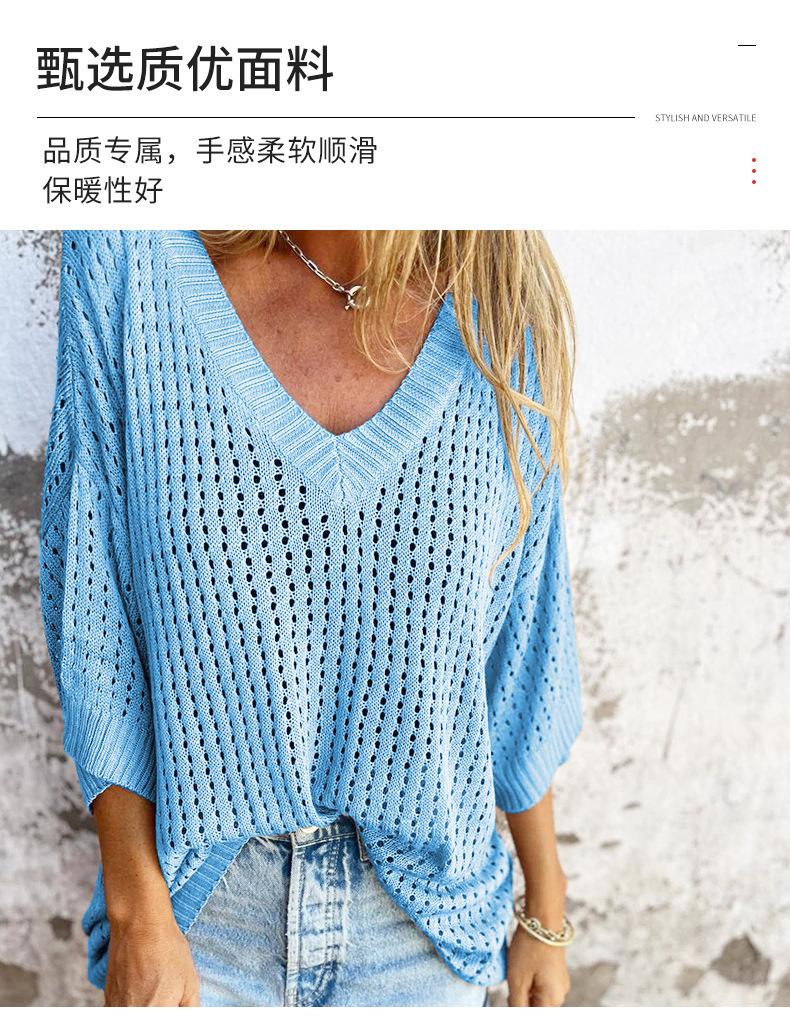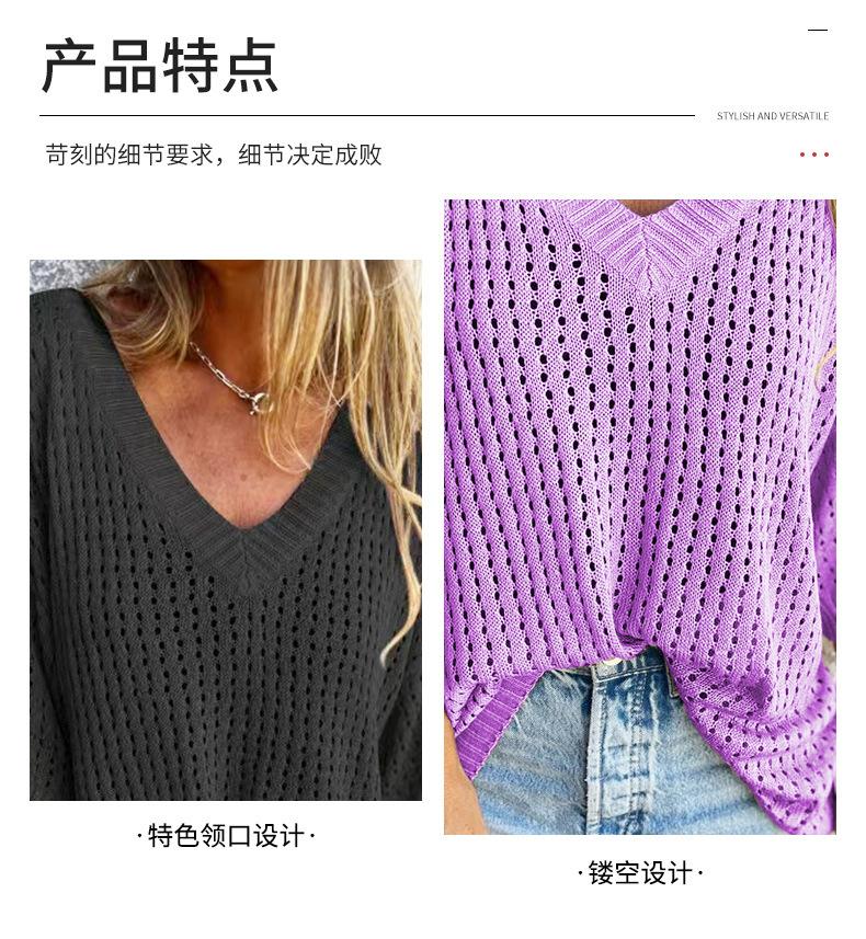 Nueva camiseta exclusiva transfronteriza para mujer, prenda exterior hueca, diseño de punto de manga larga estilo montañero perezoso, suéter de punto anti-enganches con cuello en V