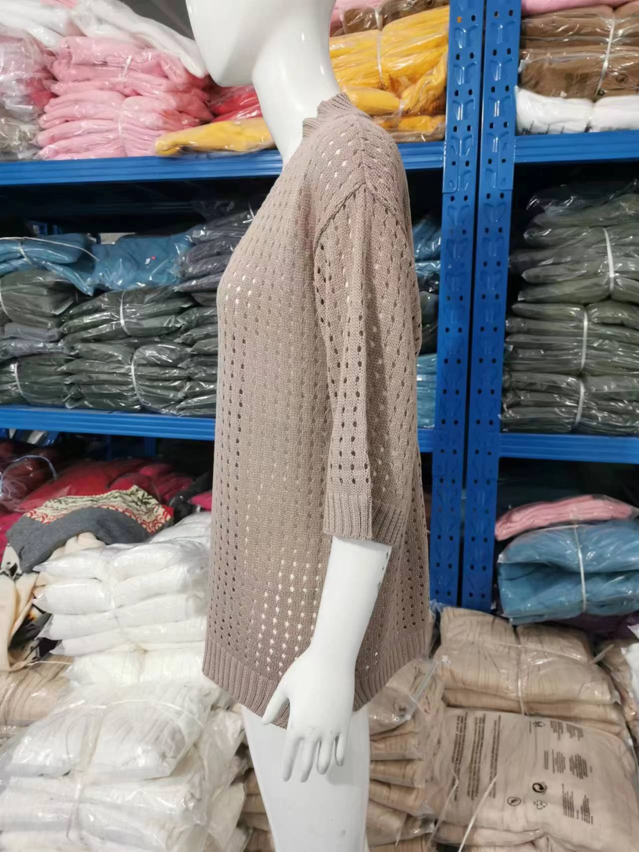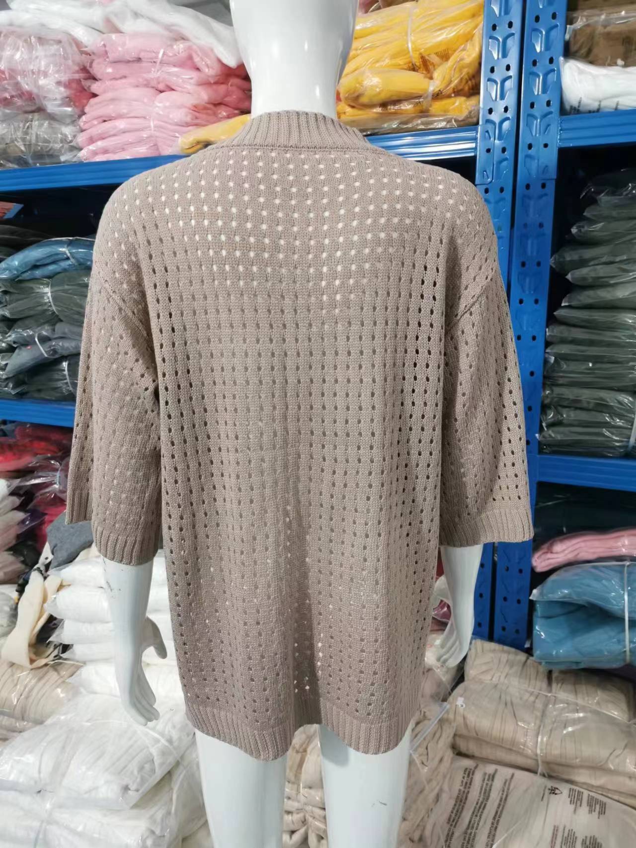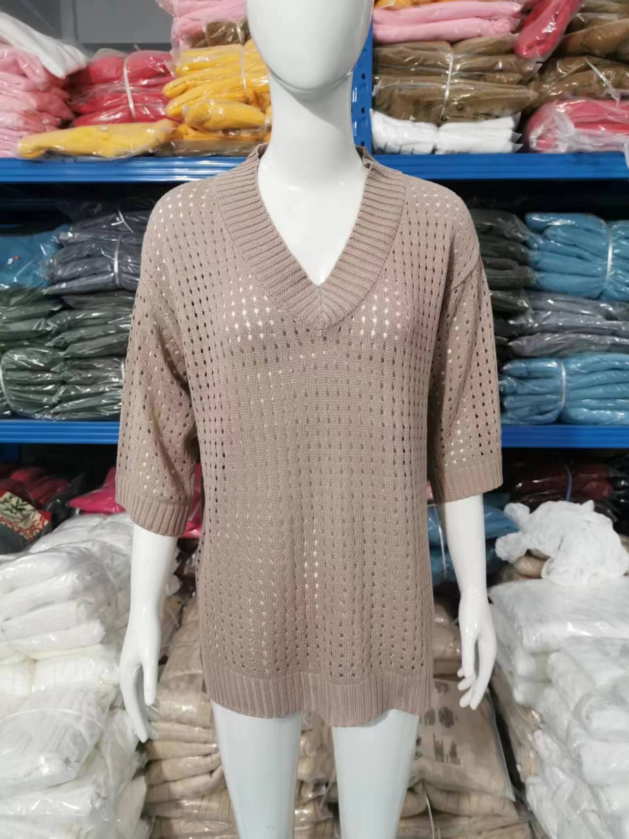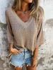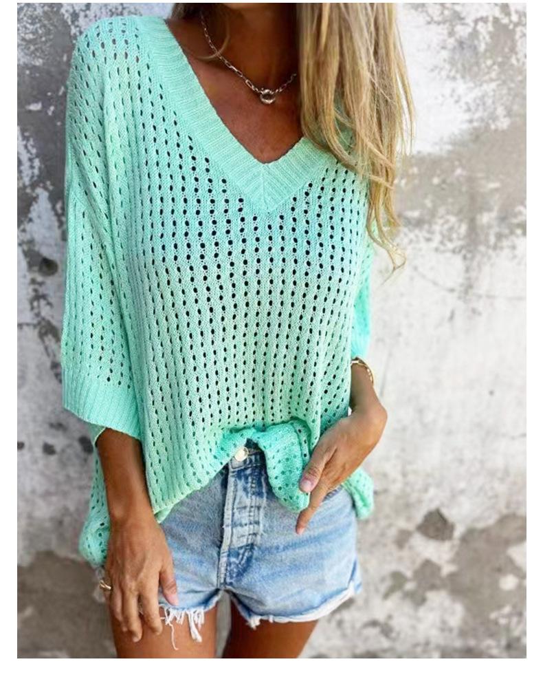 Nueva camiseta exclusiva transfronteriza para mujer, prenda exterior hueca, diseño de punto de manga larga estilo montañero perezoso, suéter de punto anti-enganches con cuello en V