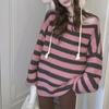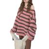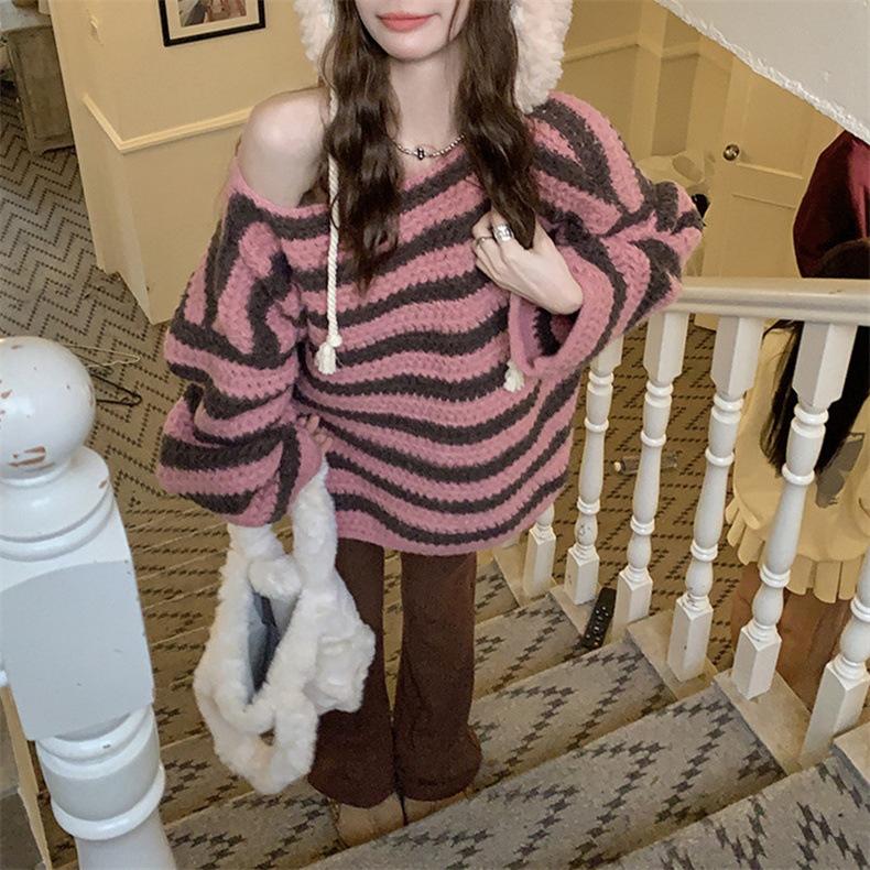 2023 Nuevo Otoño e Invierno Rayas Retro Cuello de un Hombro Tejido de Punto Estilo Holgado y Relajado Reductor de Edad Suéter Tejido Versátil para Mujer