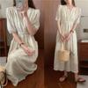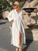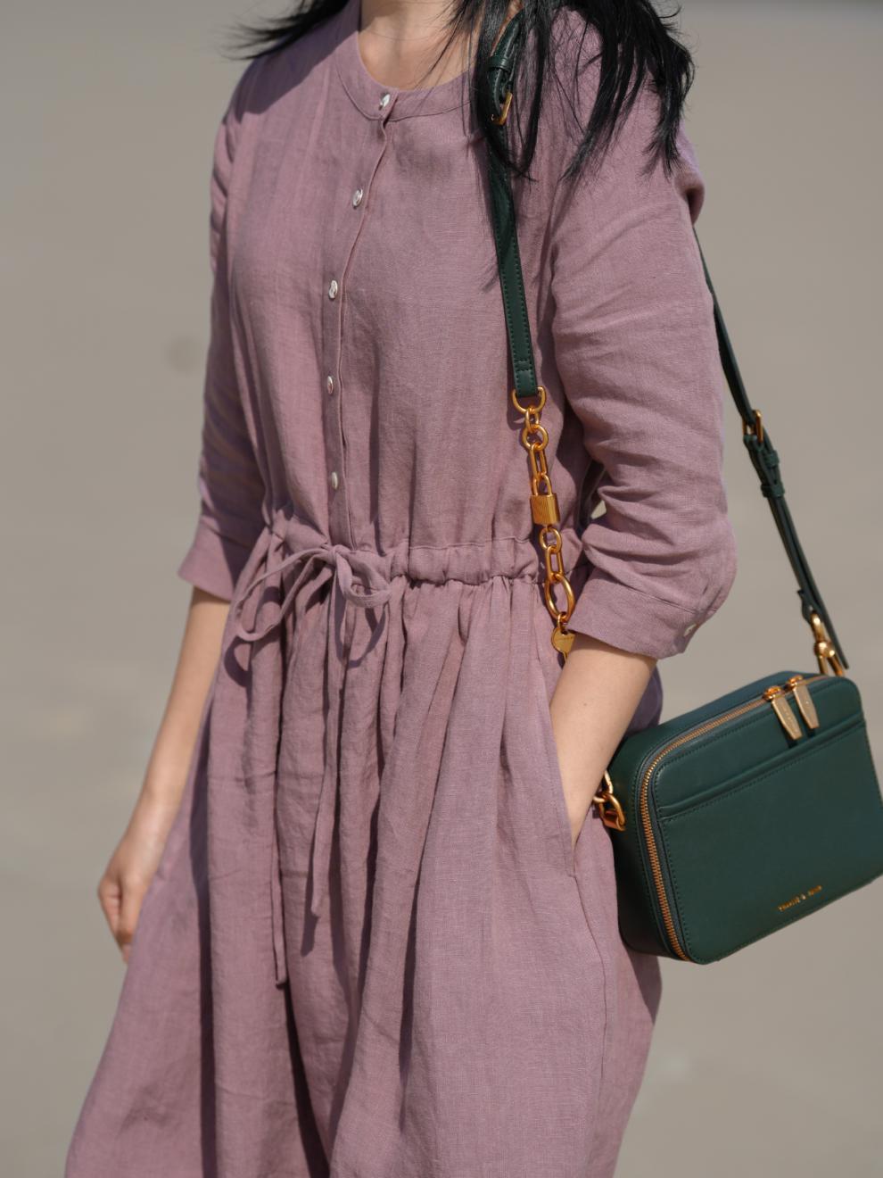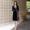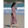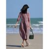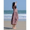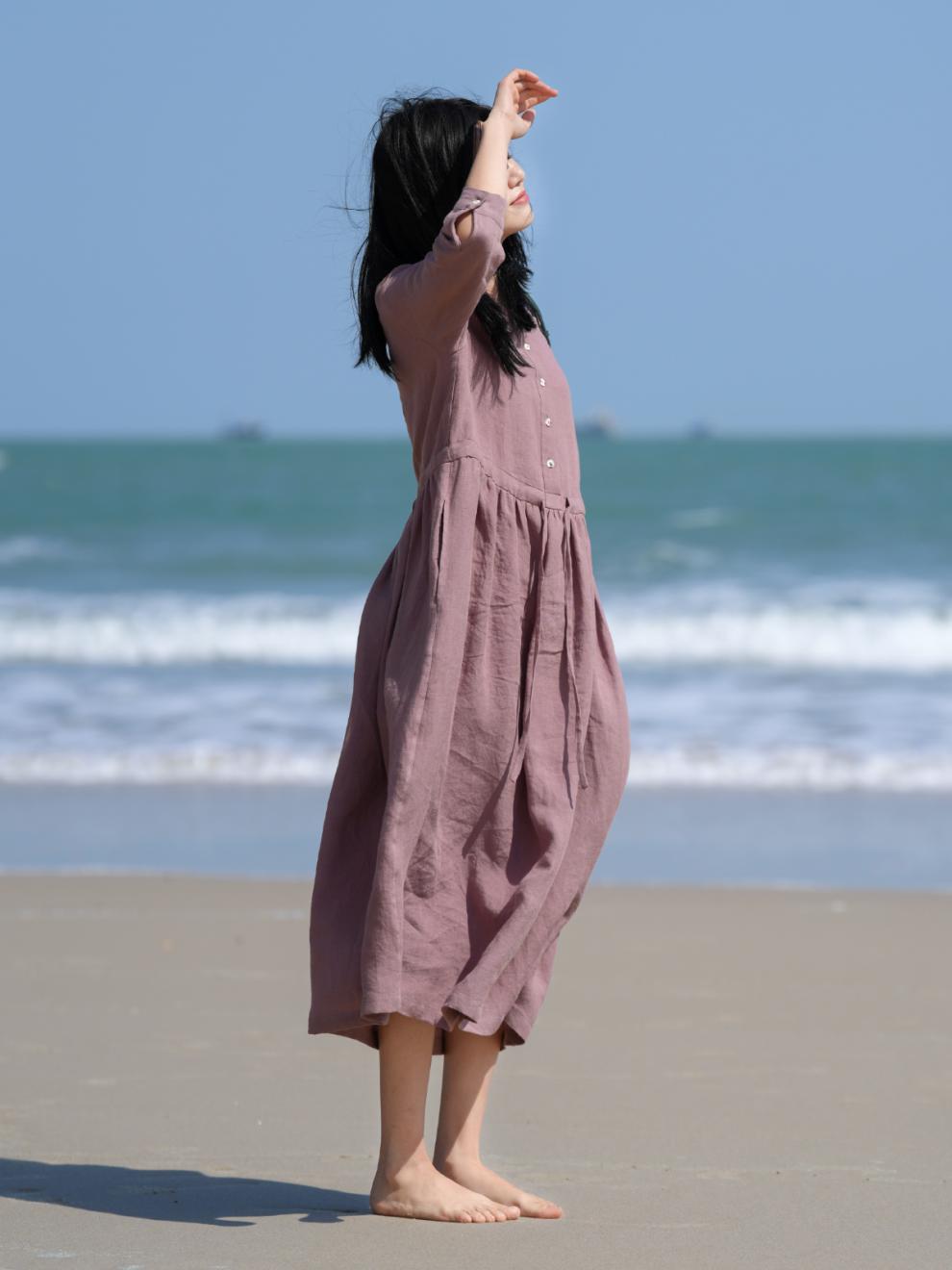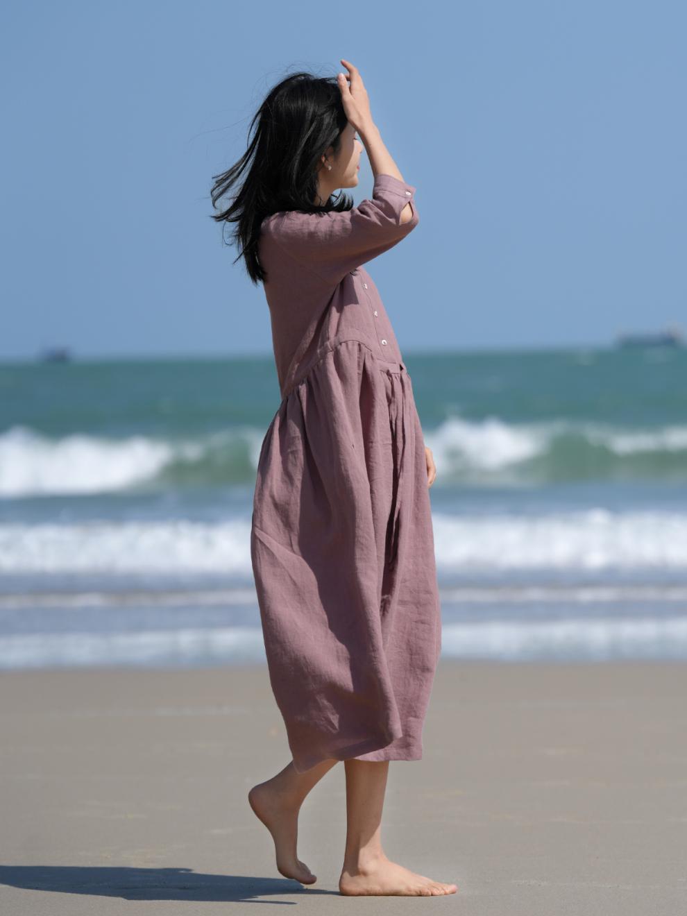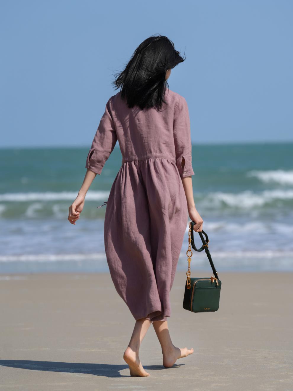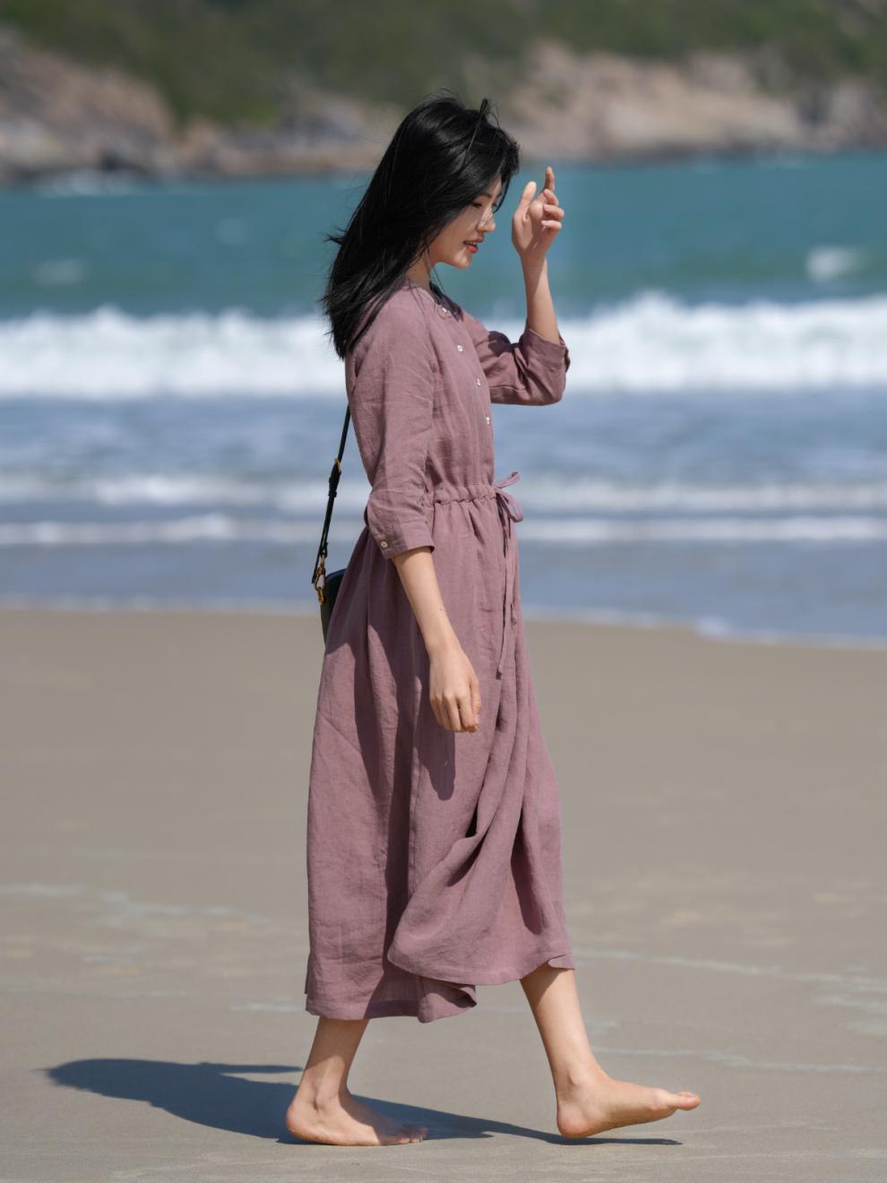 Vestido Nuevo de Primavera y Verano 2023 de Lino Manga Siete Puntos Artístico Adelgazante con Cordones Commuter Simple Mujer